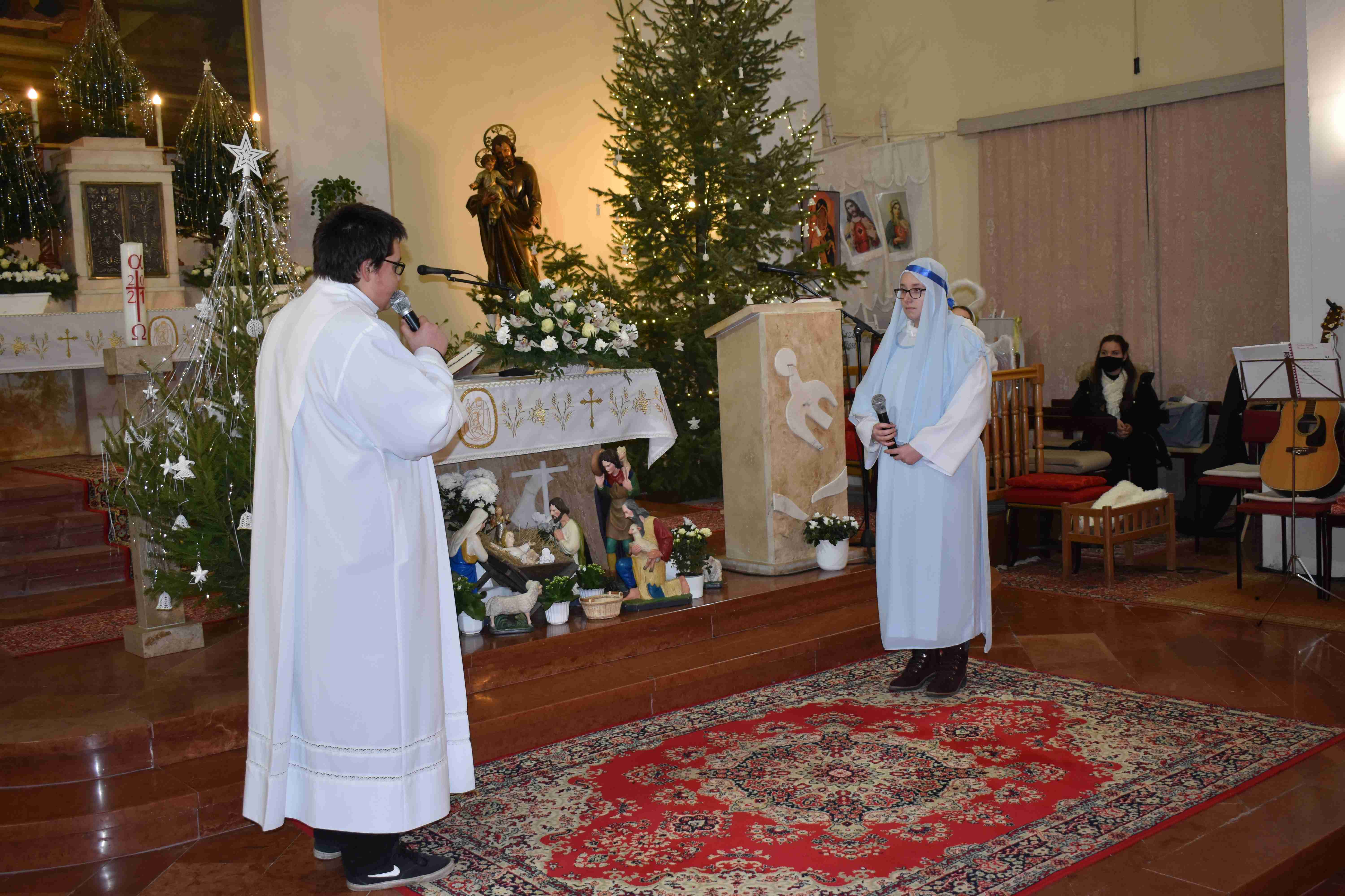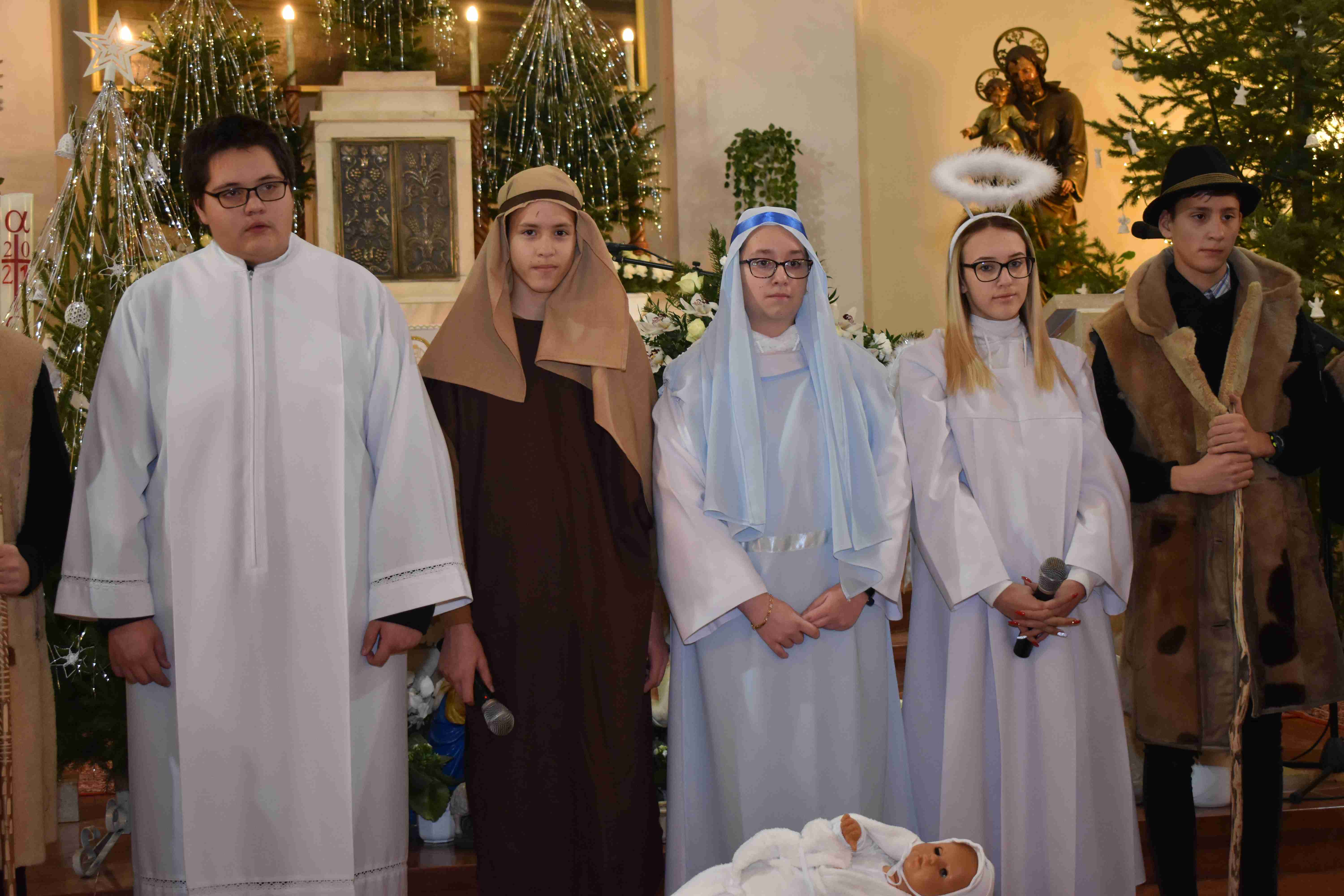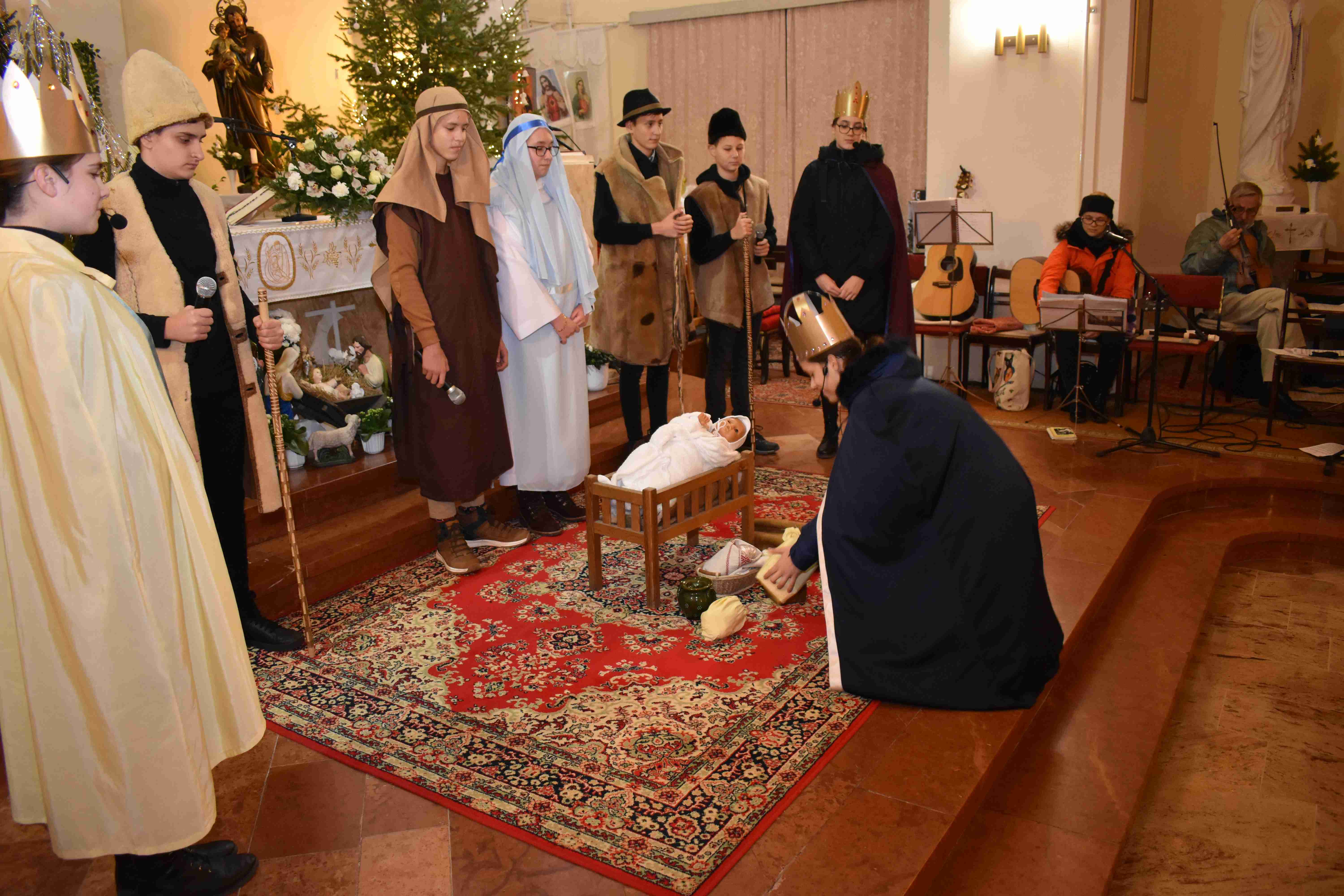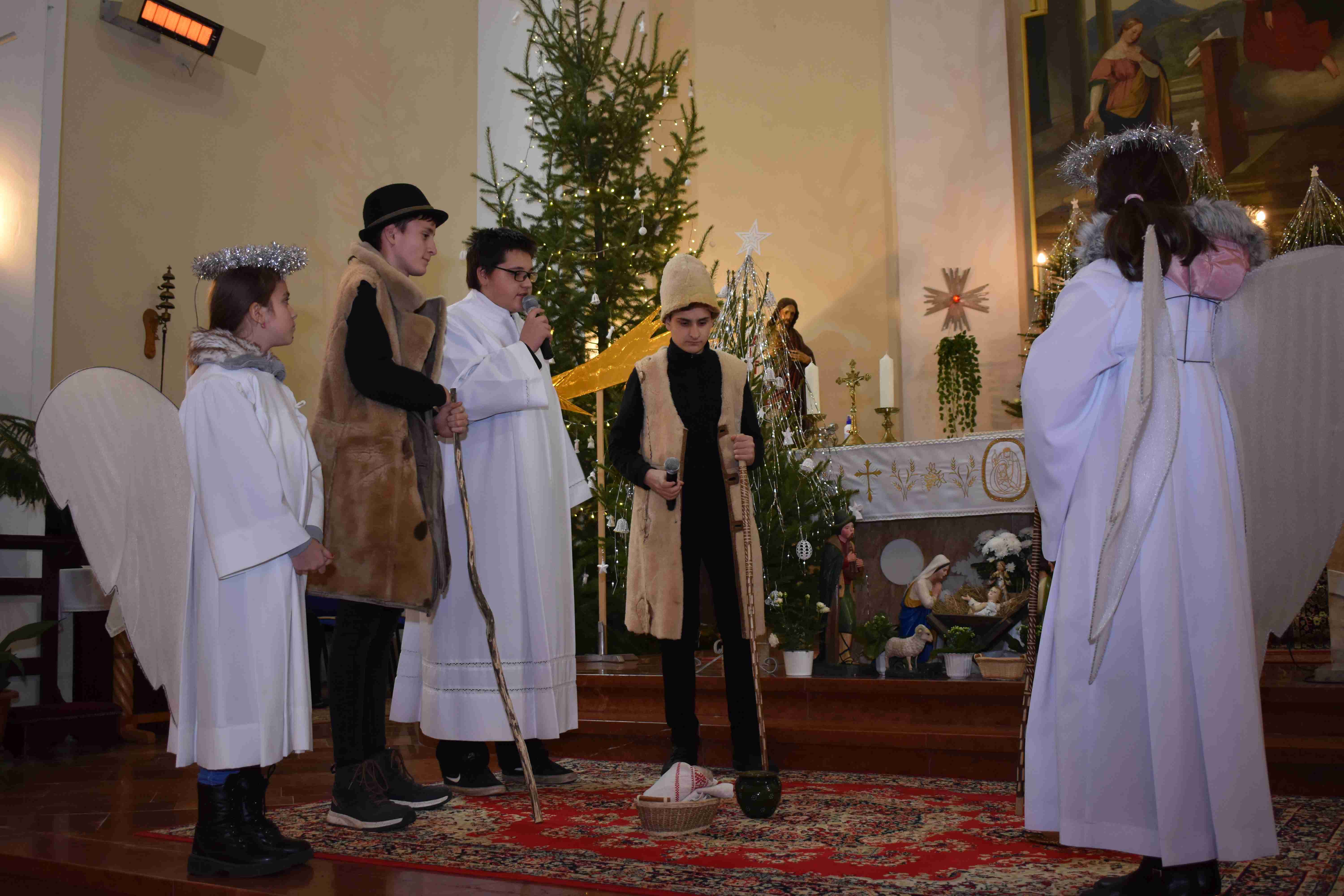 2021. december 24-én, pénteken, Szenteste 23.30 órakor, a Noszlopy iskola 15 hittanos tanulójának pásztorjátékával kezdődött a karácsonyi ünnepség a Gyümölcsoltó Boldogasszony plébániatemplomban.