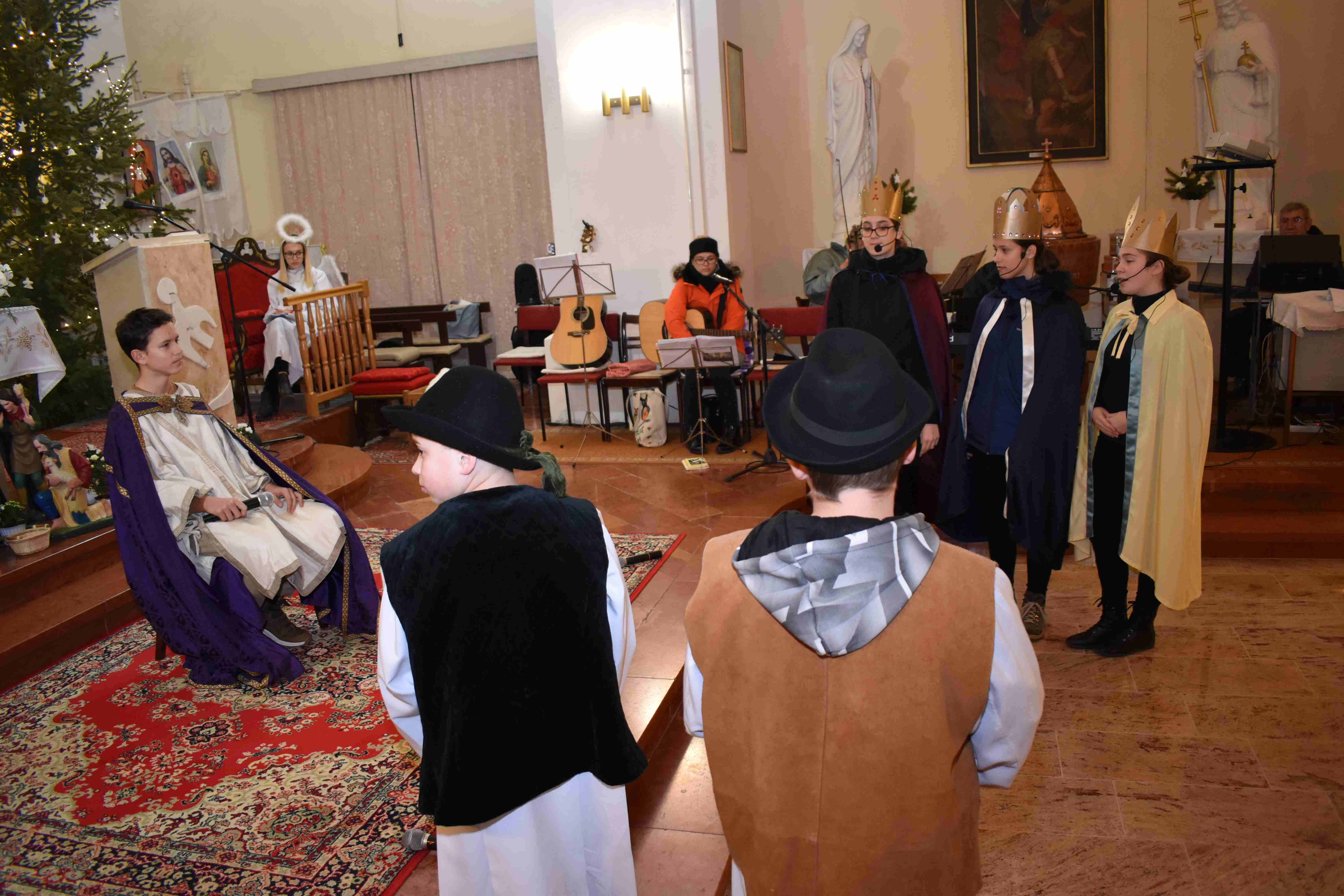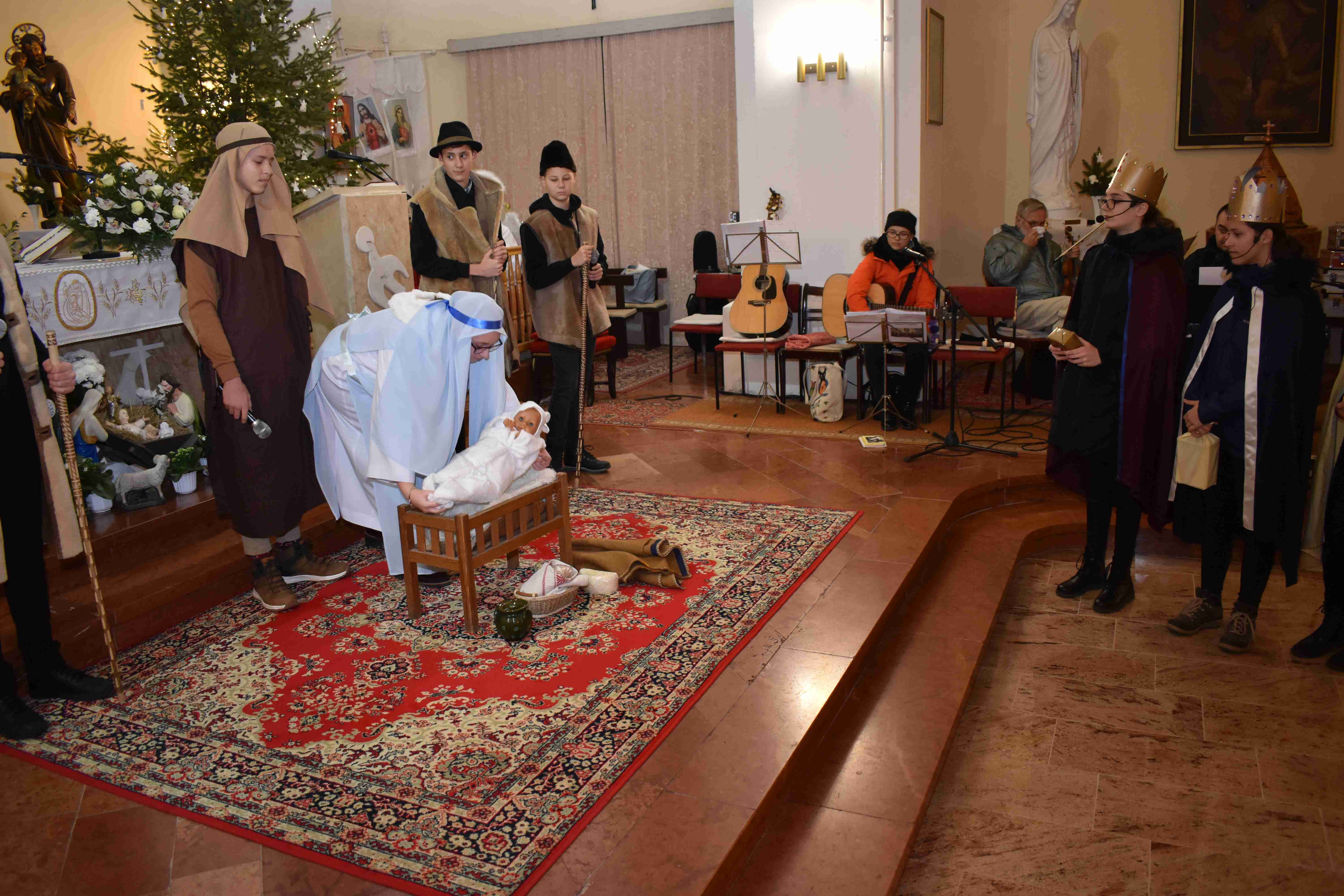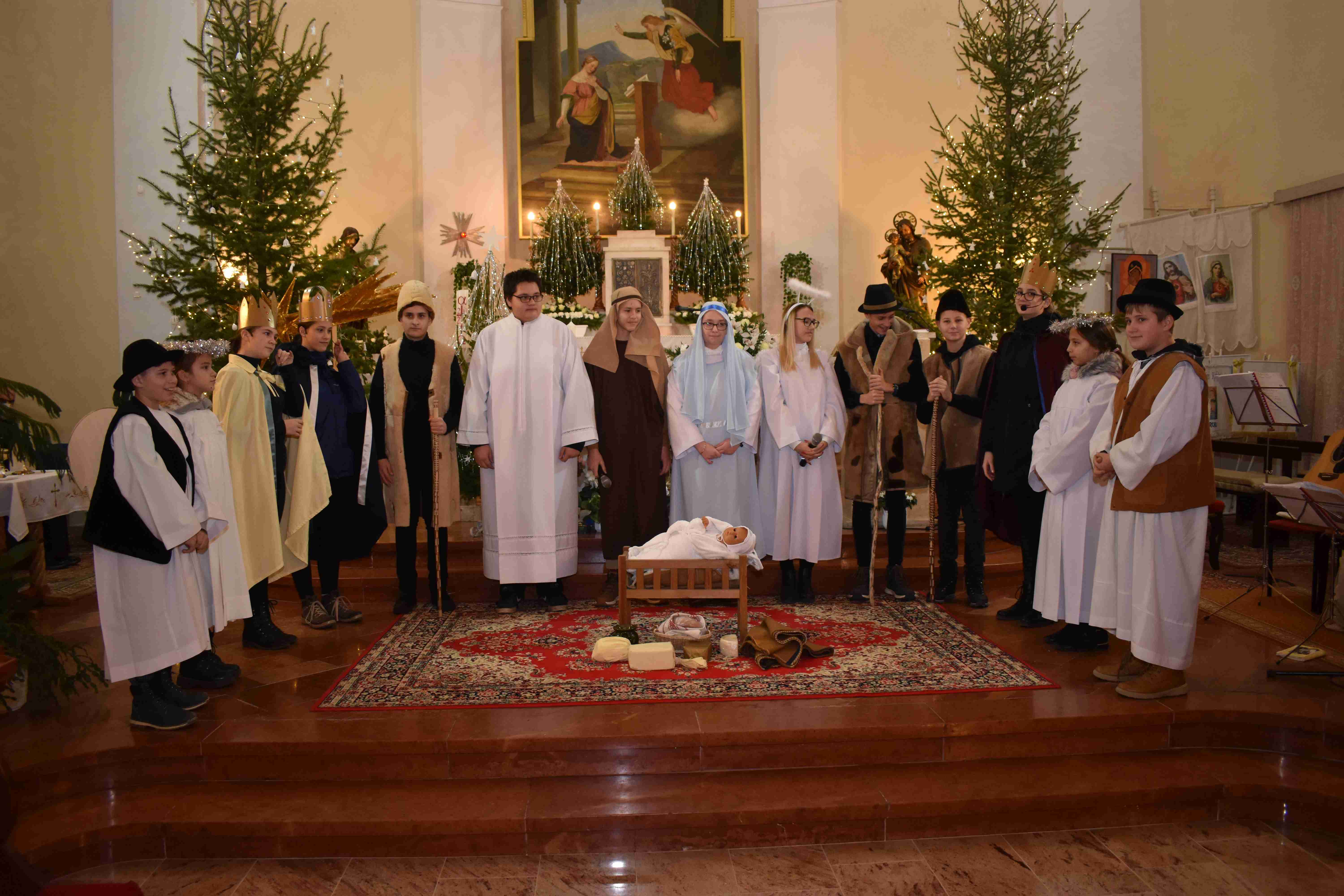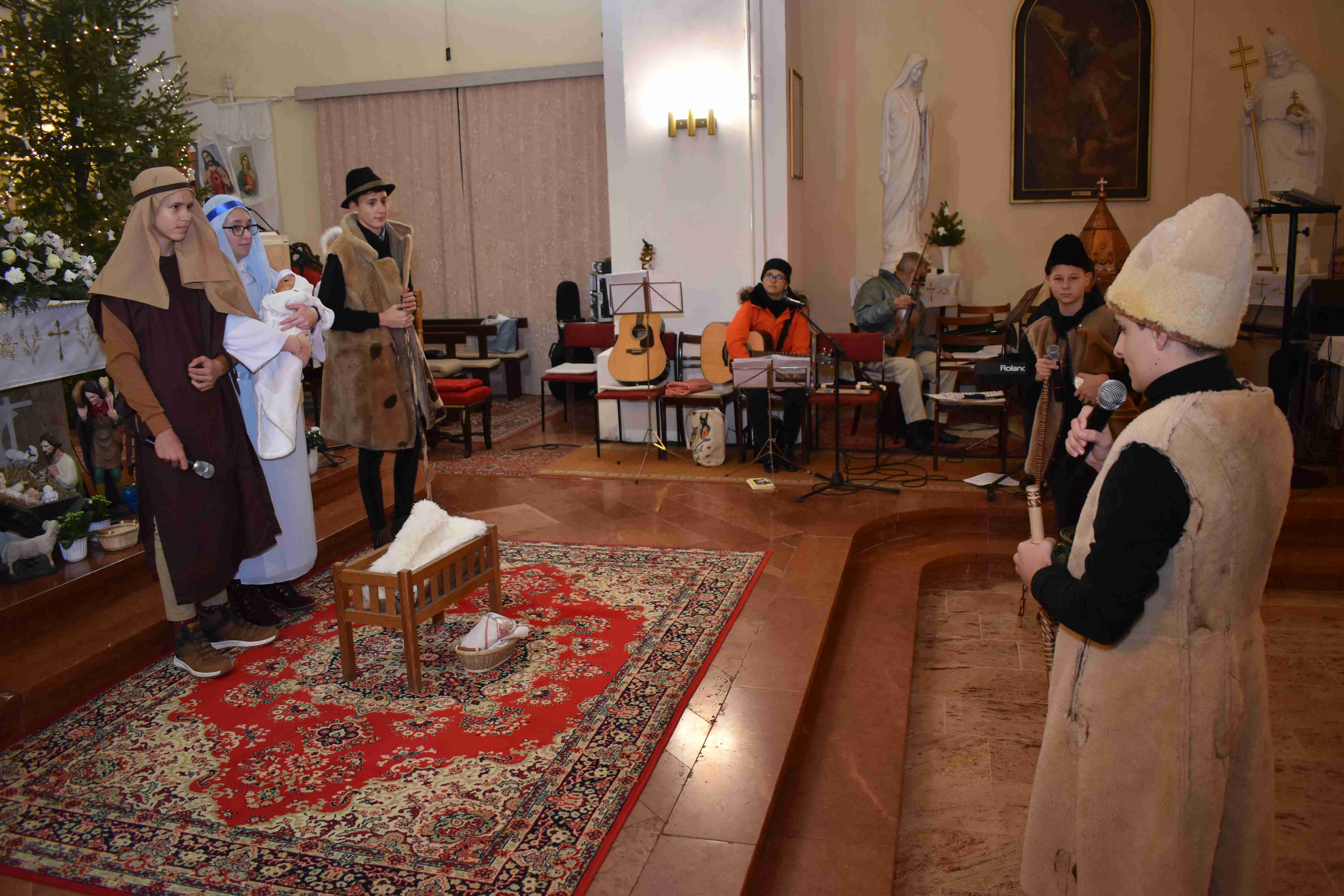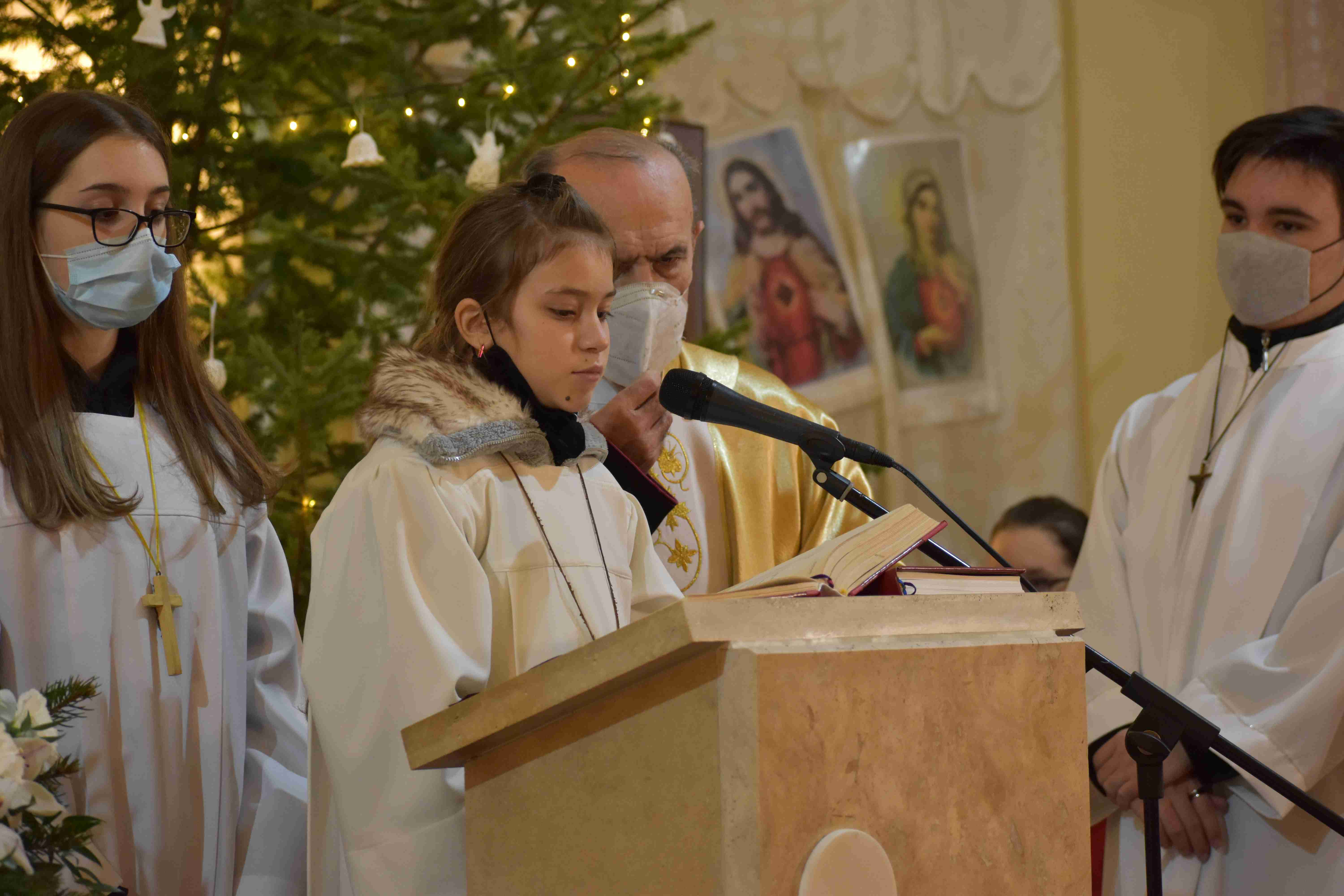 2021. december 24-én, pénteken, Szenteste 23.30 órakor, a Noszlopy iskola 15 hittanos tanulójának pásztorjátékával kezdődött a karácsonyi ünnepség a Gyümölcsoltó Boldogasszony plébániatemplomban.