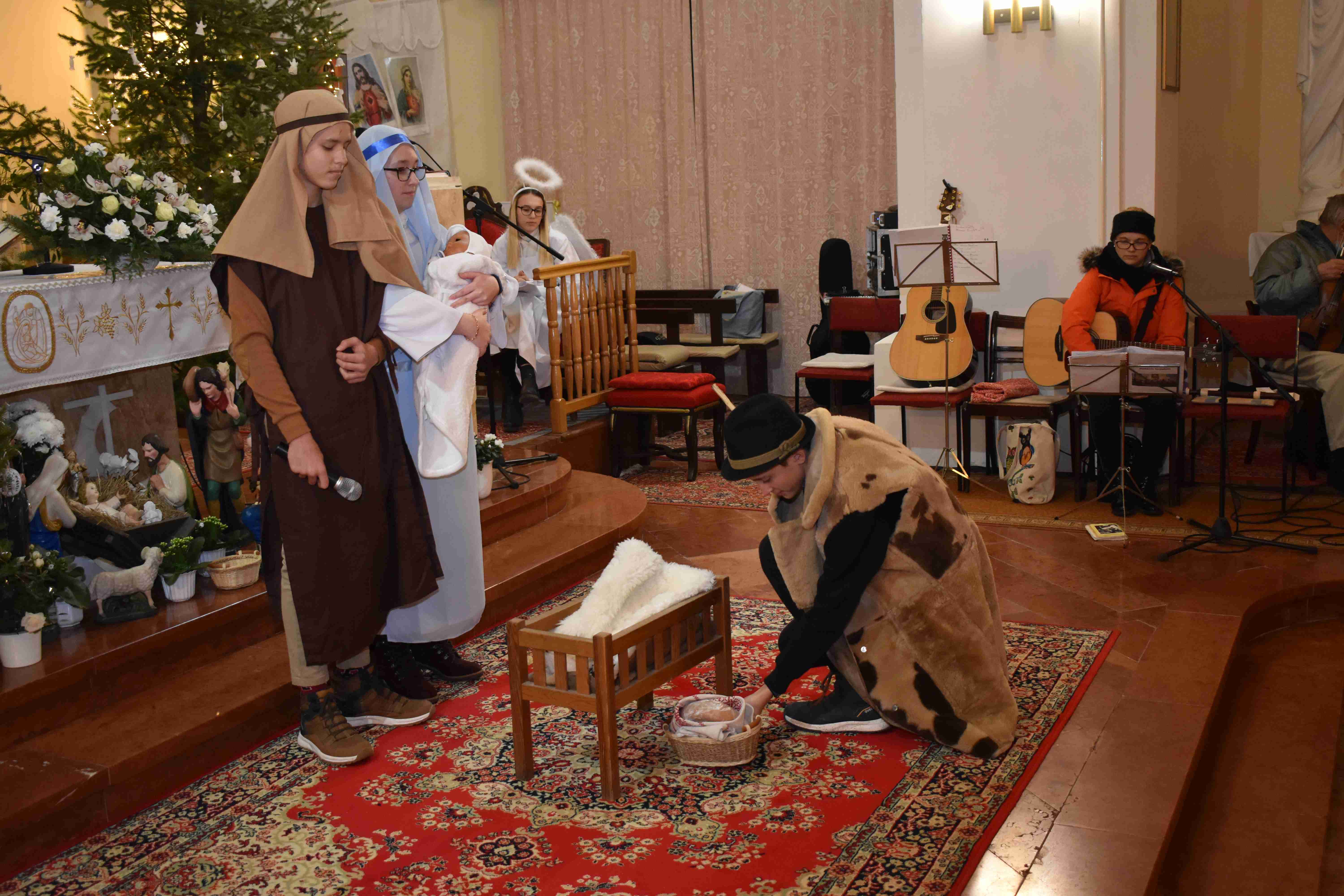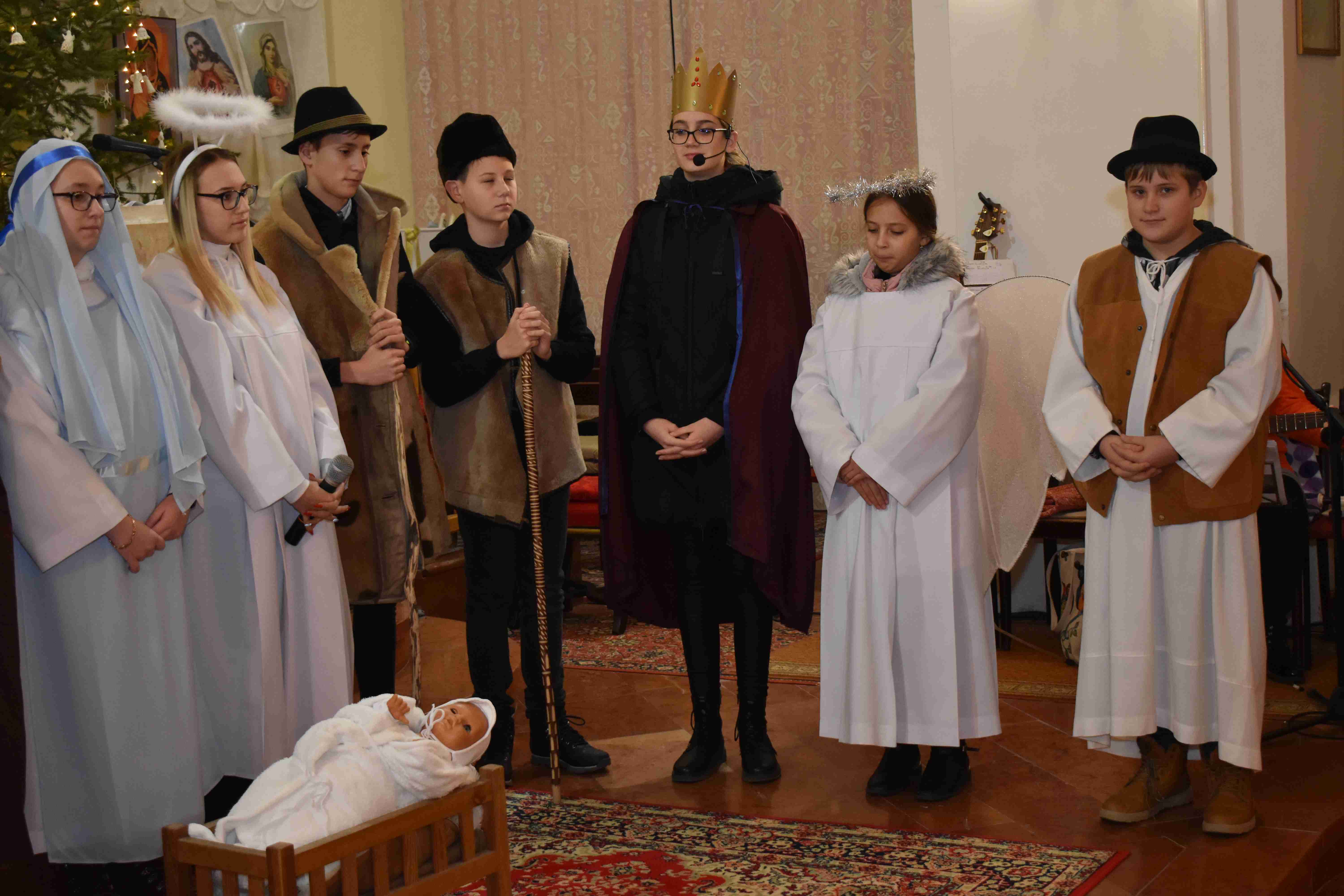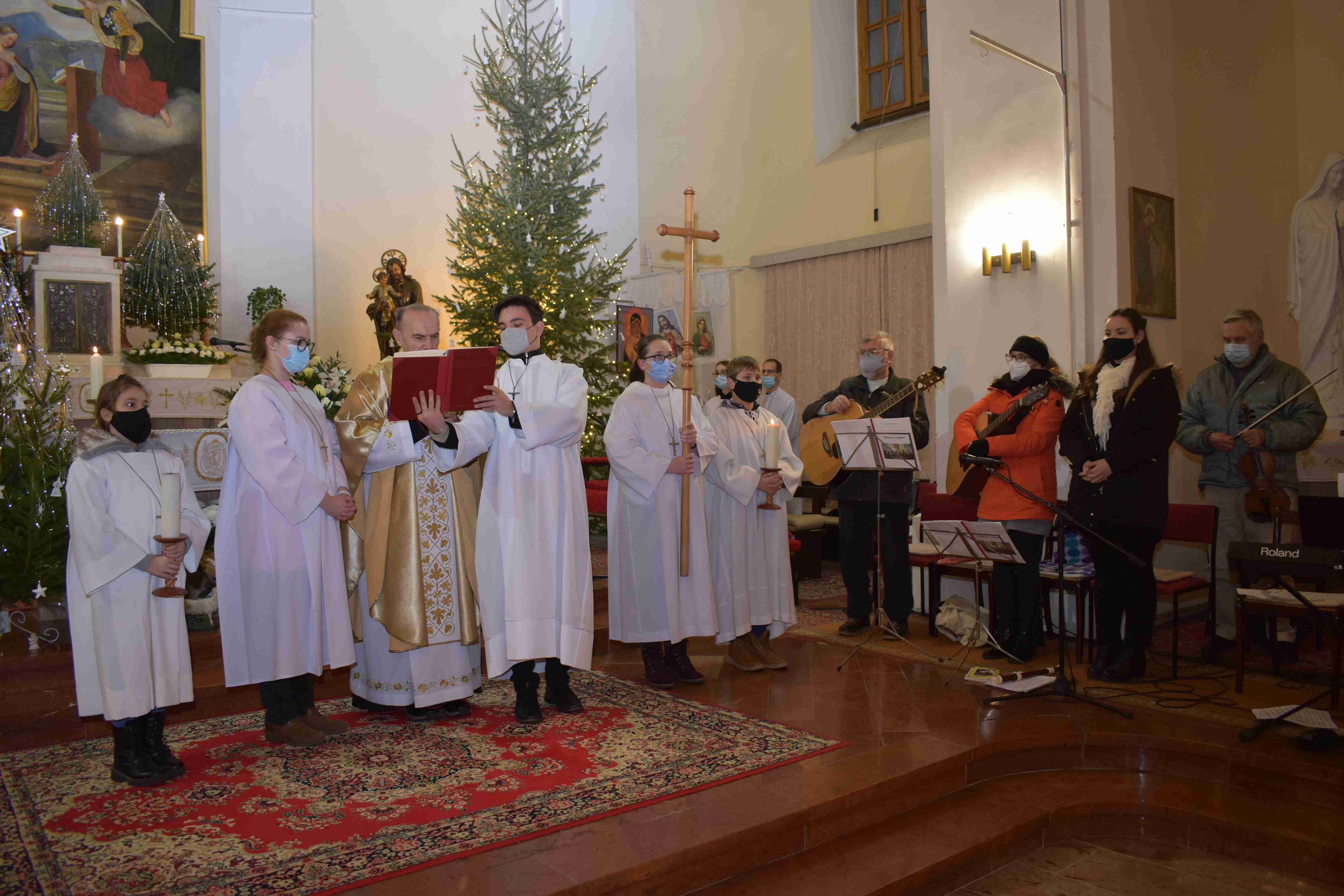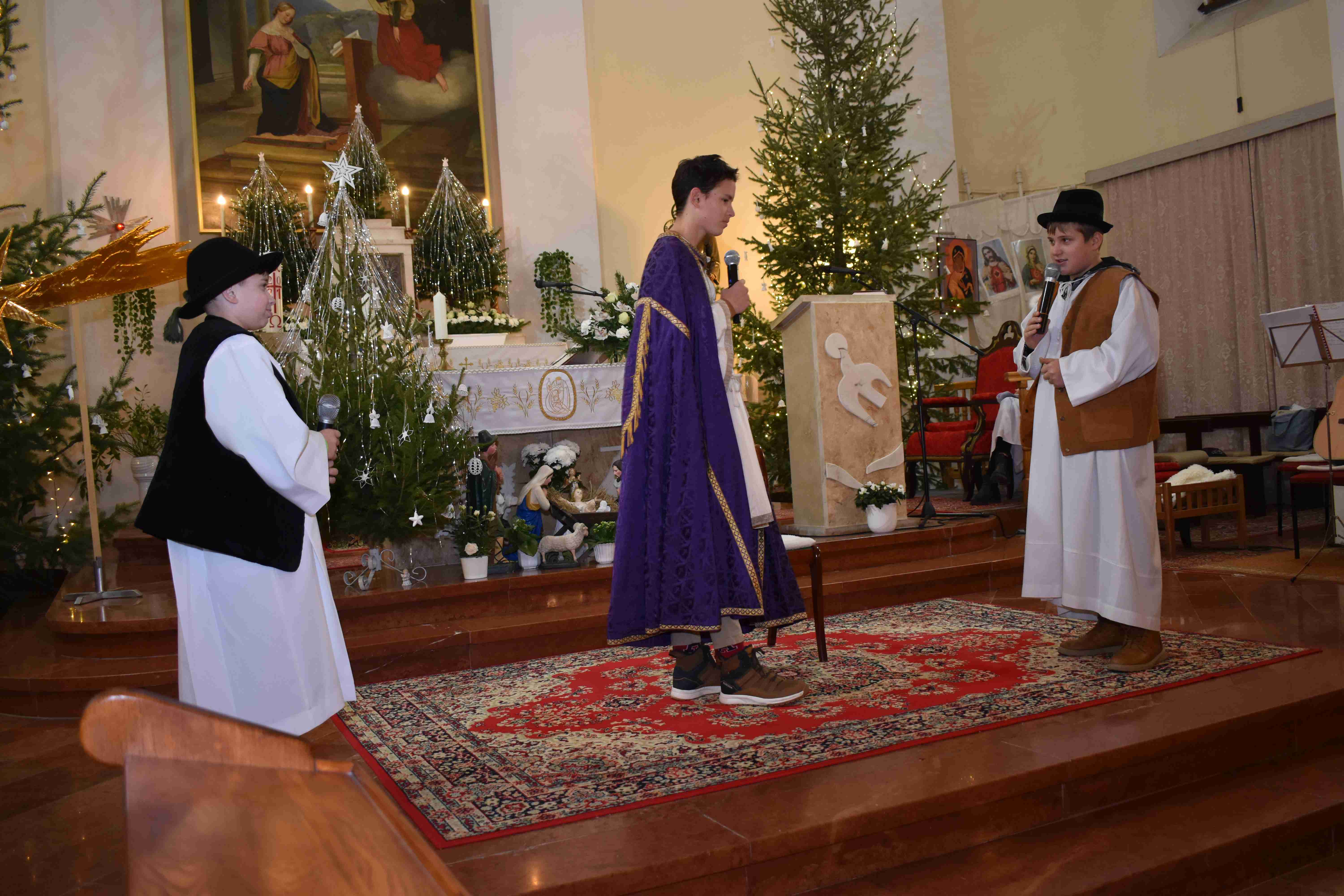 2021. december 24-én, pénteken, Szenteste 23.30 órakor, a Noszlopy iskola 15 hittanos tanulójának pásztorjátékával kezdődött a karácsonyi ünnepség a Gyümölcsoltó Boldogasszony plébániatemplomban.