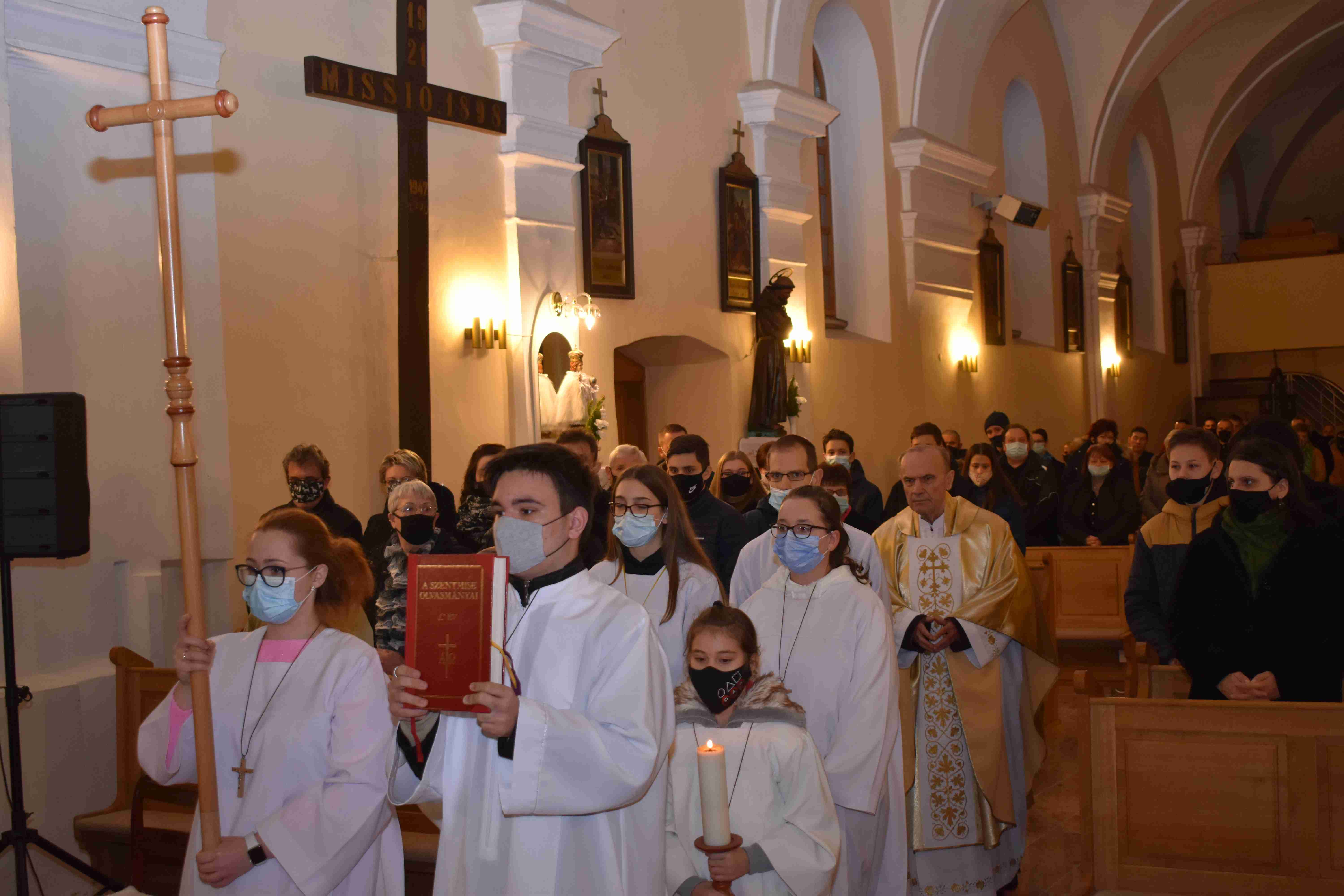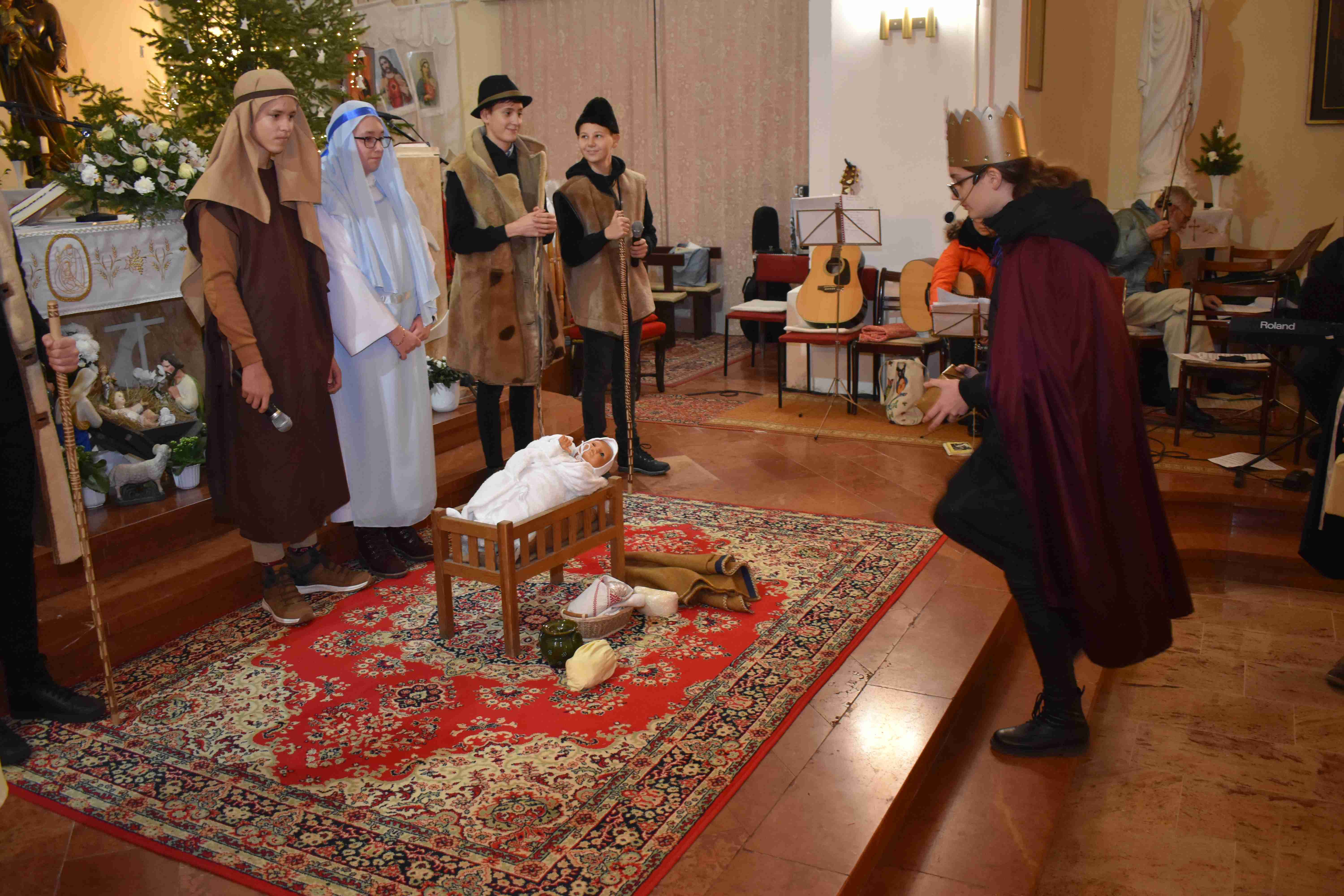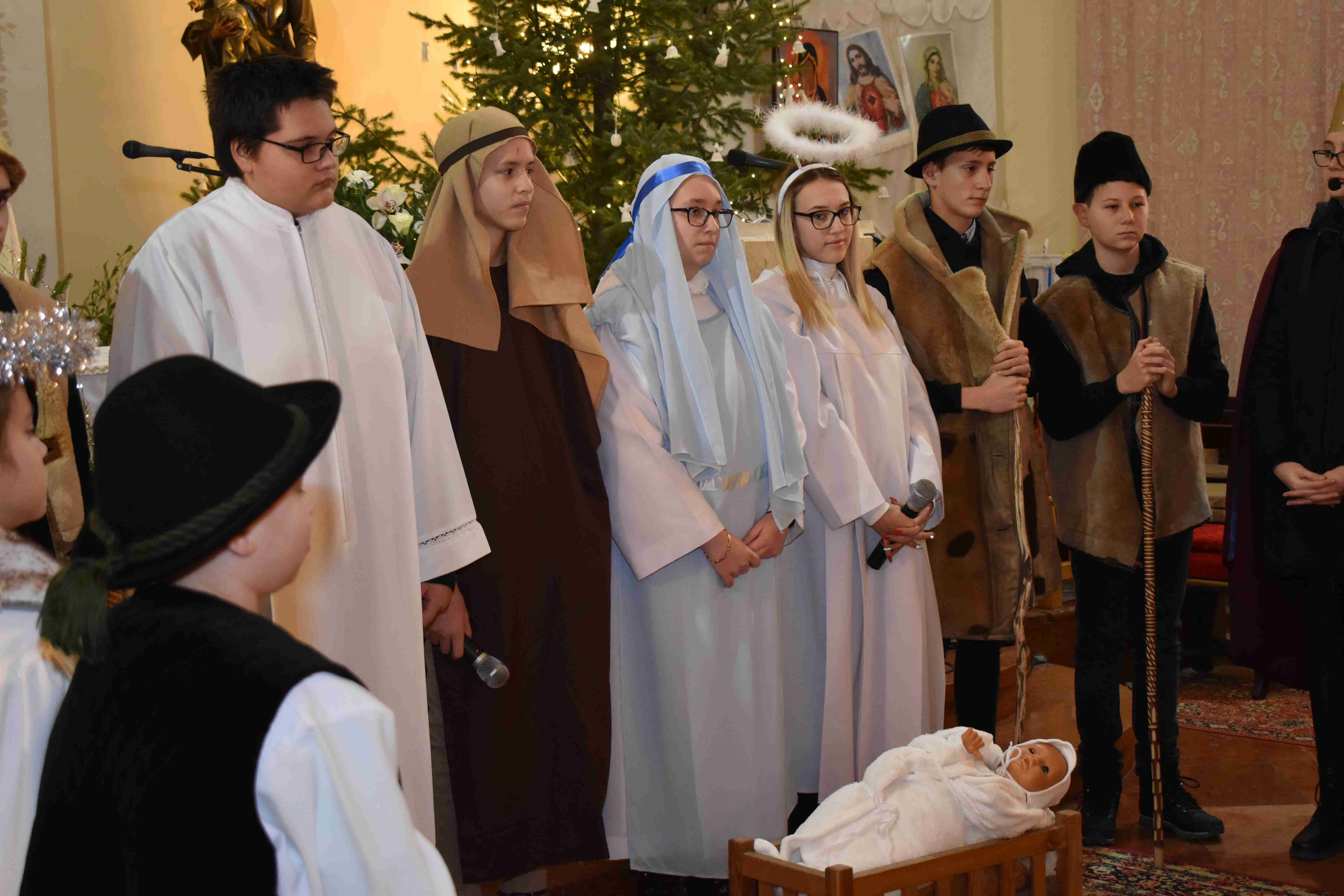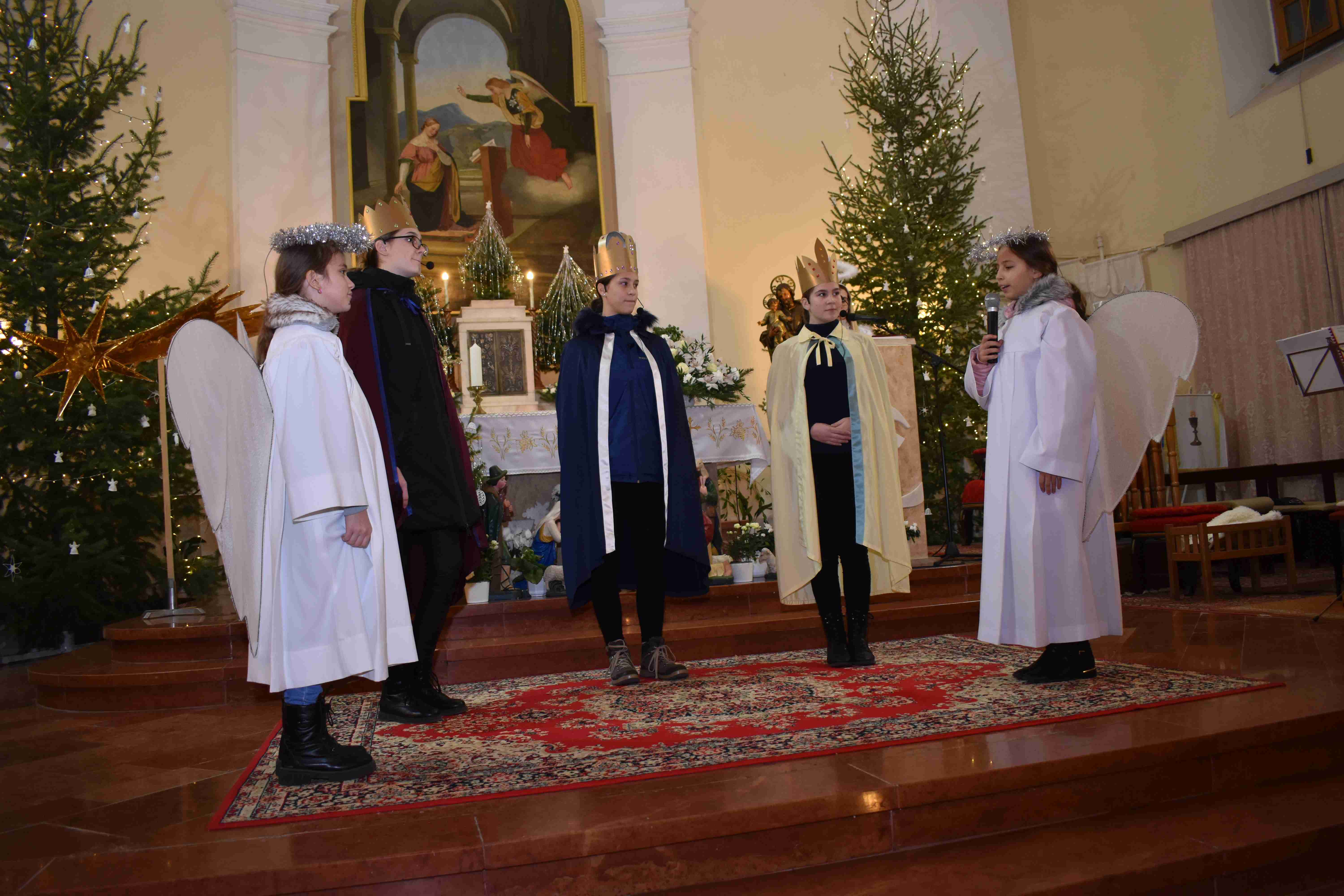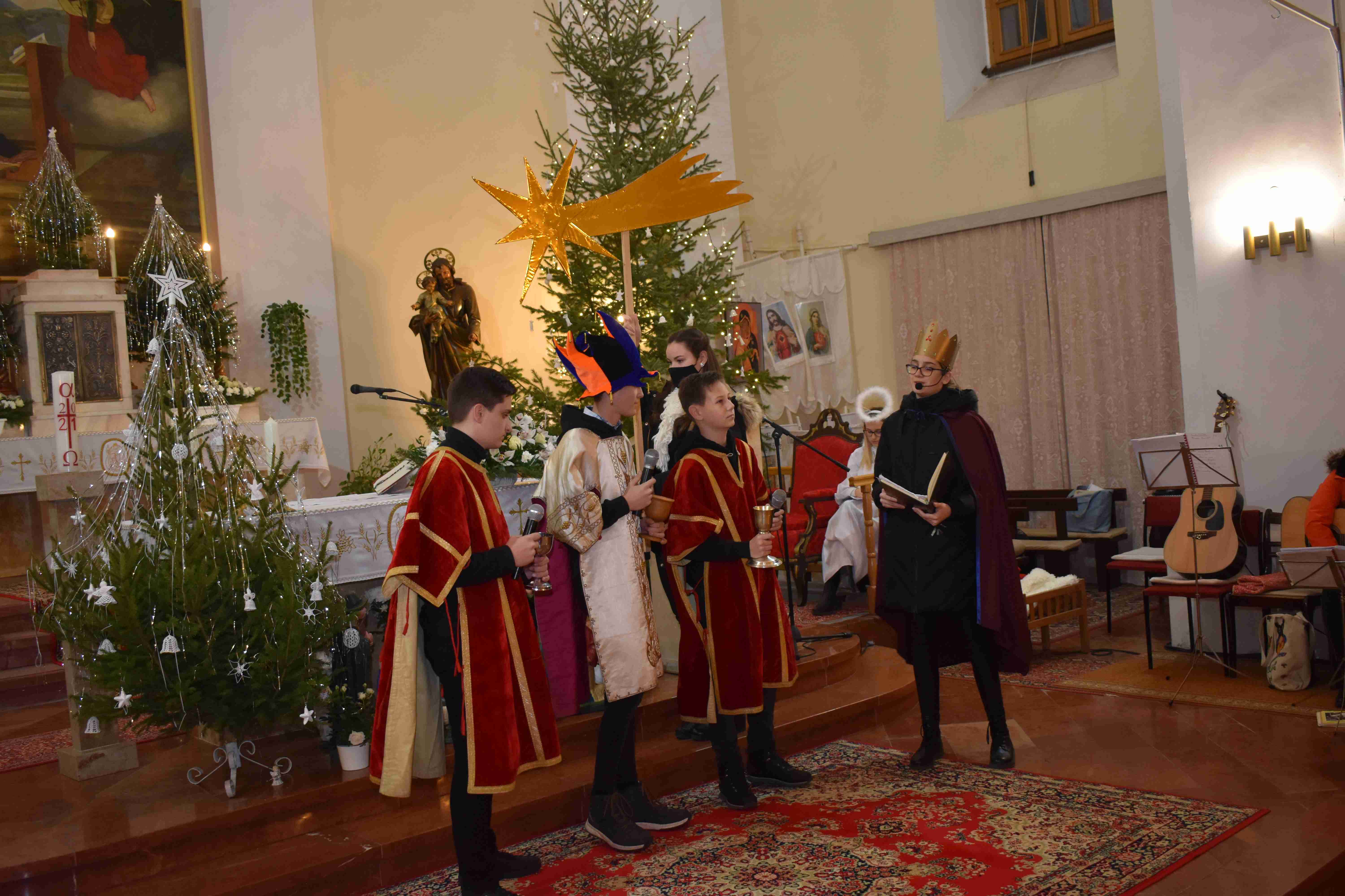 2021. december 24-én, pénteken, Szenteste 23.30 órakor, a Noszlopy iskola 15 hittanos tanulójának pásztorjátékával kezdődött a karácsonyi ünnepség a Gyümölcsoltó Boldogasszony plébániatemplomban.