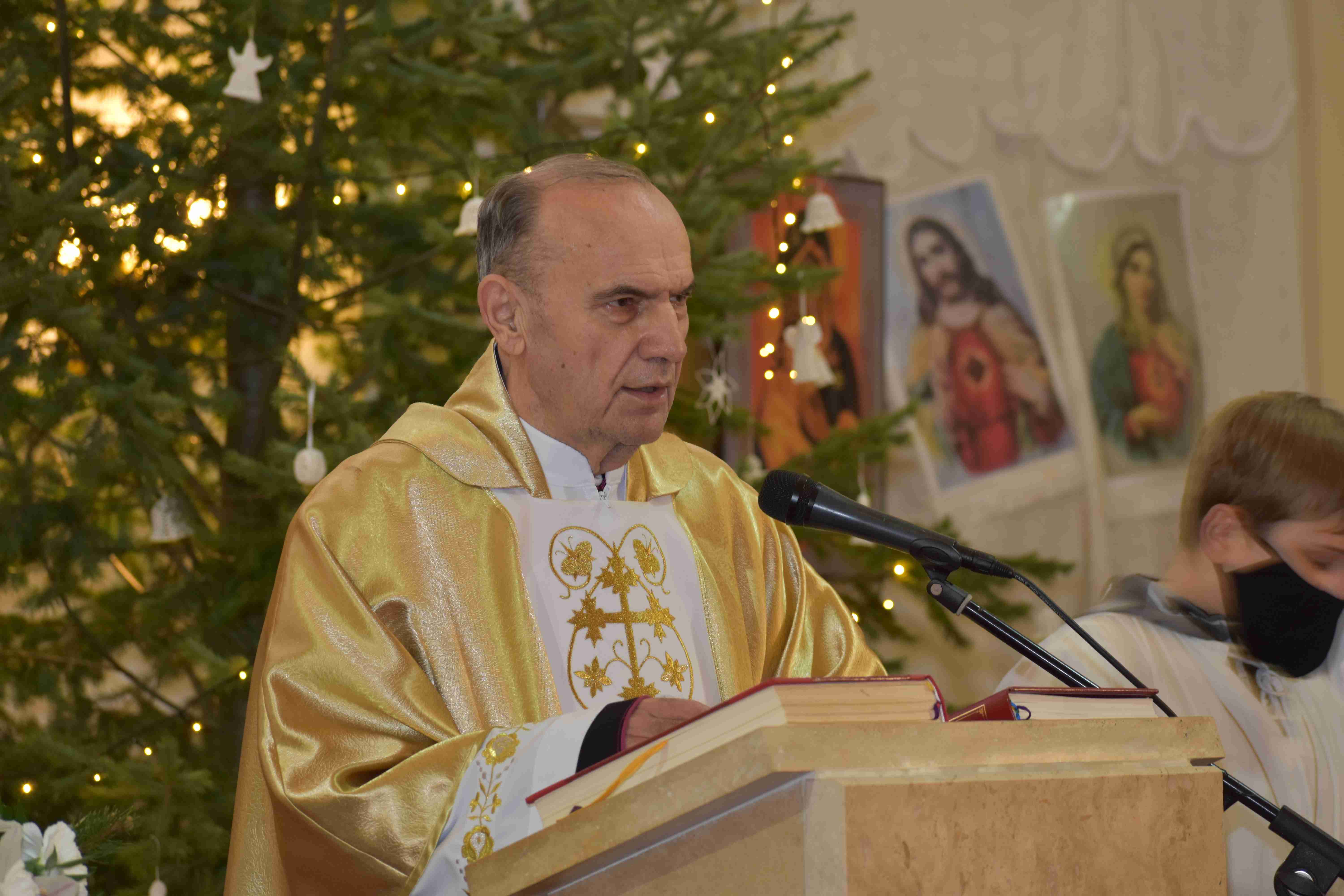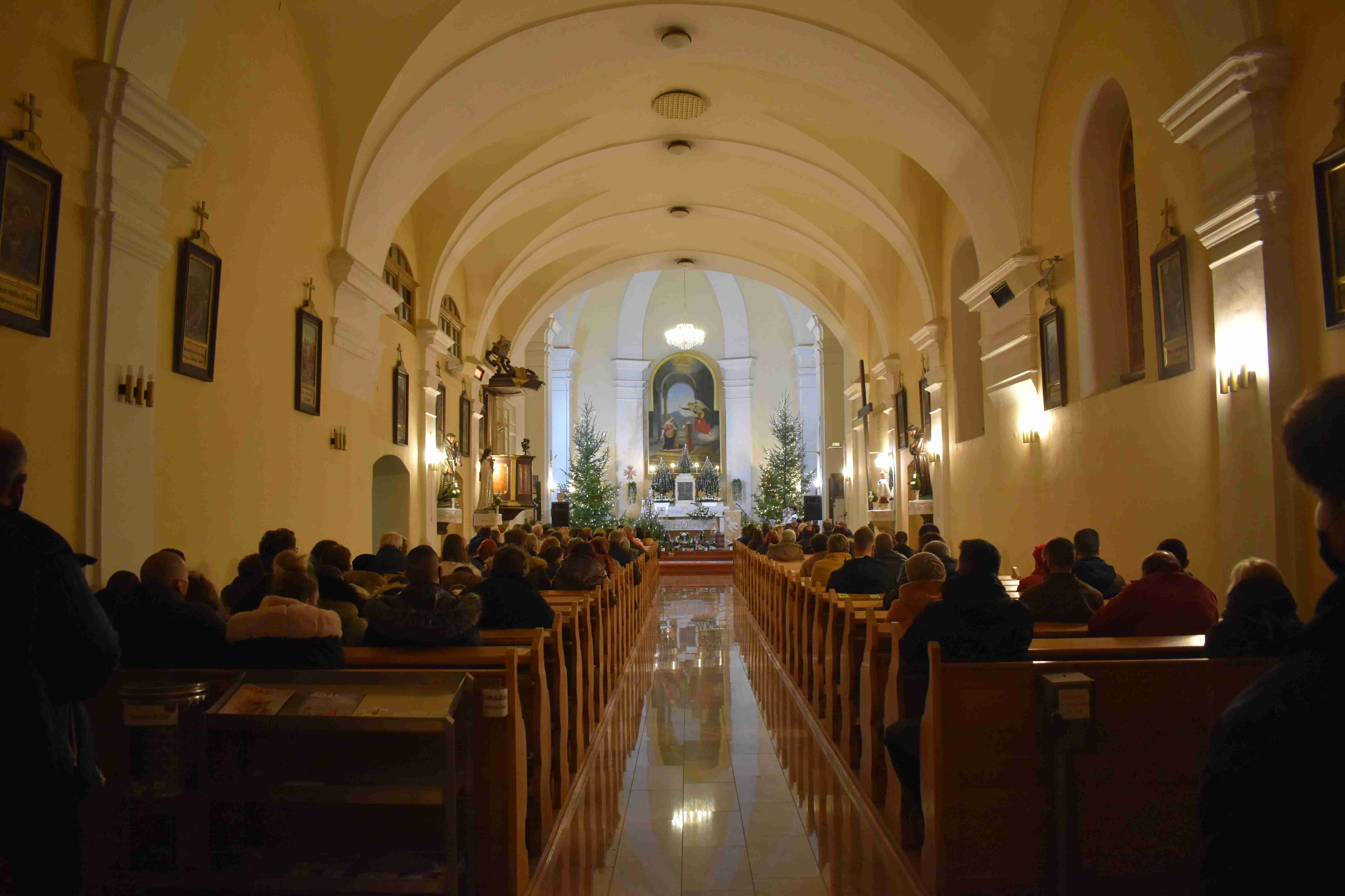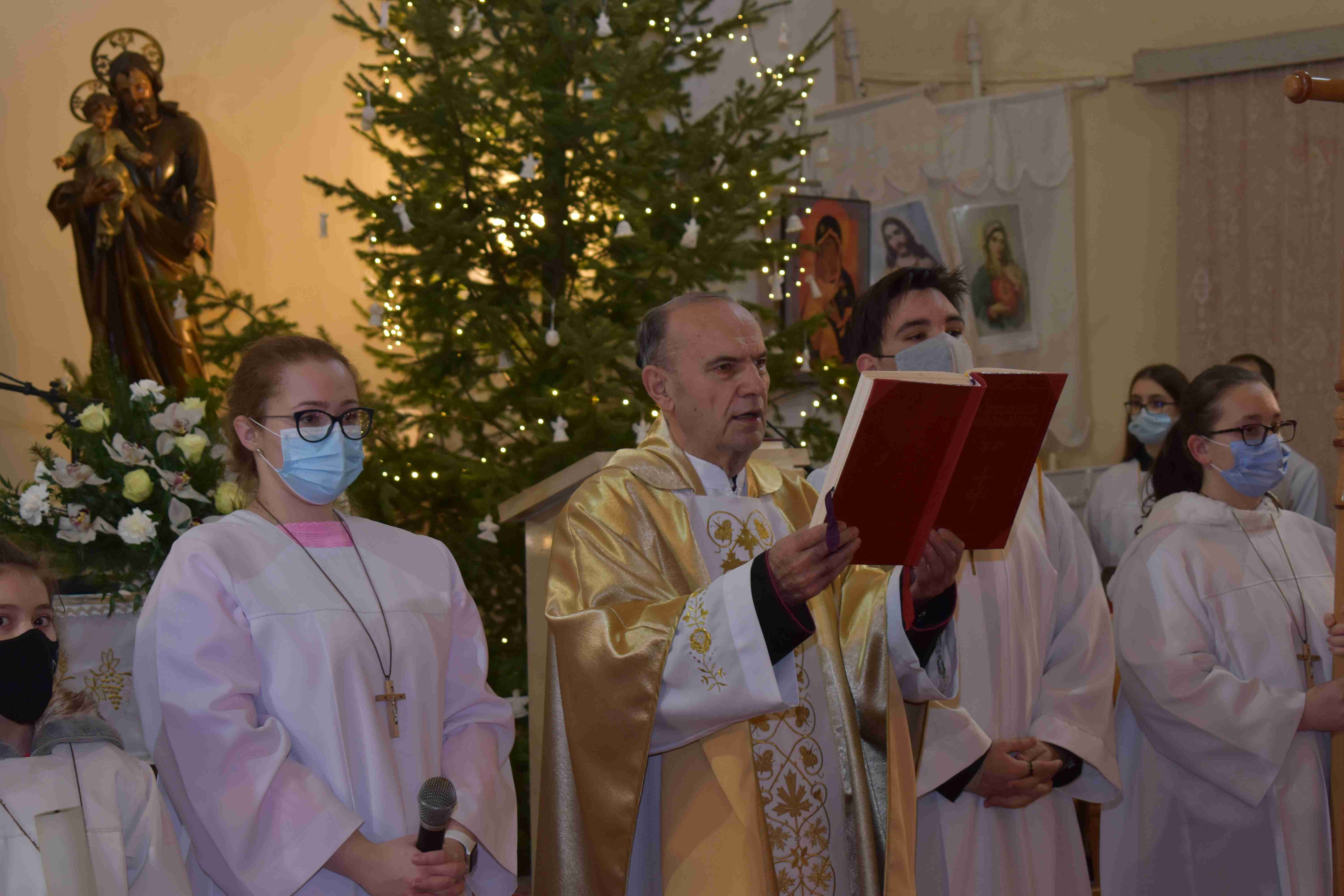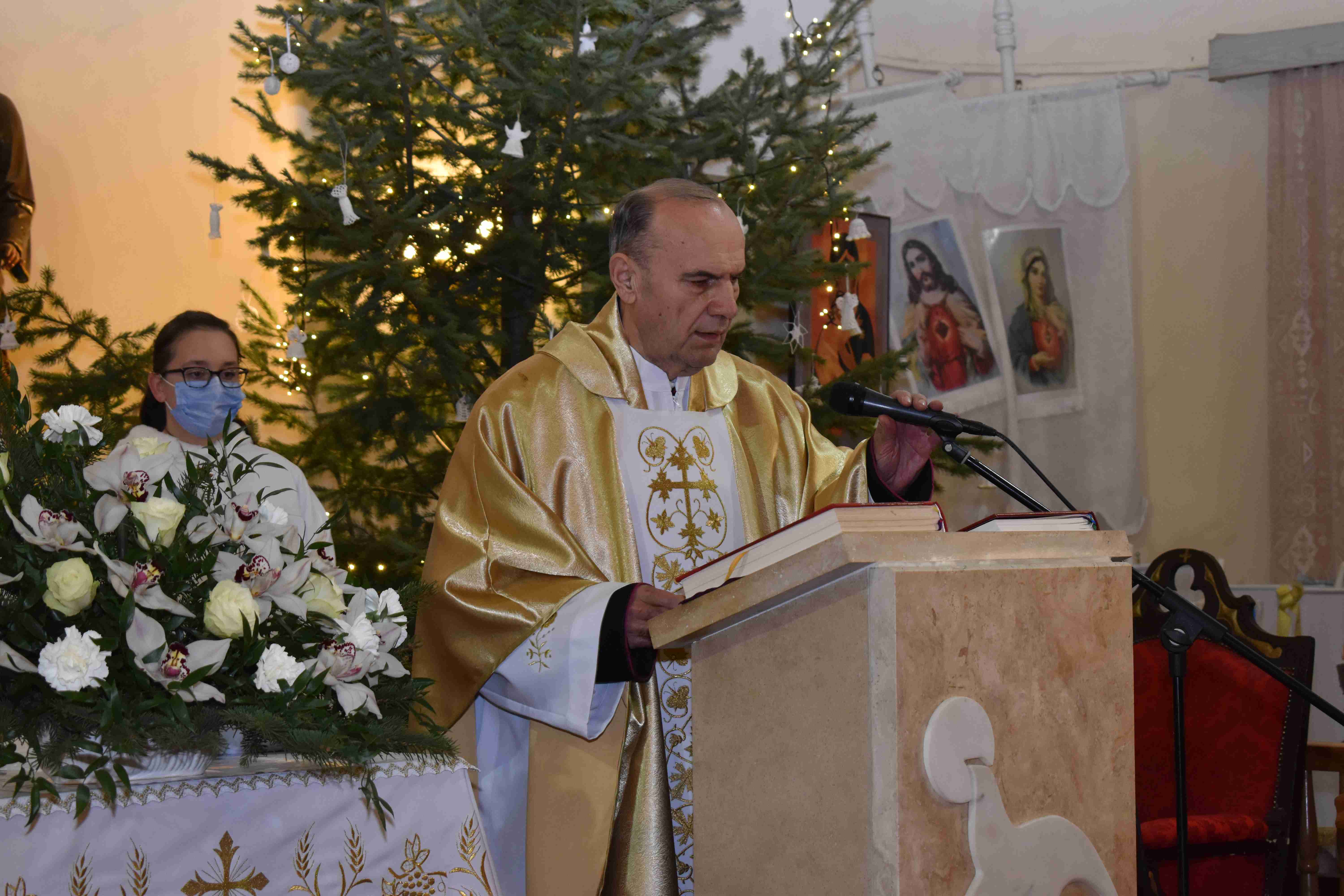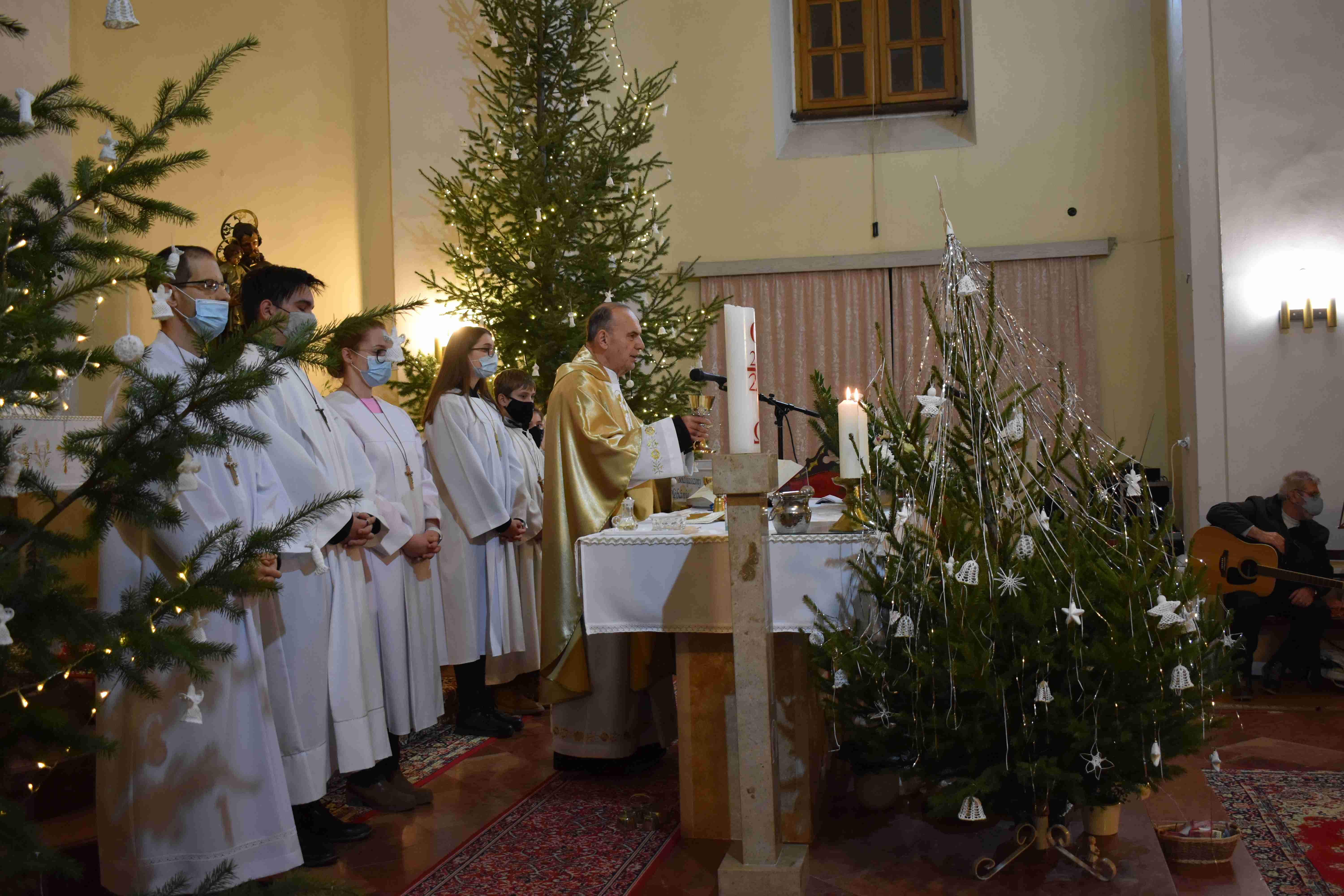 Eztán vette kezdetét az éjféli ünnepi szentmise, melyet Kiss Iván c. prépost, plébános celebrált, aki szentbeszédében kiemelte, hogy Jézus Krisztus születésének napja, a karácsony örömünnep. A mai emberek azonban inkább plázákban vásárolnak még az utolsó nap is, vagy szállodákba mennek, menekülnek, nehogy otthon töltsék a karácsonyt, nehogy a gyermekek együtt legyenek a szülőkkel. Pedig jó lenne, ha tudatosodna az emberekben, hogy Karácsony Jézus születésének ünnepe.