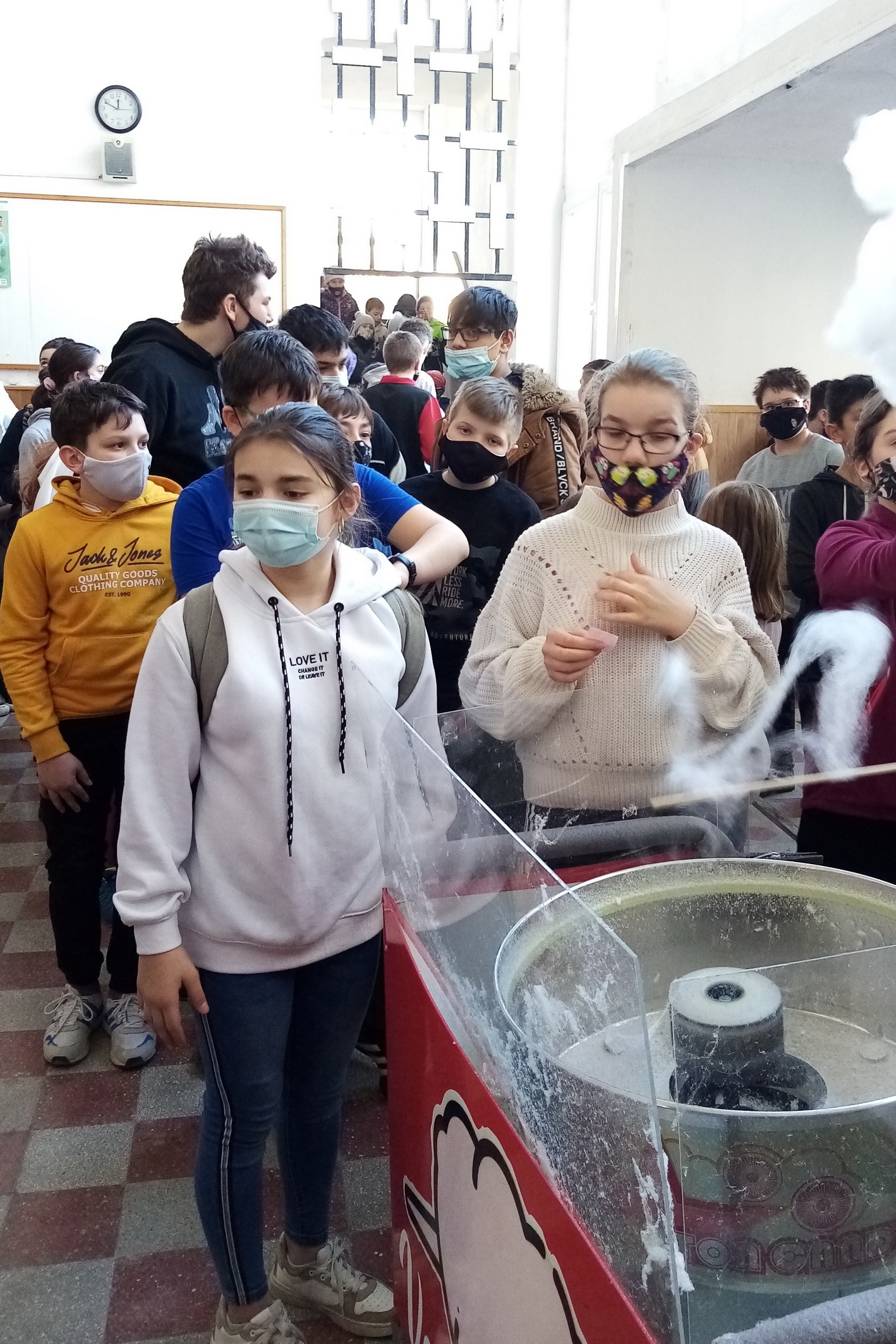 Diákpolgármesterünk, Bognár Emese és „testülete”, a 8.c osztály – kampányígéretükhöz híven – gondoskodtakegy kis finomságról is: a vattacukros stand előtt kígyózó sorok álltak minden szünetben, arra várva, hogy az édes-ragacsos finomság átjárja testüket, lelküket, ruhájukat…