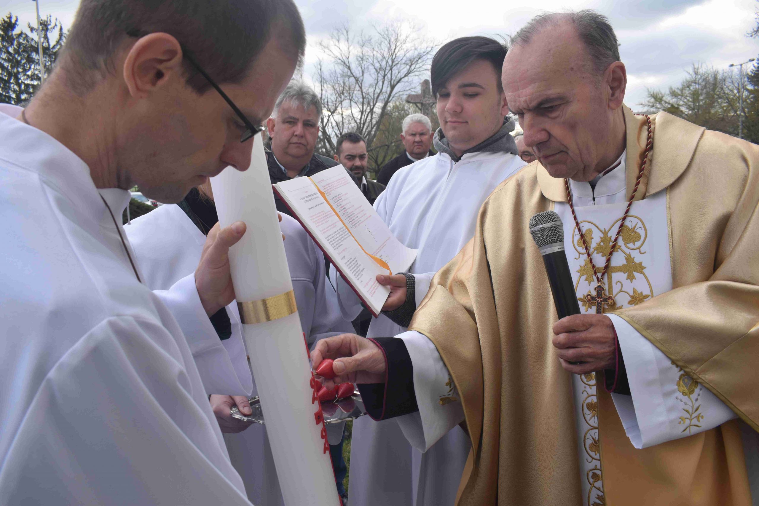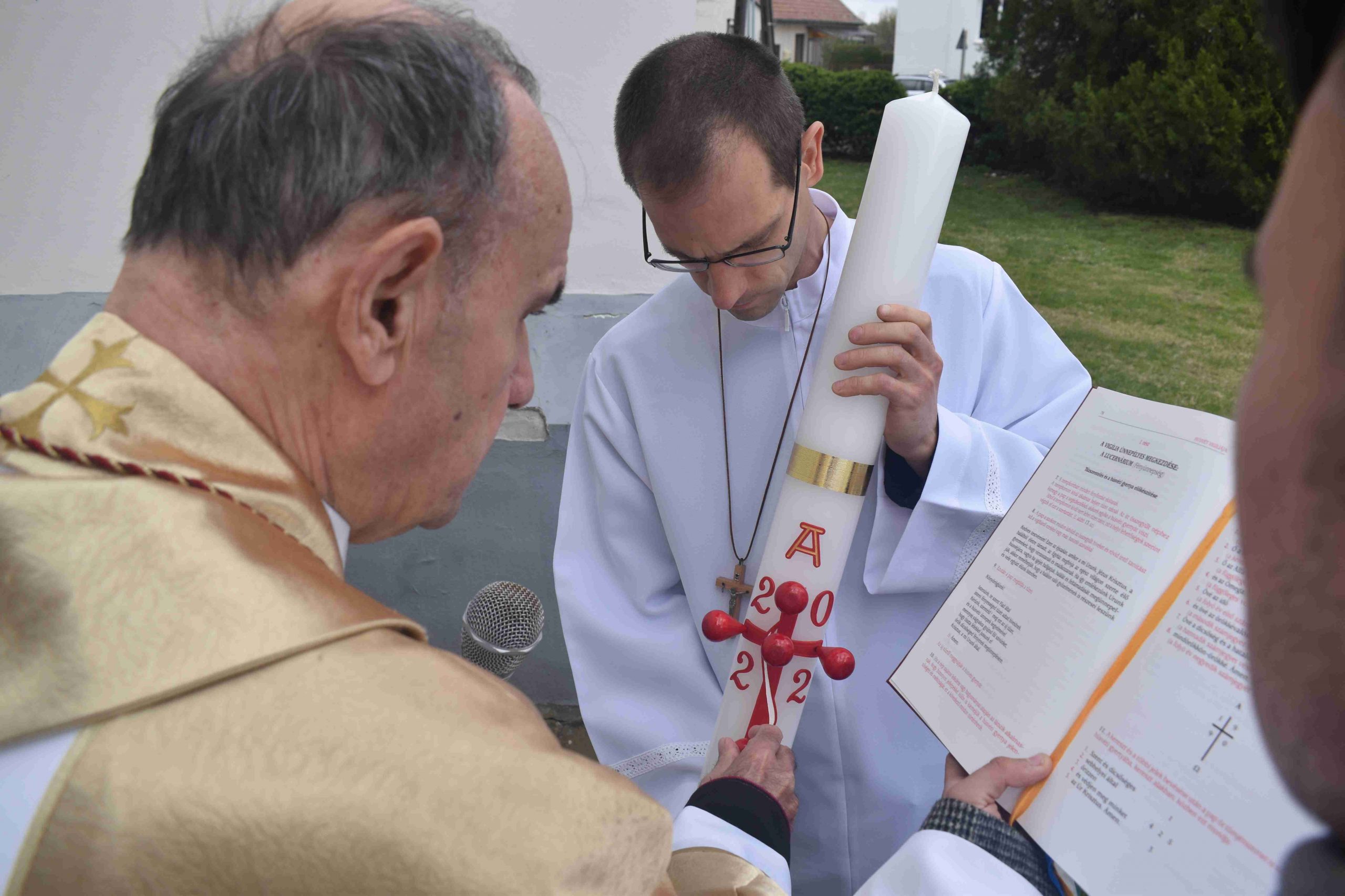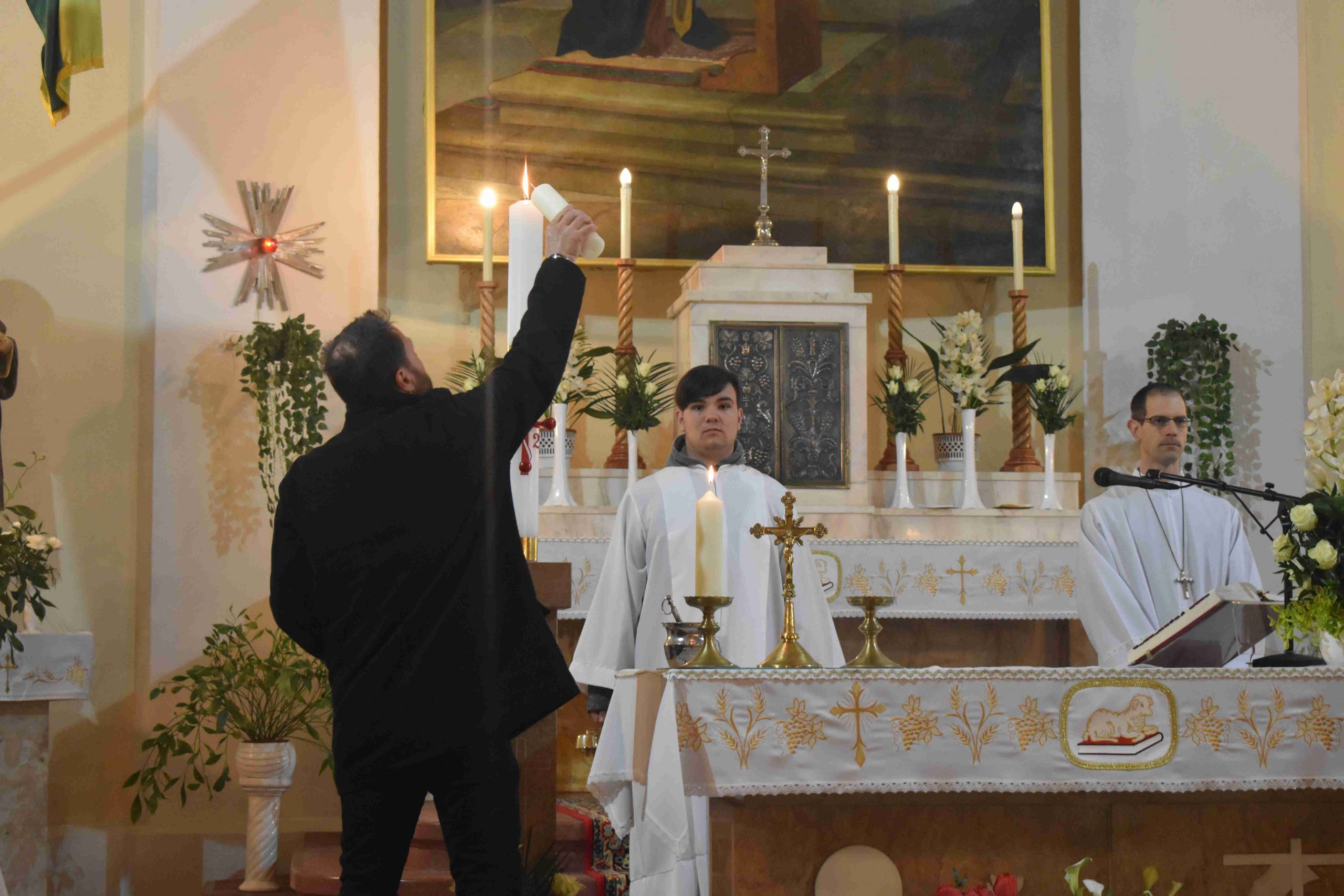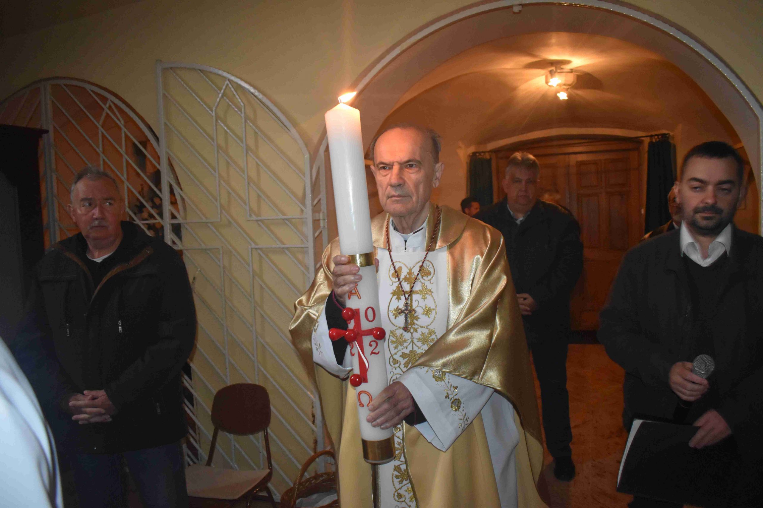 Marcaliban is a tűz-megáldásával kezdődött a szertartás. Iván atya a plébániatemplom főbejáratánál végezte el a liturgiát, majd erről gyújtották meg az új húsvéti gyertyát. Ezt követően a plébános, a ministránsok kíséretében bevonult, miközben mindössze csak ennek a gyertyának a fénye világította meg a félhomályba burkolózott templomot, hogy új reményt adjon. A húsvéti gyertya fénye ugyanis Isten győzelmét hirdeti a halál felett, Krisztus feltámadását a holtak országából.