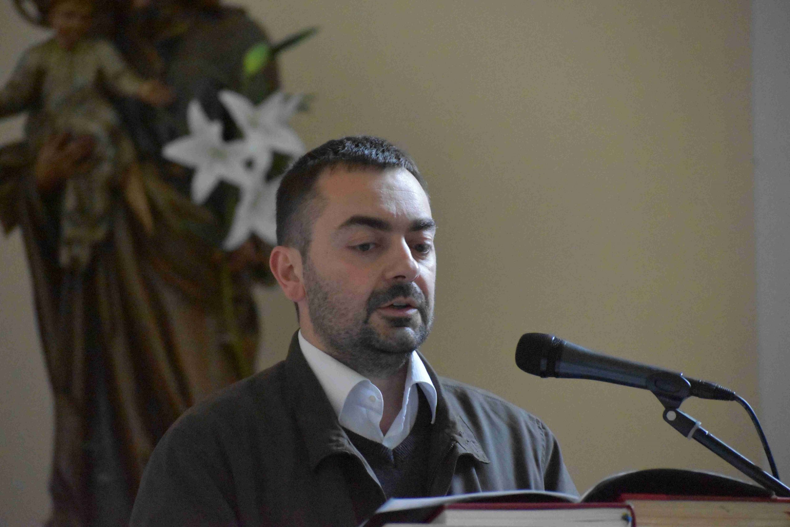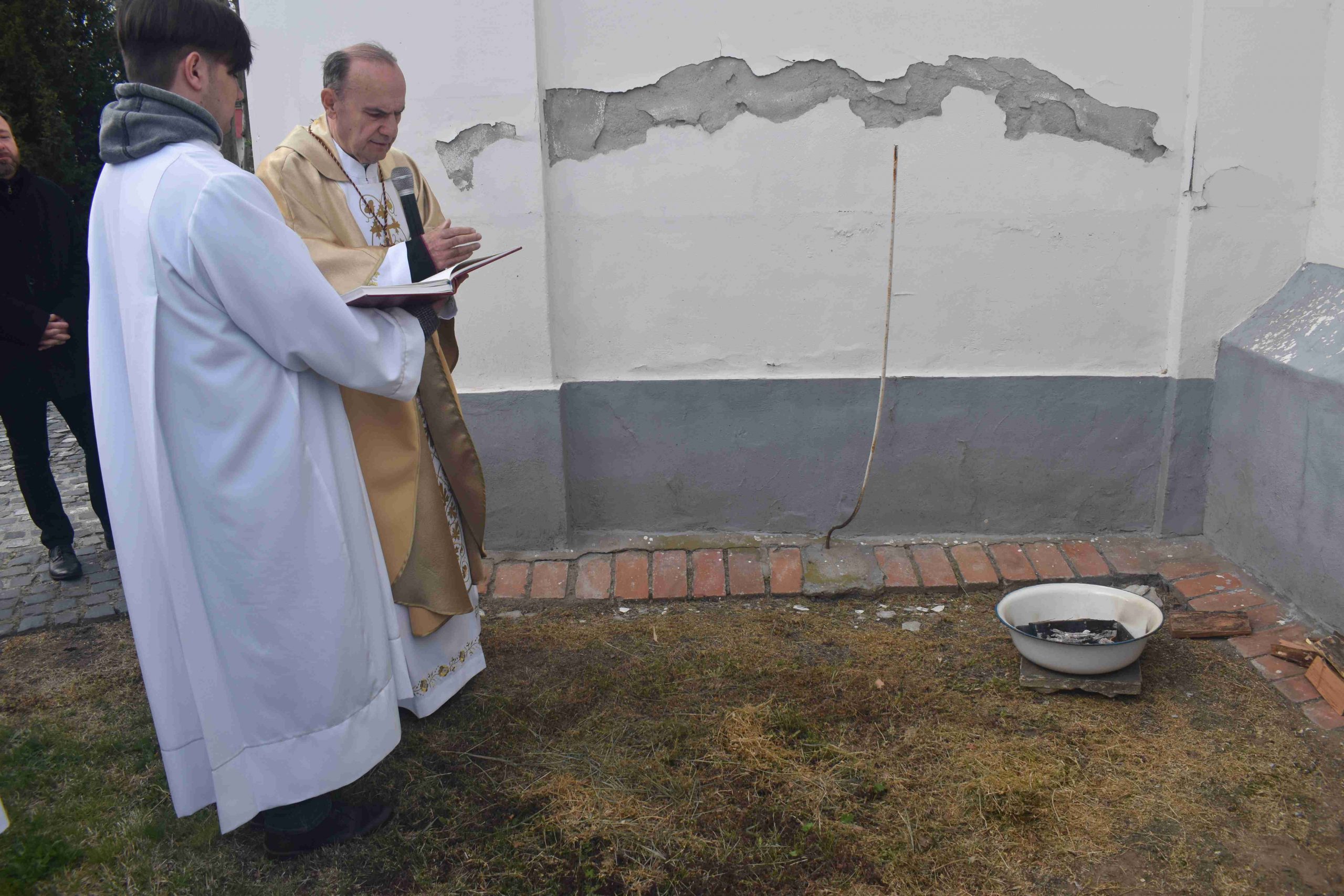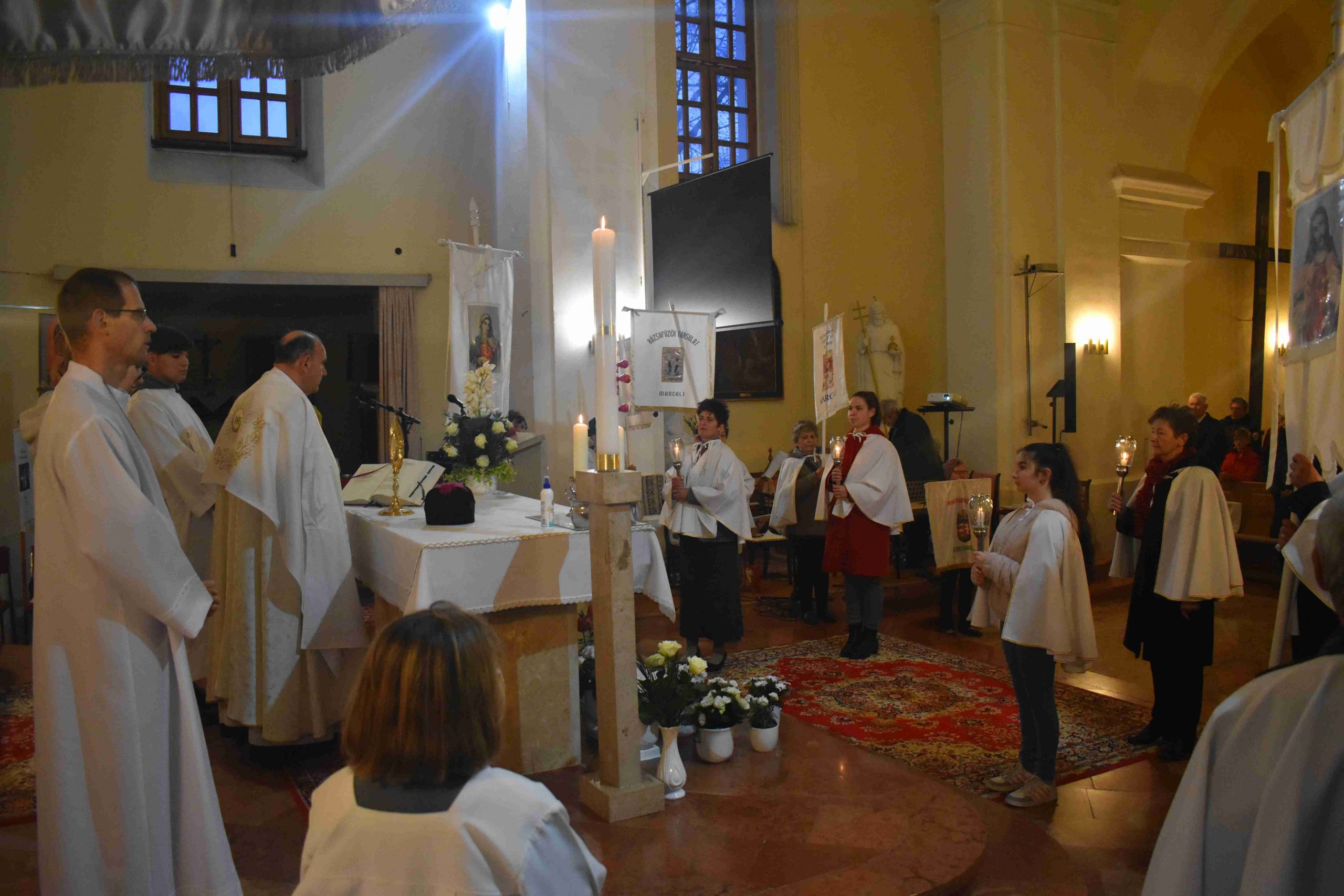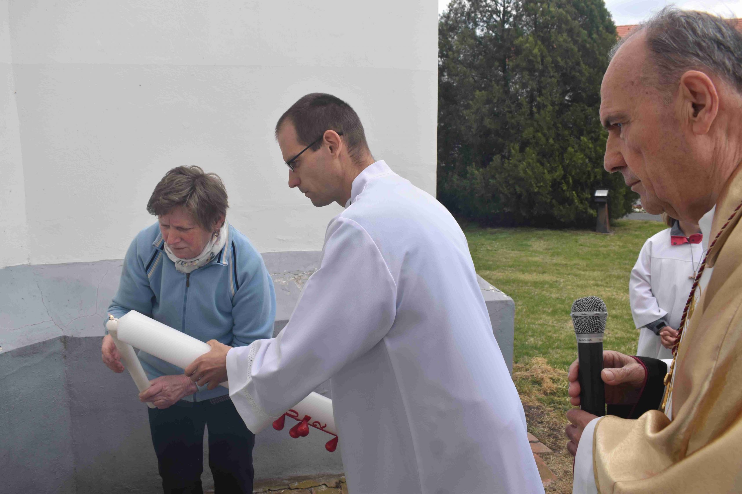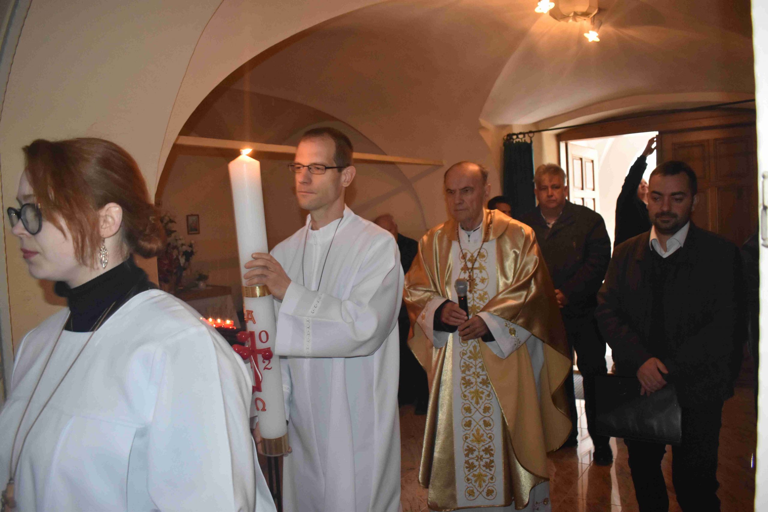 Marcaliban is a tűz-megáldásával kezdődött a szertartás. Iván atya a plébániatemplom főbejáratánál végezte el a liturgiát, majd erről gyújtották meg az új húsvéti gyertyát. Ezt követően a plébános, a ministránsok kíséretében bevonult, miközben mindössze csak ennek a gyertyának a fénye világította meg a félhomályba burkolózott templomot, hogy új reményt adjon. A húsvéti gyertya fénye ugyanis Isten győzelmét hirdeti a halál felett, Krisztus feltámadását a holtak országából.