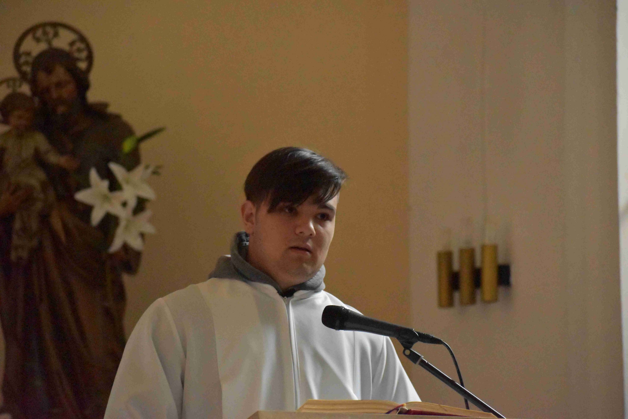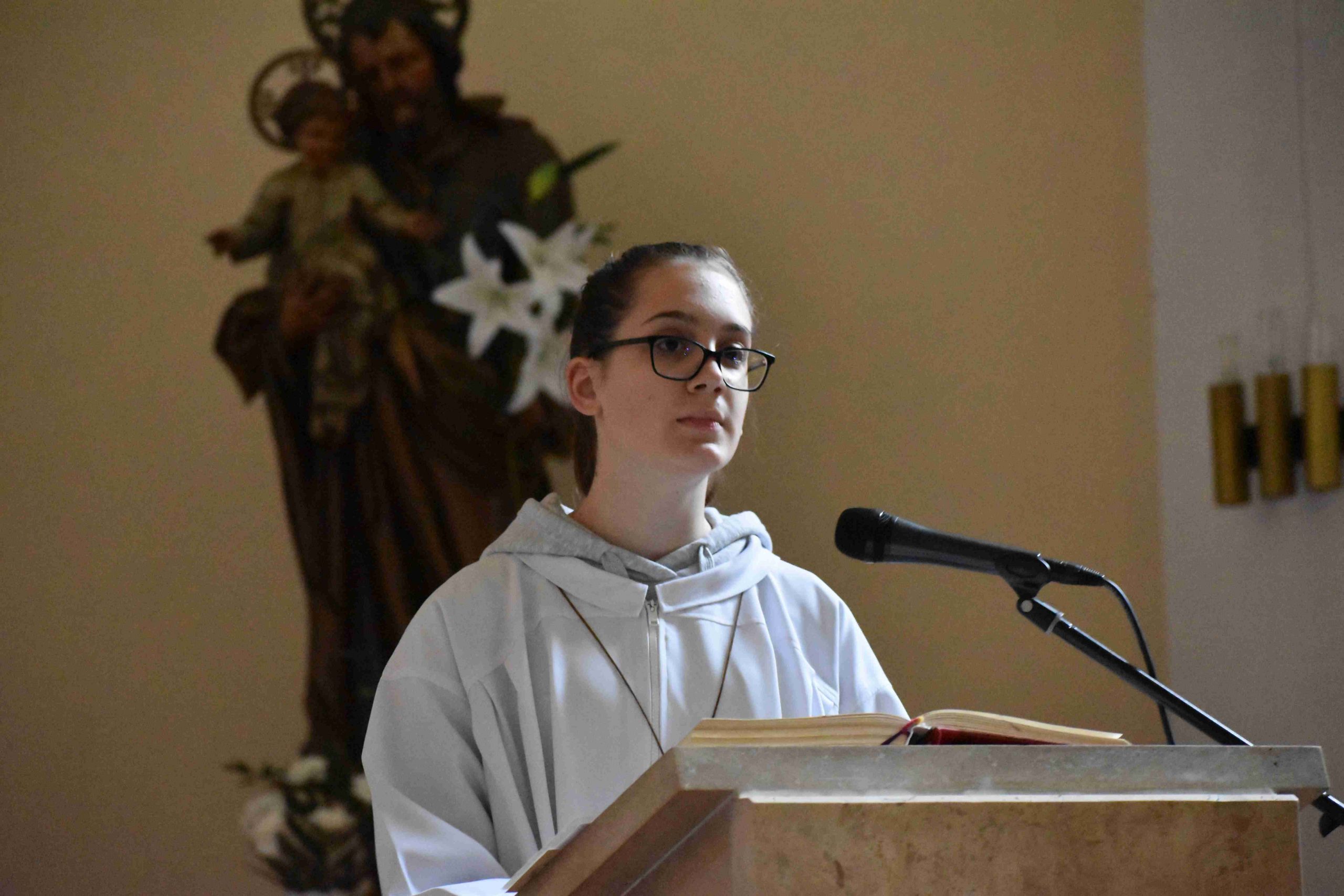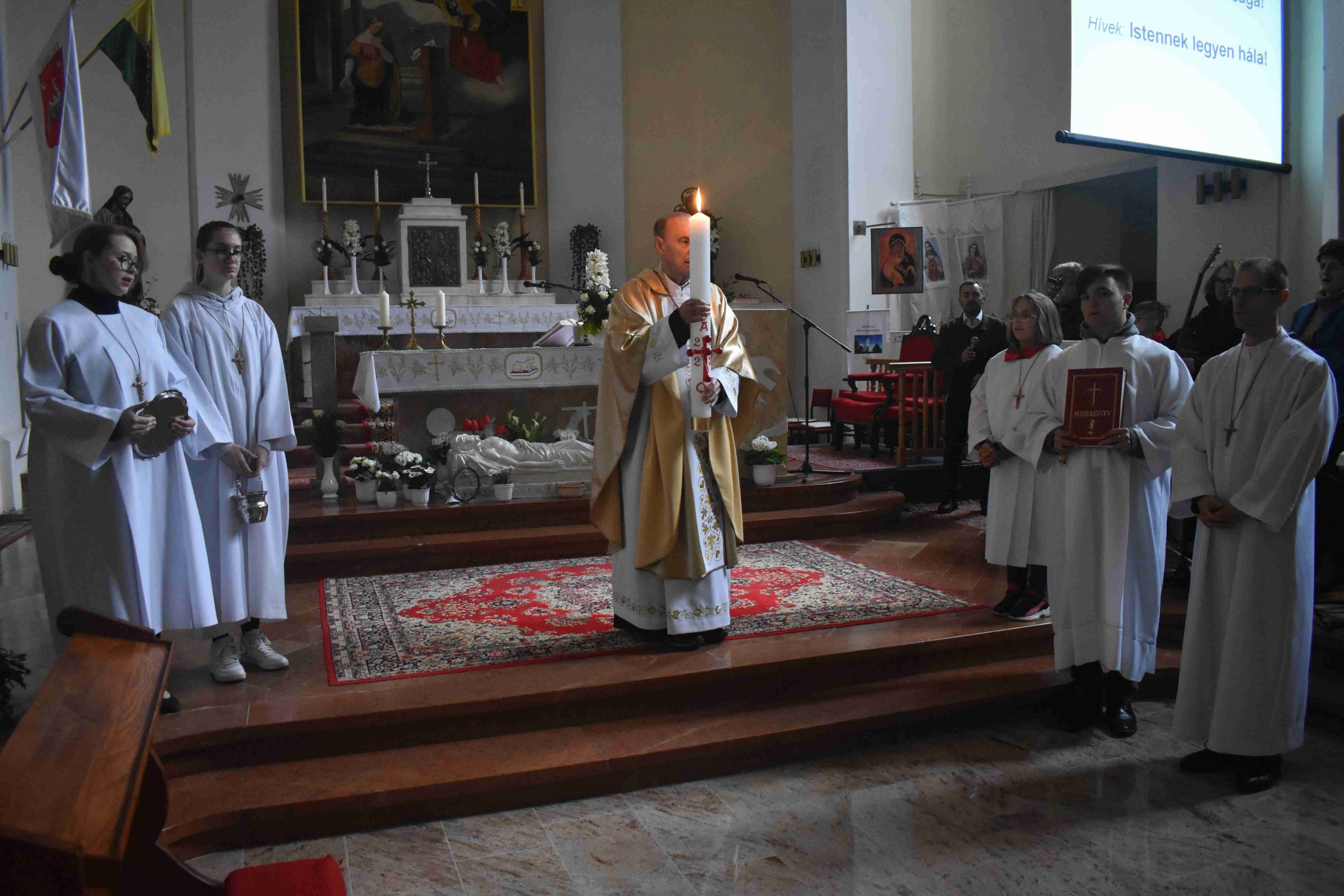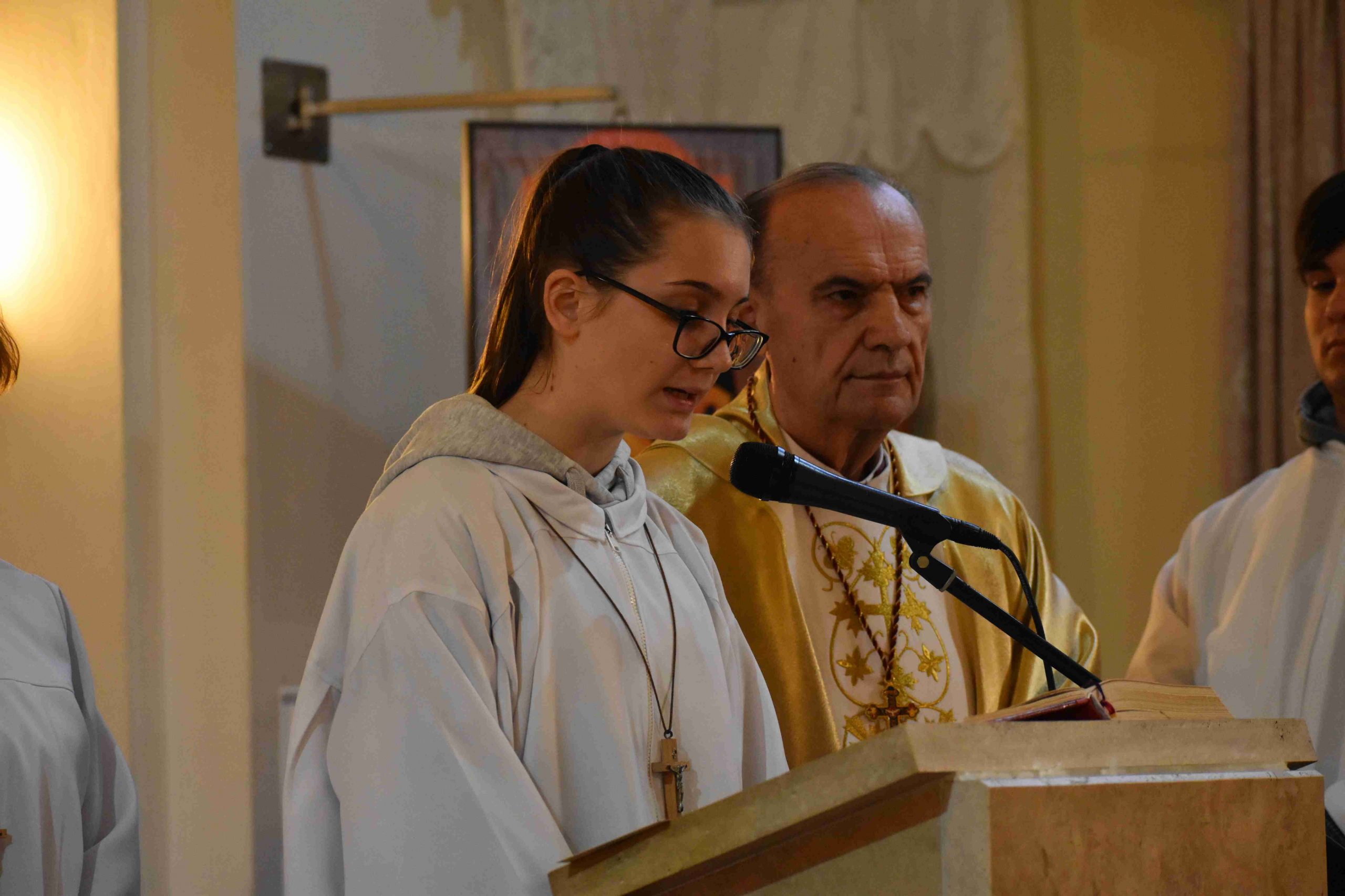 Ezután az ószövetségi olvasmányok következtek, melyek az üdvösségtörténet nagy állomásain keresztül vezetik a híveket. A felolvasó diákok: Bognár Emese, Pozsonyi Anna és Király Kristóf voltak. A harmadik olvasmány után felcsendült a Glória, Isten dicsőítése és „visszatérnek a harangok Rómából”, meghívva a hívőket Krisztus győzelmének ünneplésére. Jézus feltámadását, az igazi örömhírt hirdeti az evangélium: „Miért keresitek az élőt a halottak között? Nincs itt, feltámadt!” (Lk 24,1-12).A szentleckét dr. Gyulai Botond akolitus olvasta fel.