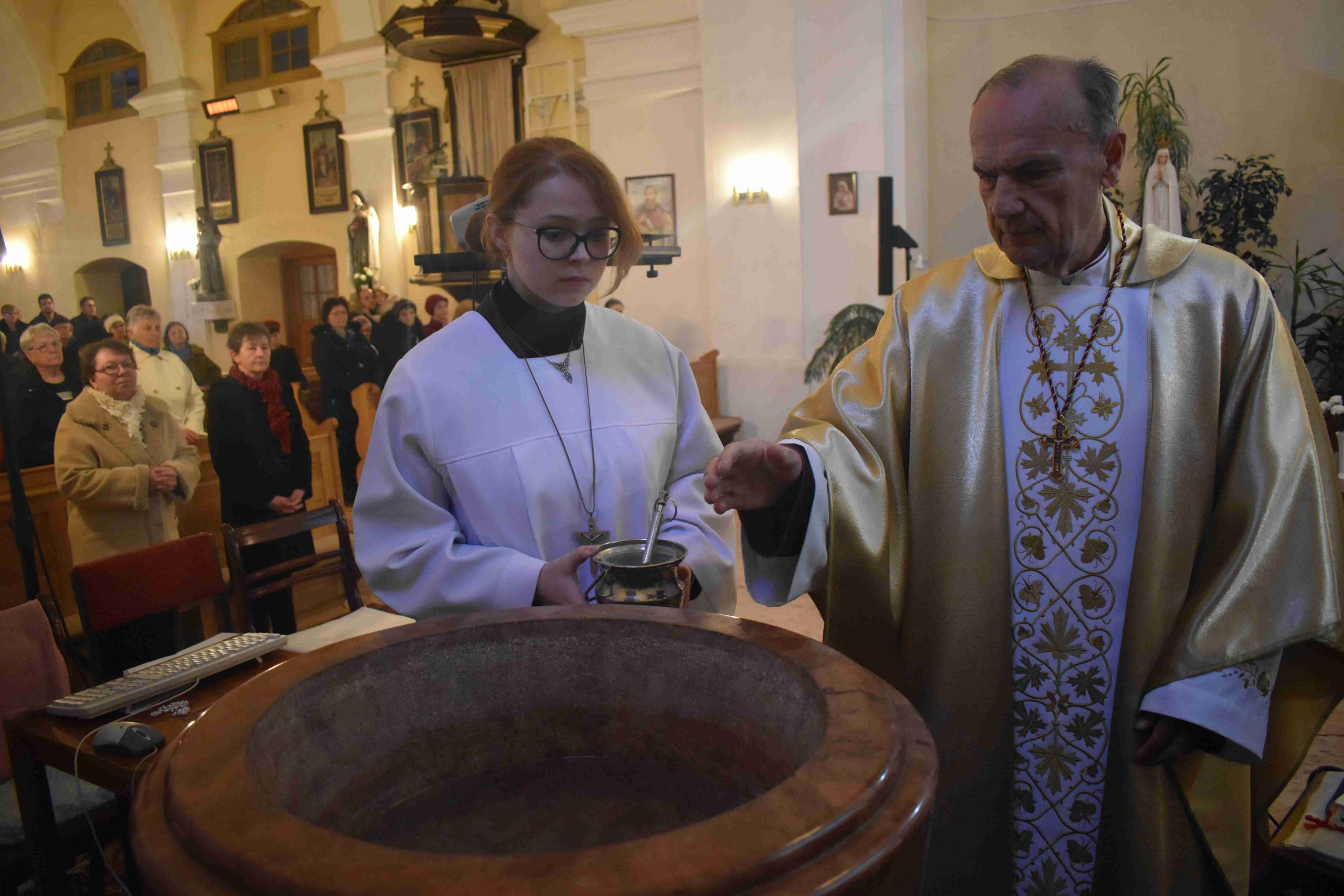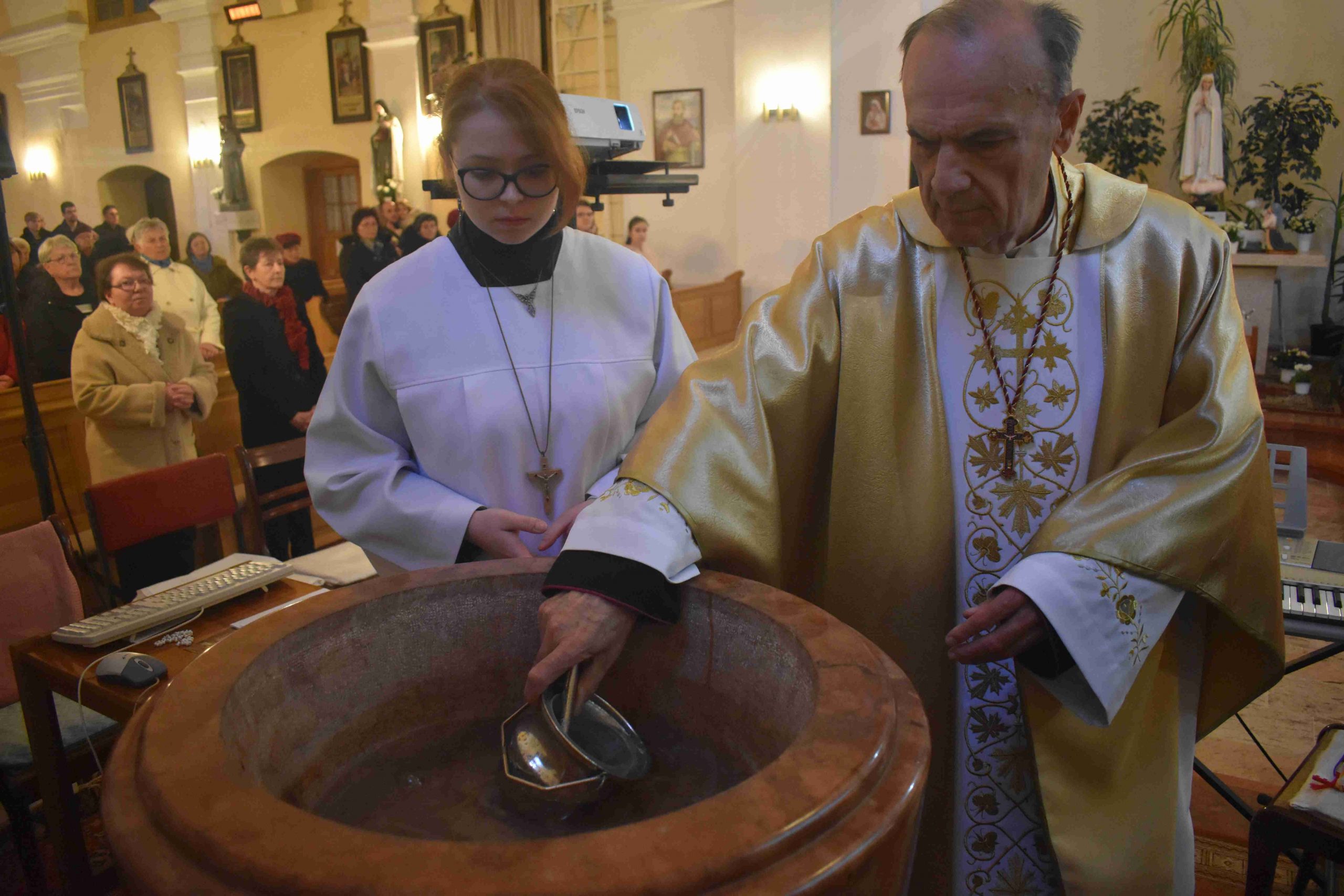 A homília után következett a mindenszentek litániája, melyet Niklai Zsuzsanna énekelt elő, ami a keresztelési liturgiából és a lélekajánlásból (a haldoklók melletti imából) önállósult ősi könyörgő imádság. Ez emlékeztet a keresztségre, amely által lehet valaki az Egyház tagja, amelyhez a szentek közössége is hozzátartozik. A húsvéti szertartás folytatásaként Iván atya megszentelte a keresztvizet a keresztelőkútnál, illetve a jelenlévő hívek is megerősítették keresztségi fogadalmukat.