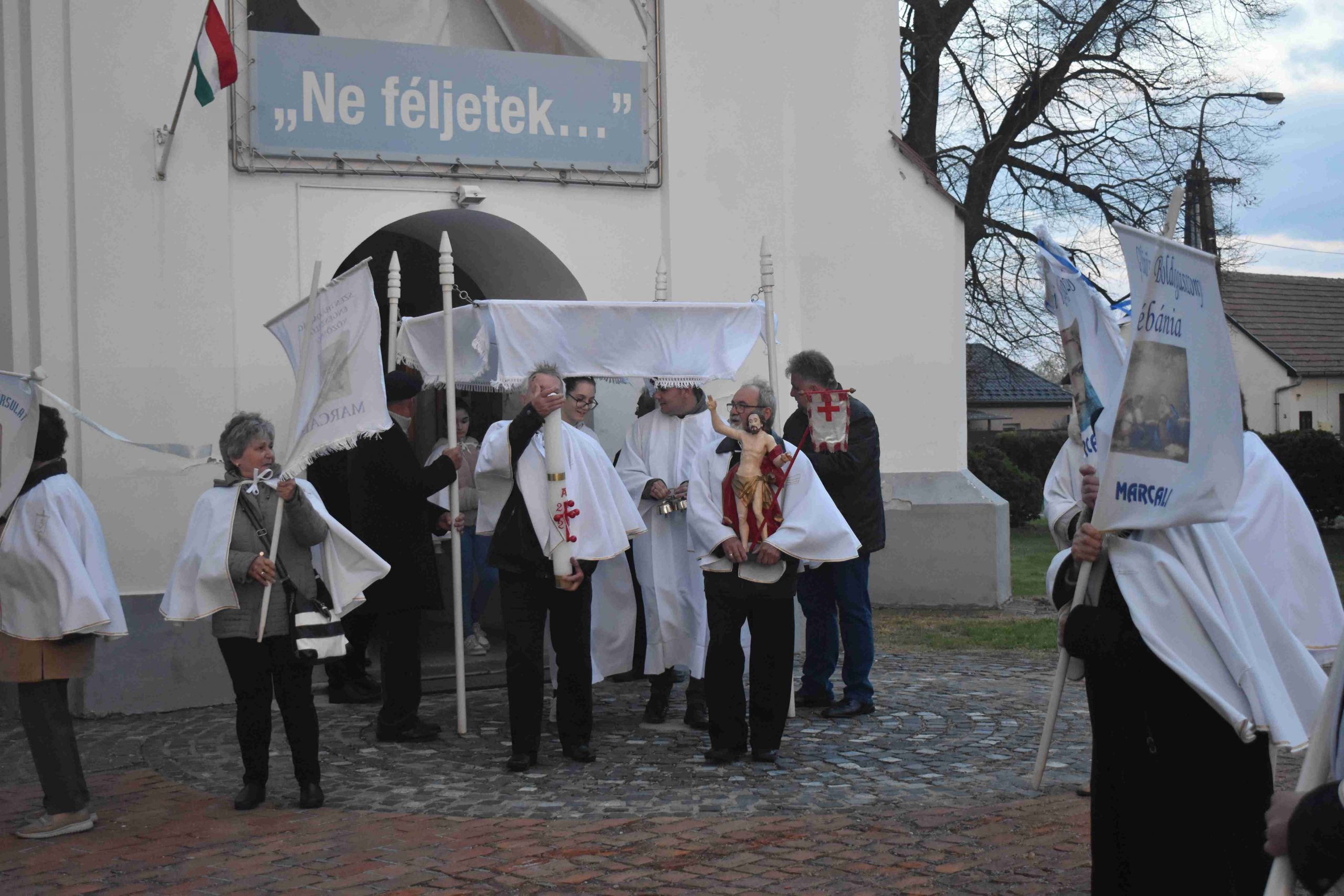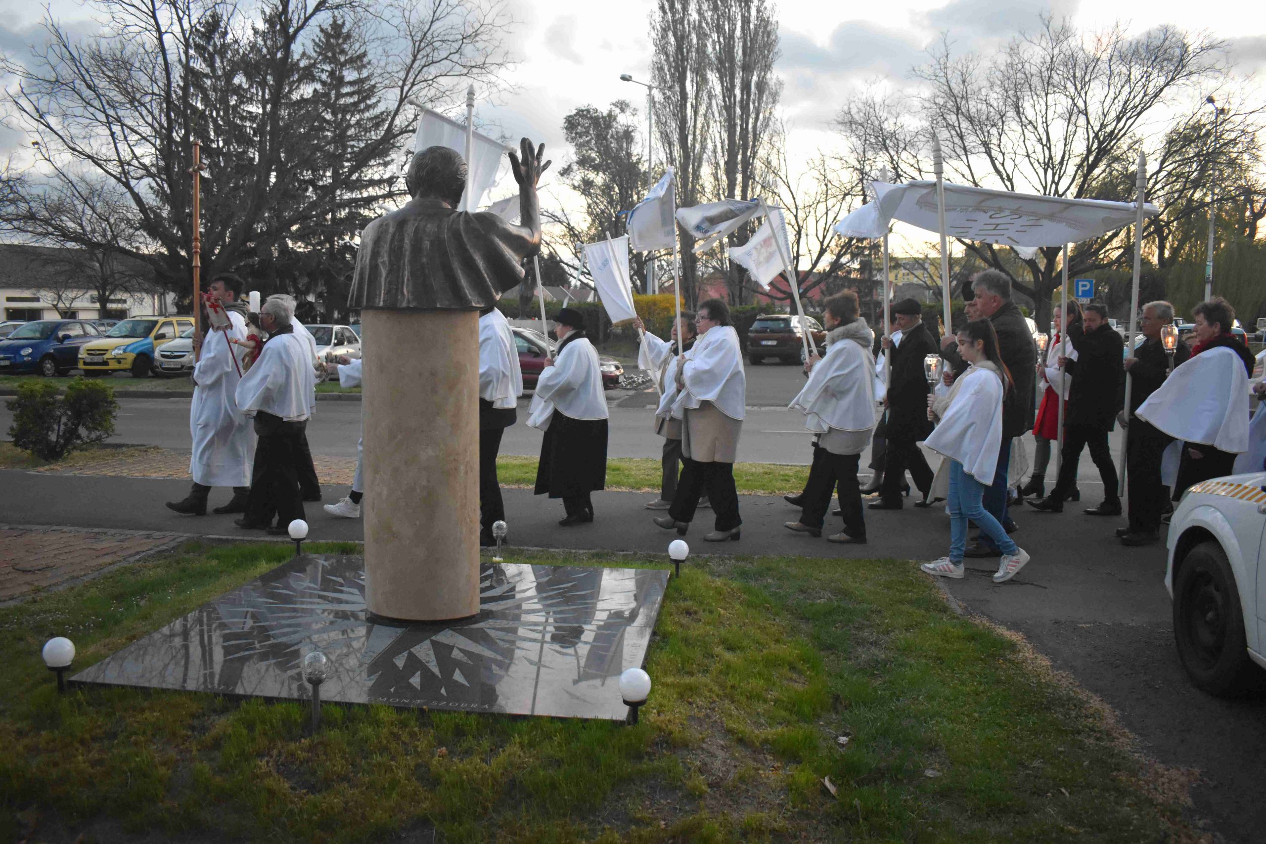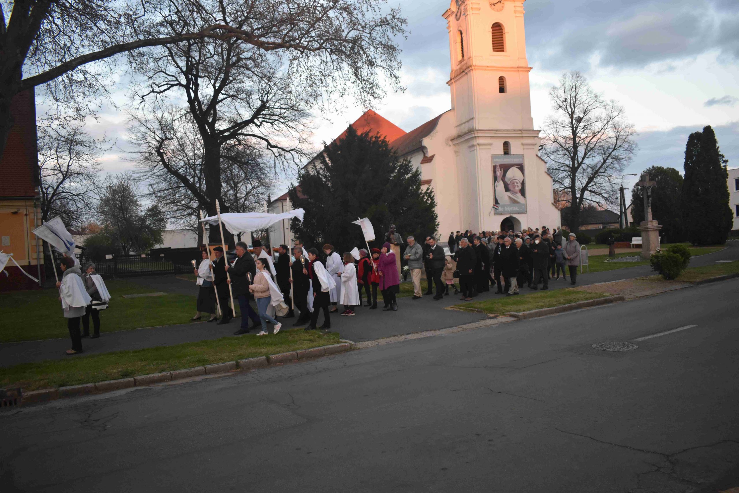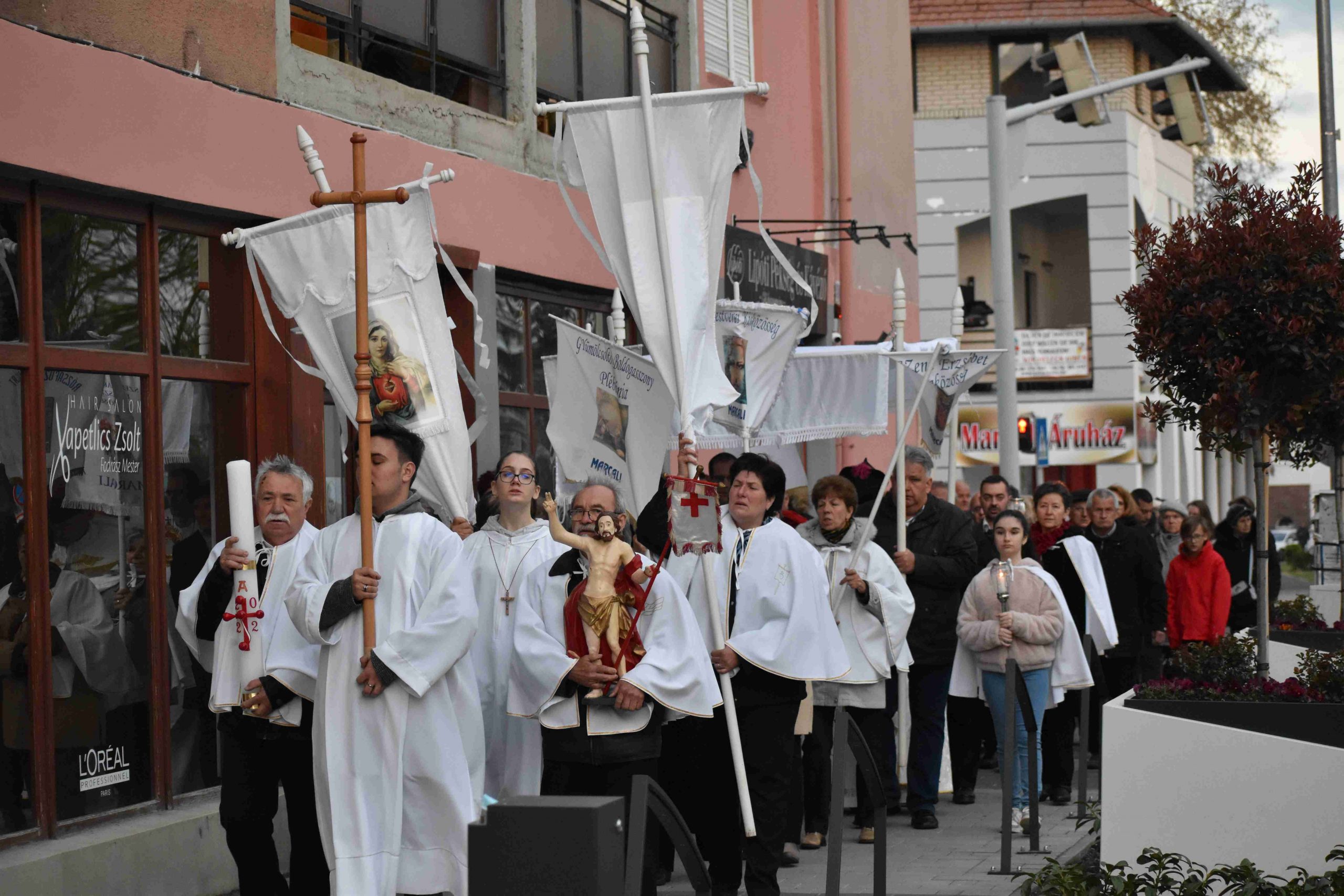 A szentmisét Marcaliban is a hagyományos fáklyás-zászlós húsvéti körmenettel zárták, az imakörök tagjai, valamint a jelenlévő hívek közreműködésével. Az idei esztendőben a körmenet ezúttal rövidített útvonalon, a szépen megújult Rákóczi utca járdáján vezetett egészen az önkormányzatig és vissza a Hősök, illetve a Boldog II. János Pál pápa téren át a plébániatemplomig.