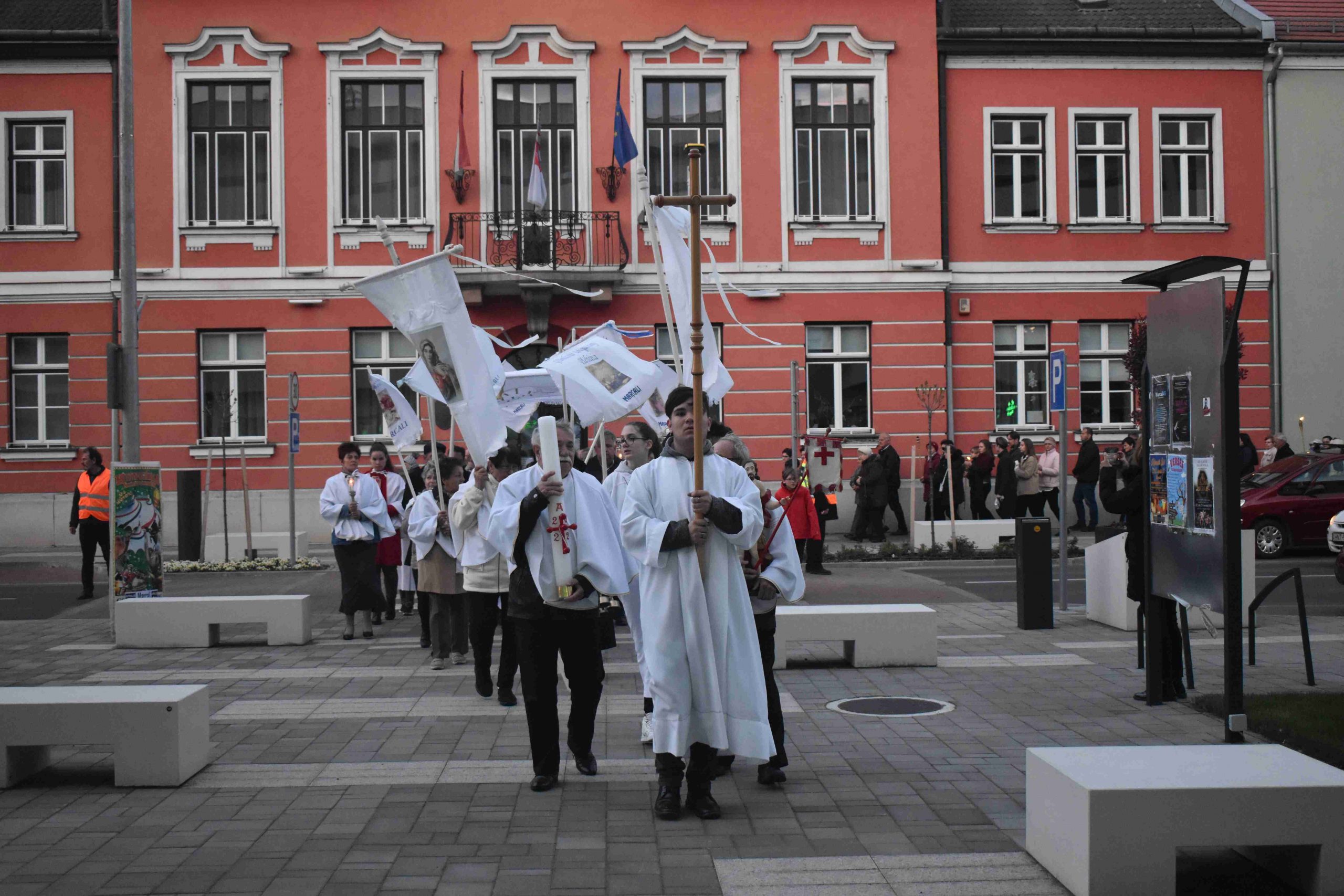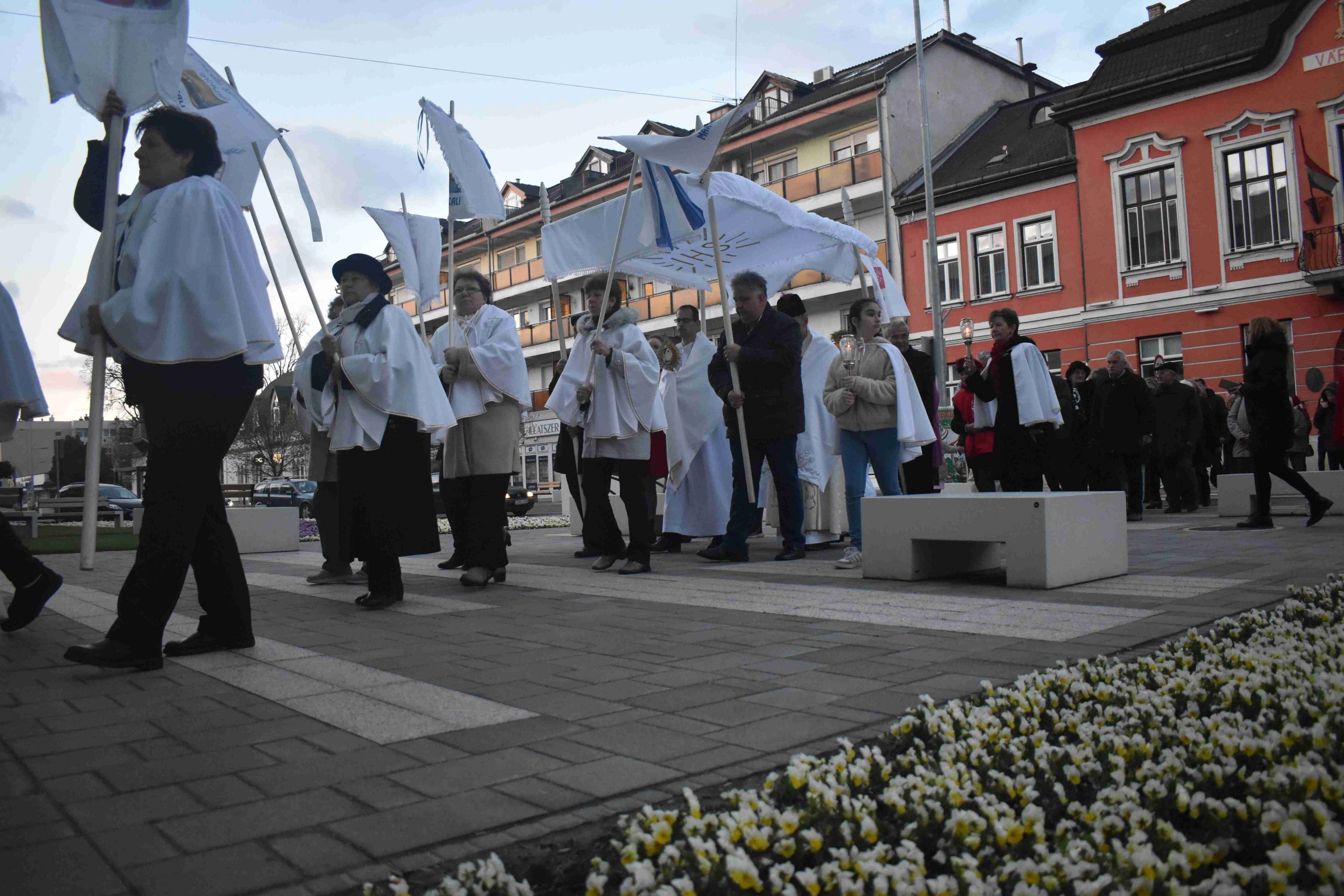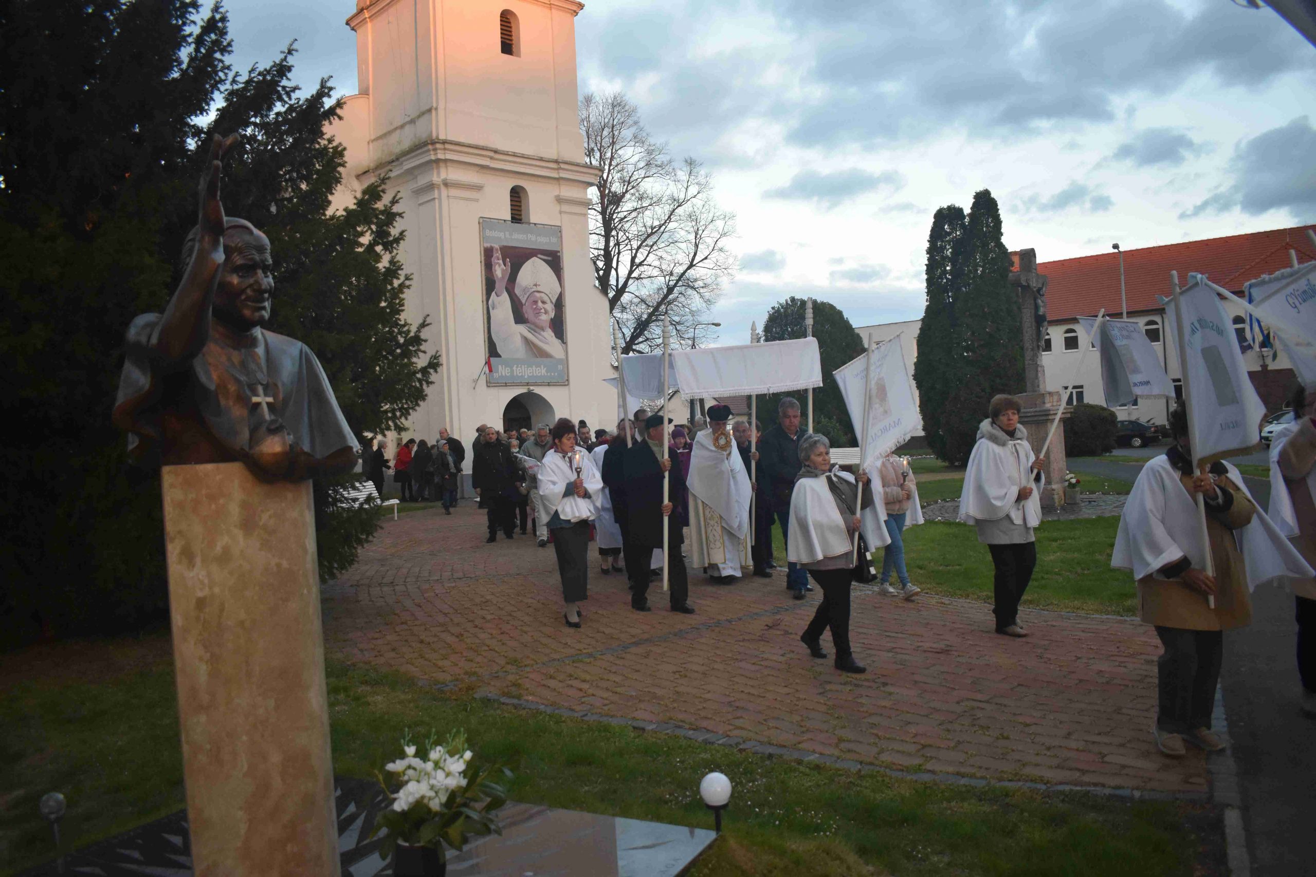 A szentmisét Marcaliban is a hagyományos fáklyás-zászlós húsvéti körmenettel zárták, az imakörök tagjai, valamint a jelenlévő hívek közreműködésével. Az idei esztendőben a körmenet ezúttal rövidített útvonalon, a szépen megújult Rákóczi utca járdáján vezetett egészen az önkormányzatig és vissza a Hősök, illetve a Boldog II. János Pál pápa téren át a plébániatemplomig.