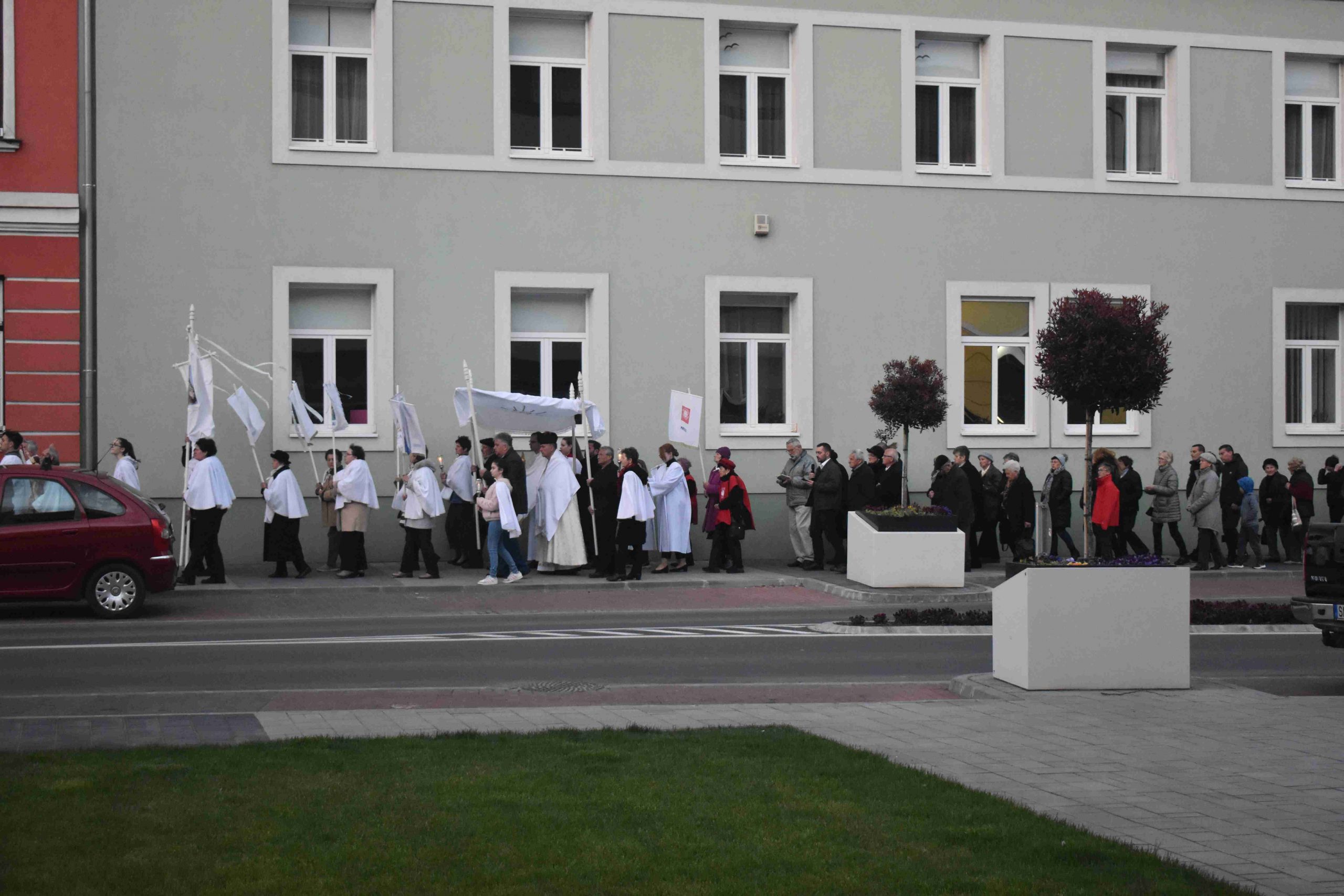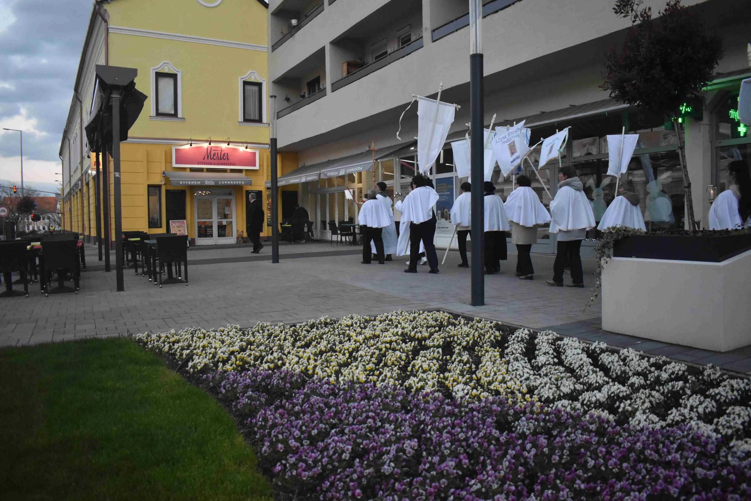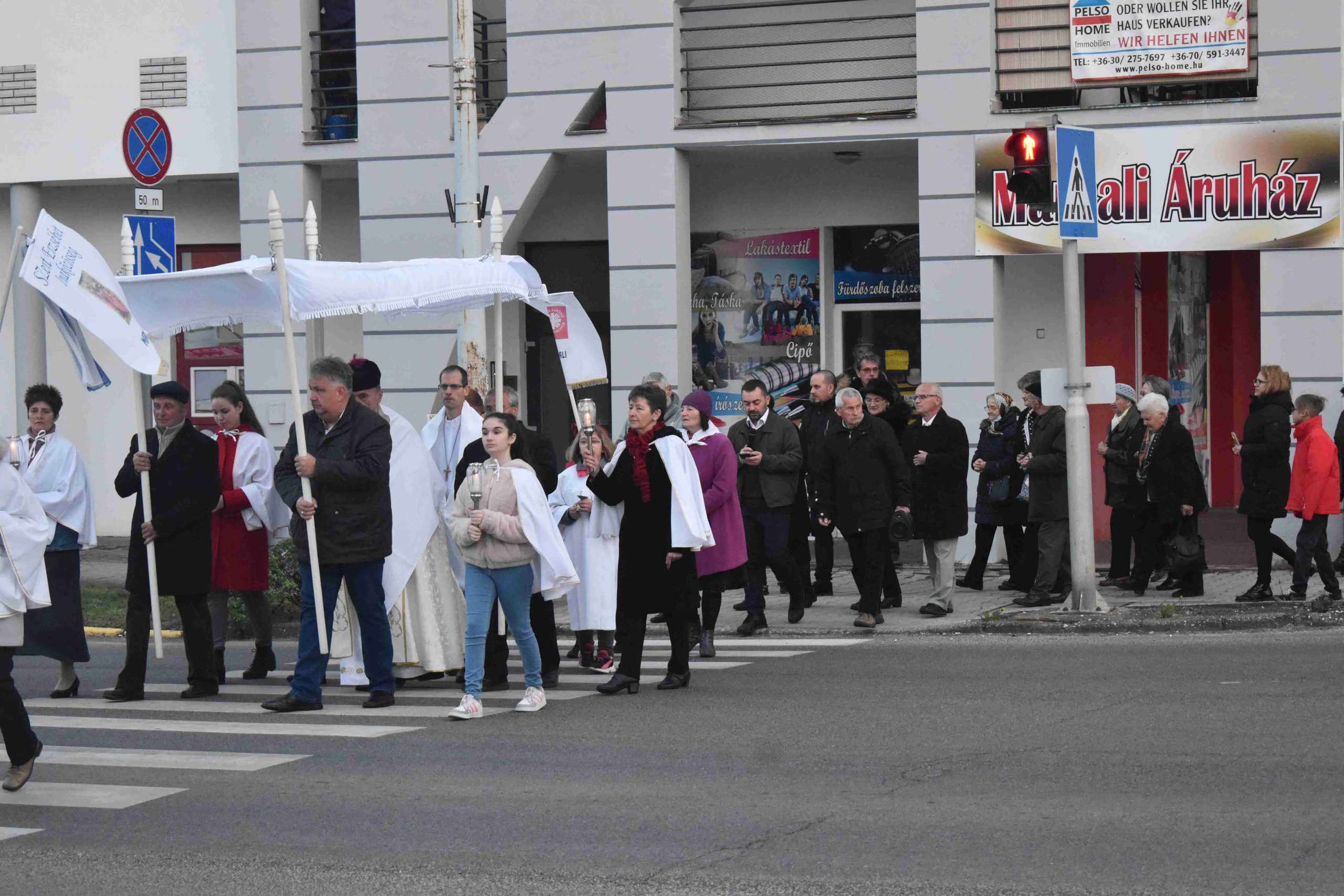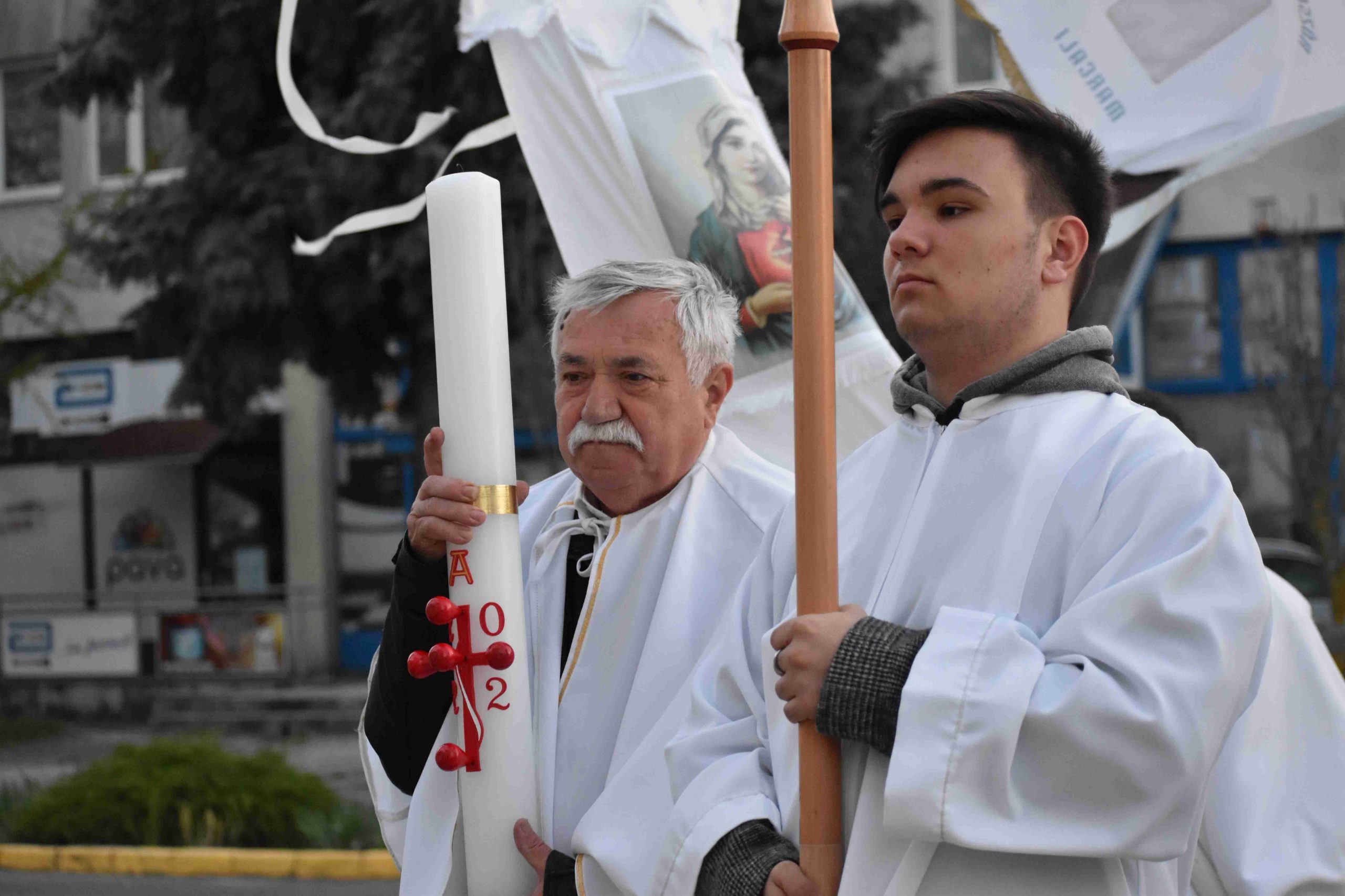 A szentmisét Marcaliban is a hagyományos fáklyás-zászlós húsvéti körmenettel zárták, az imakörök tagjai, valamint a jelenlévő hívek közreműködésével. Az idei esztendőben a körmenet ezúttal rövidített útvonalon, a szépen megújult Rákóczi utca járdáján vezetett egészen az önkormányzatig és vissza a Hősök, illetve a Boldog II. János Pál pápa téren át a plébániatemplomig.