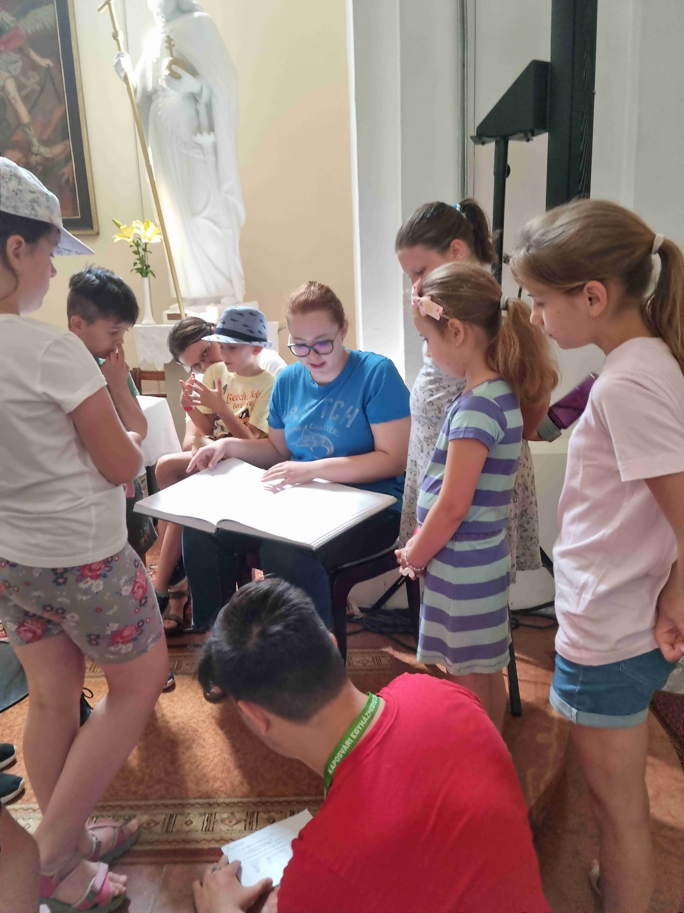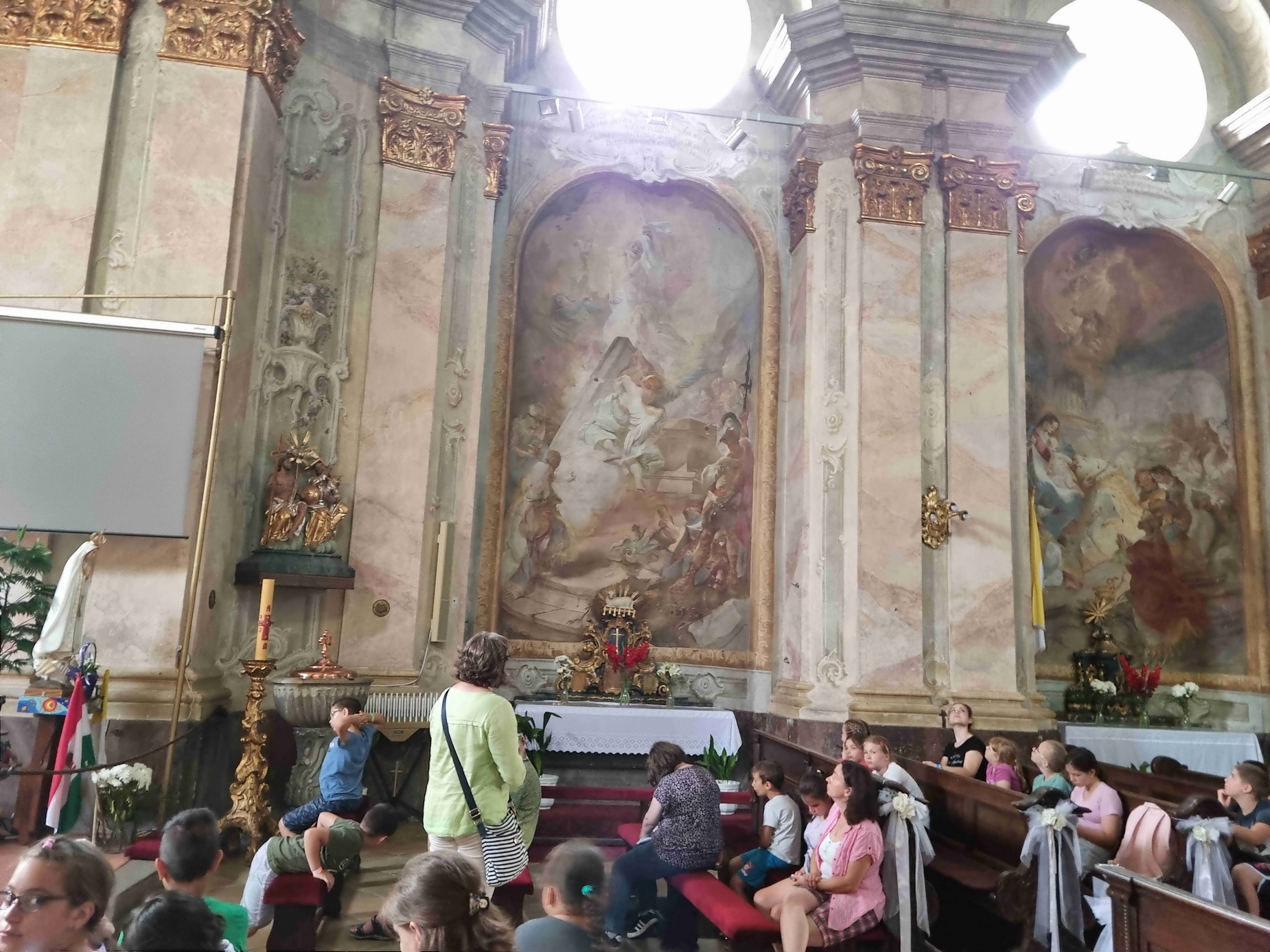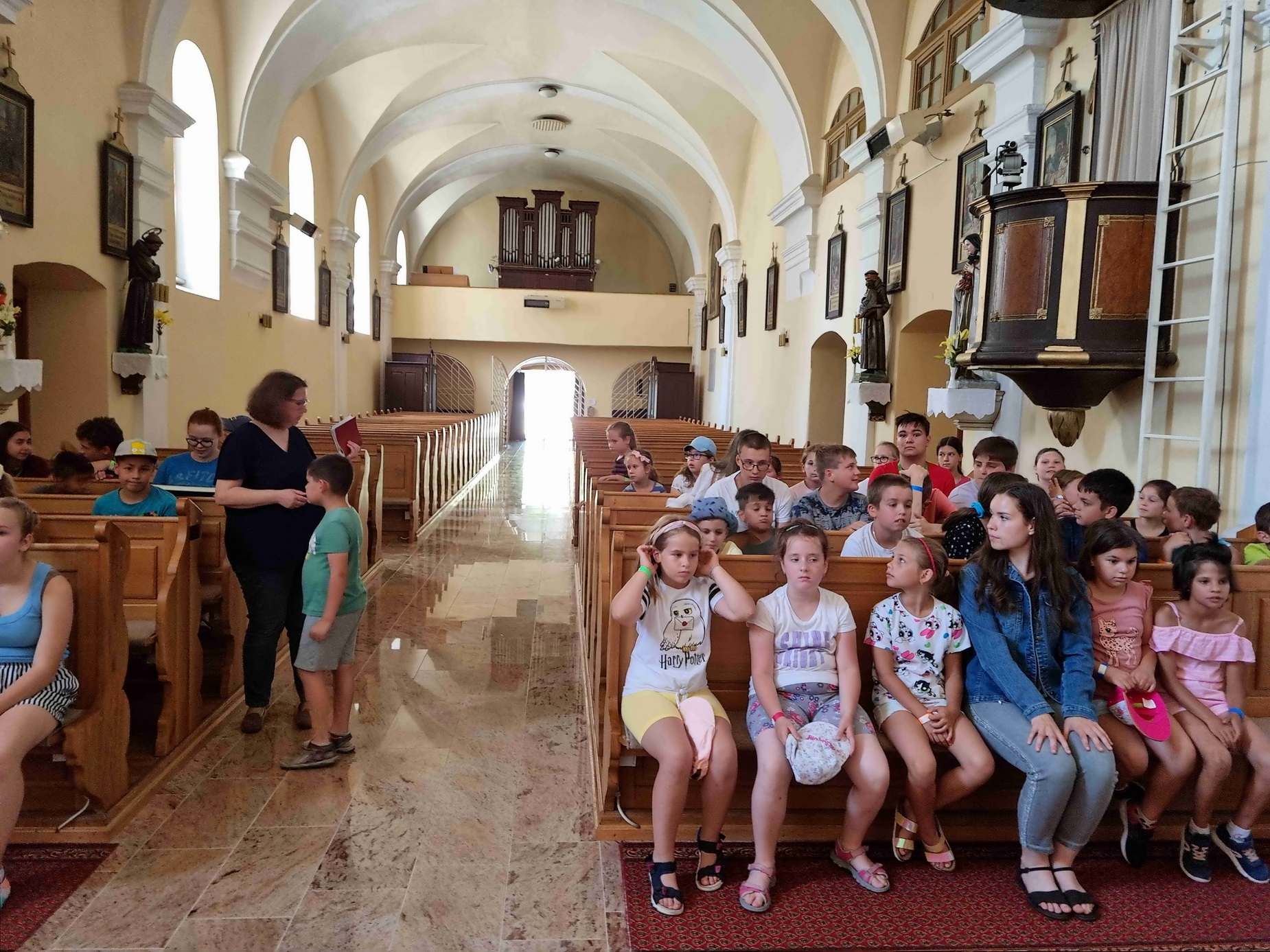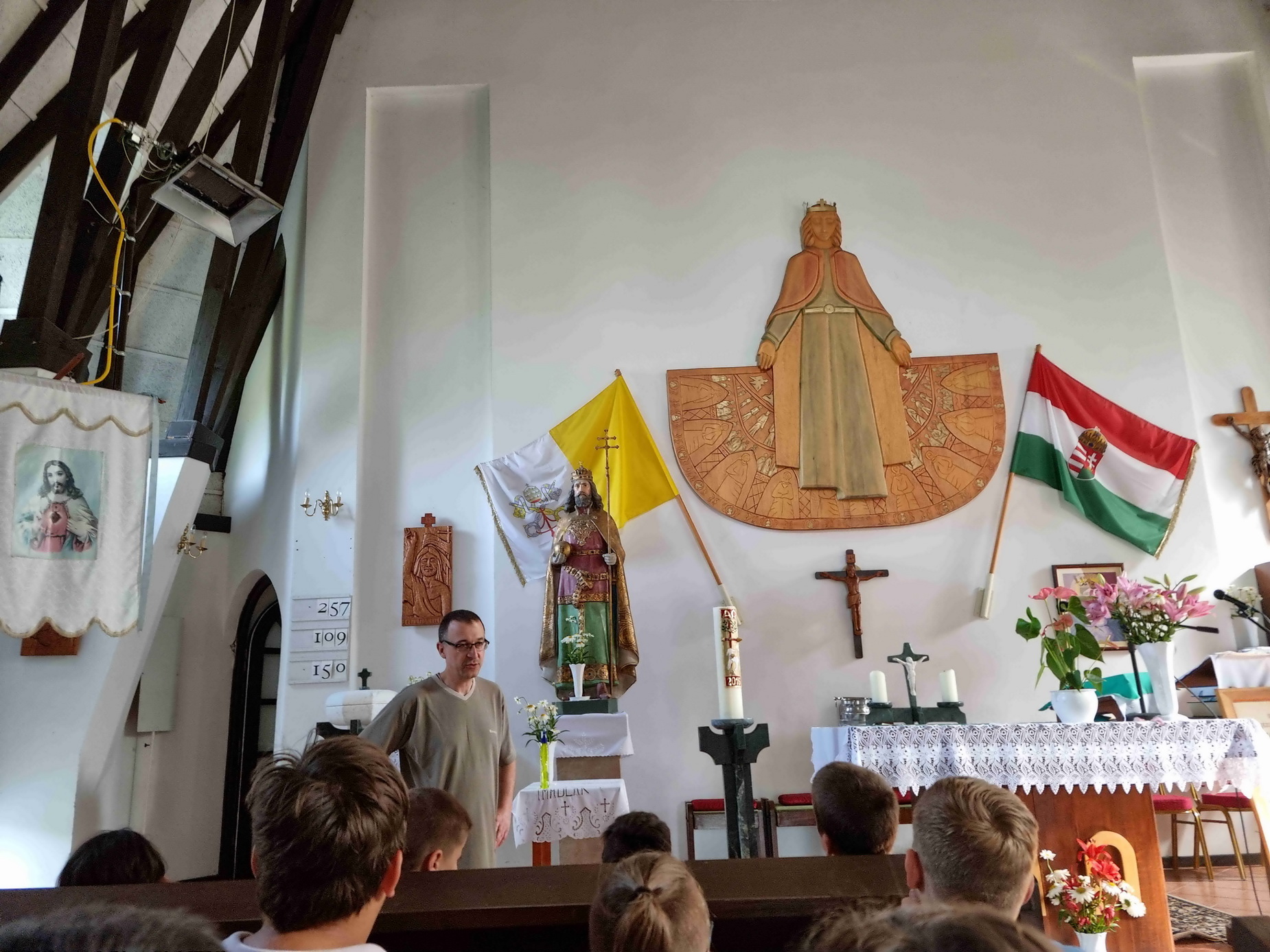 A szerdai napon a város legújabb építésű, a Boldog Gizella templomnál gyülekeztek a hittanosok, akiket reggeli tornával vártak a hitoktatók. Majd pedig bent a templomismertetőt Kiss Kálmán történész, a plébánia irodavezetője mondta el, kiemelve a védőszent és Szent István király szerepét. Végül az altemplomban lévő temetőt szintén megnézhették a kíváncsi gyermekszemek, akik egy imát is elmondtak nemcsak az ott nyugvók lelki üdvéért, hanem mindenki a saját elhunyt hozzátartozójáért is.