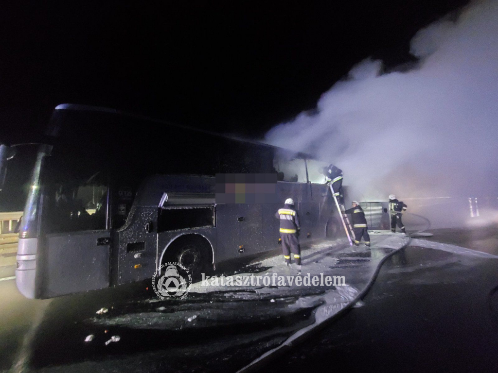 A tűz a motortérből indult, a siófoki hivatásos tűzoltók kiérkezésekor azonban a lángok már az utastérre is átterjedtek. Az egység légzésvédelem mellett átvizsgálta a buszt, ám abban már senkit sem találtak, a busz utasai valamennyien időben le tudtak szállni az égő járműről. A tűzoltóknak csaknem fél óra alatt sikerült teljesen eloltani a lángokat. A busz negyvennyolc utasa a mentesítő járat megérkezéséig a kőröshegyi faluházban töltötte az éjszakát. A forgalom hétfő hajnalban indulhatott meg az érintett szakaszon.