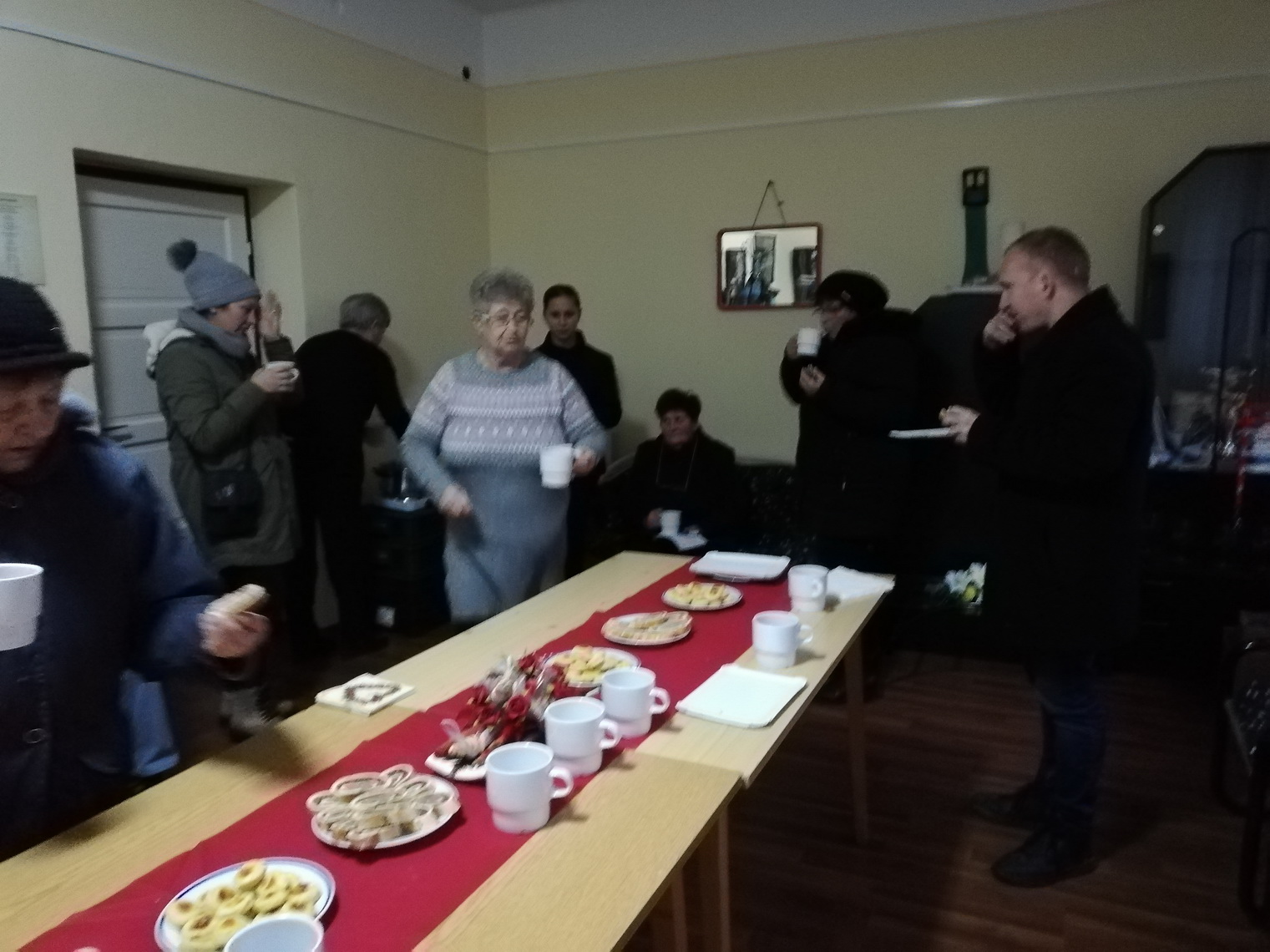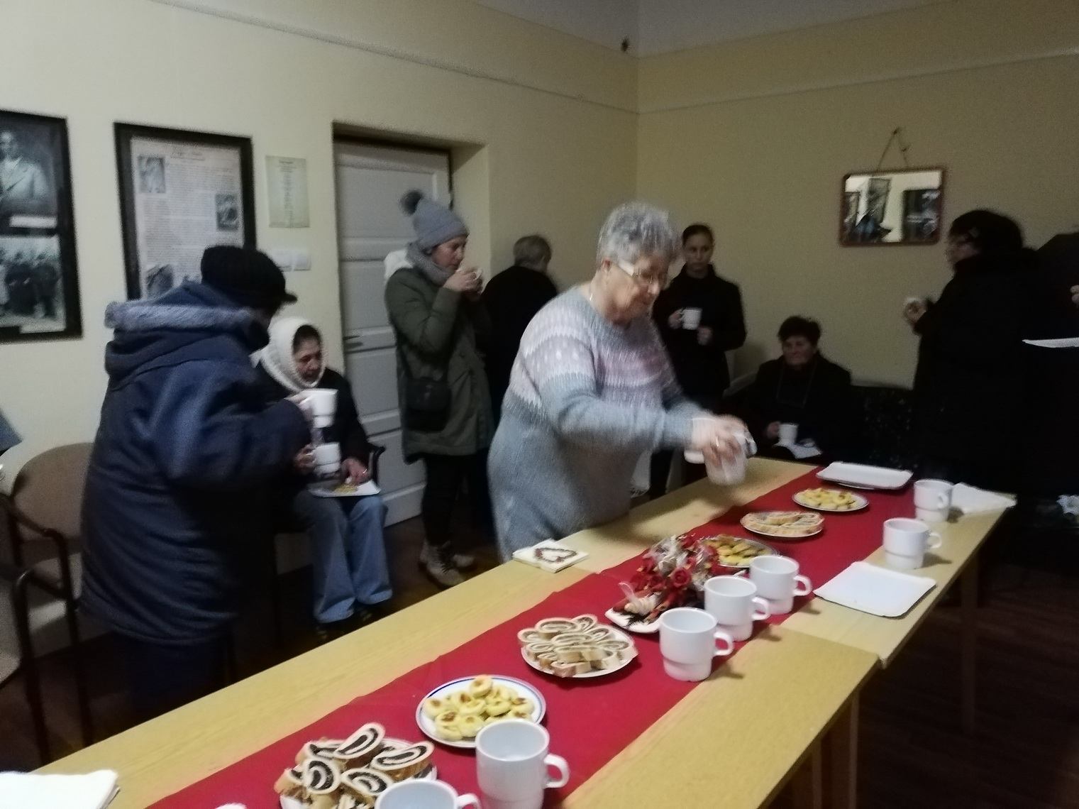 Ezt követően meghitt beszélgetés és teázás közben elfogyasztották Dr. Mészáros Gézáné finom krumplis pogácsáját és a felajánlásból érkezett diós és mákos bejgli szeleteit.