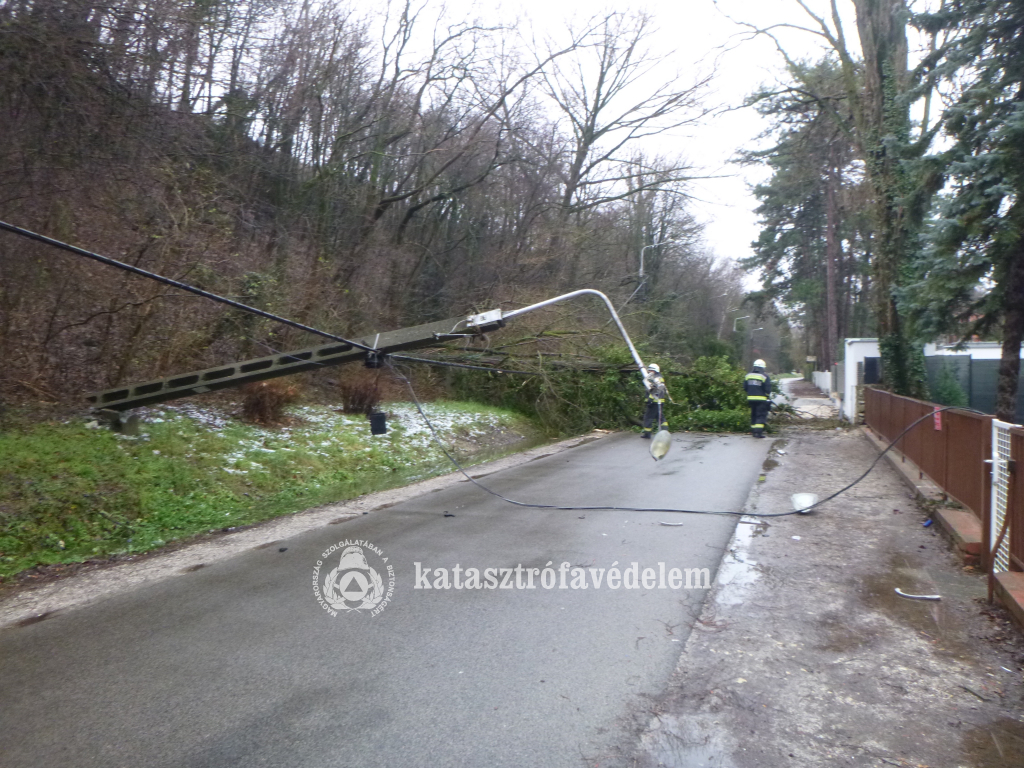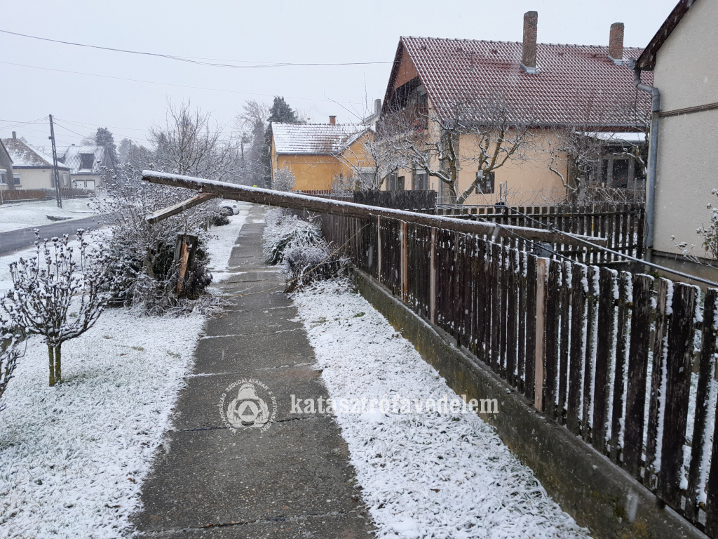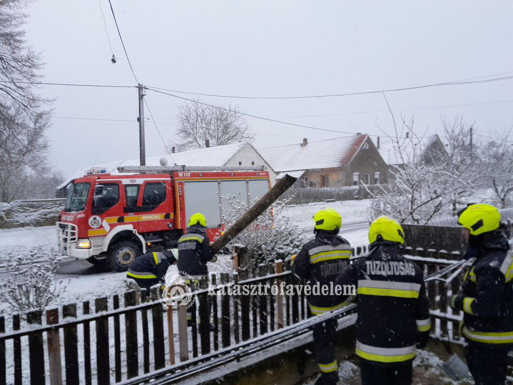 Mesztegnyőn távközlési oszlopok dőltek ki. Az egyik fa oszlop egy családi ház kerítésre, míg a másik az úttestre borult. A marcali hivatásos tűzoltók dolgoztak a károk elhárításán.