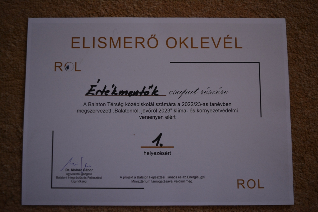 A Marcali Berzsenyi Dániel Gimnázium 10.A osztály Értékmentői az 1. helyen végeztek.