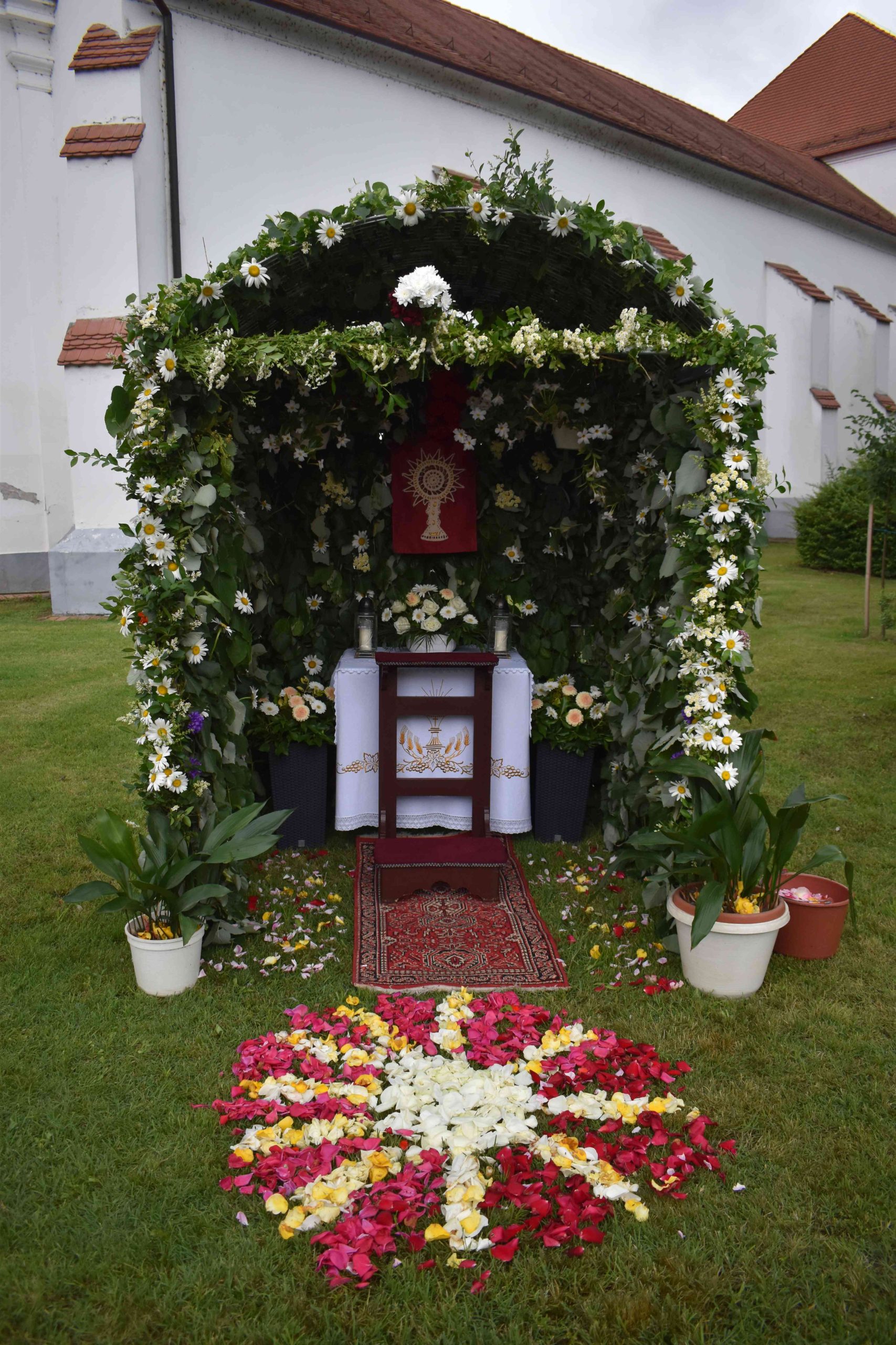 Az idei évben ismét kettő kültéri lombsátor készült.Afém-szerkezet összeállítását Király Jenő templomatya irányította;míg az ágakkal való díszítést Gelencsér Róbert világi elnök és a Tóth Péter vezette önkéntes csapat – köztük fiatalokkal – végezte. A virág-díszítésben pedig az egyházközség templomi közösségeinek aktívabb tagjai – a plébániatemplom, a Boldog Gizella, valamint a gombaiak – segítettek.