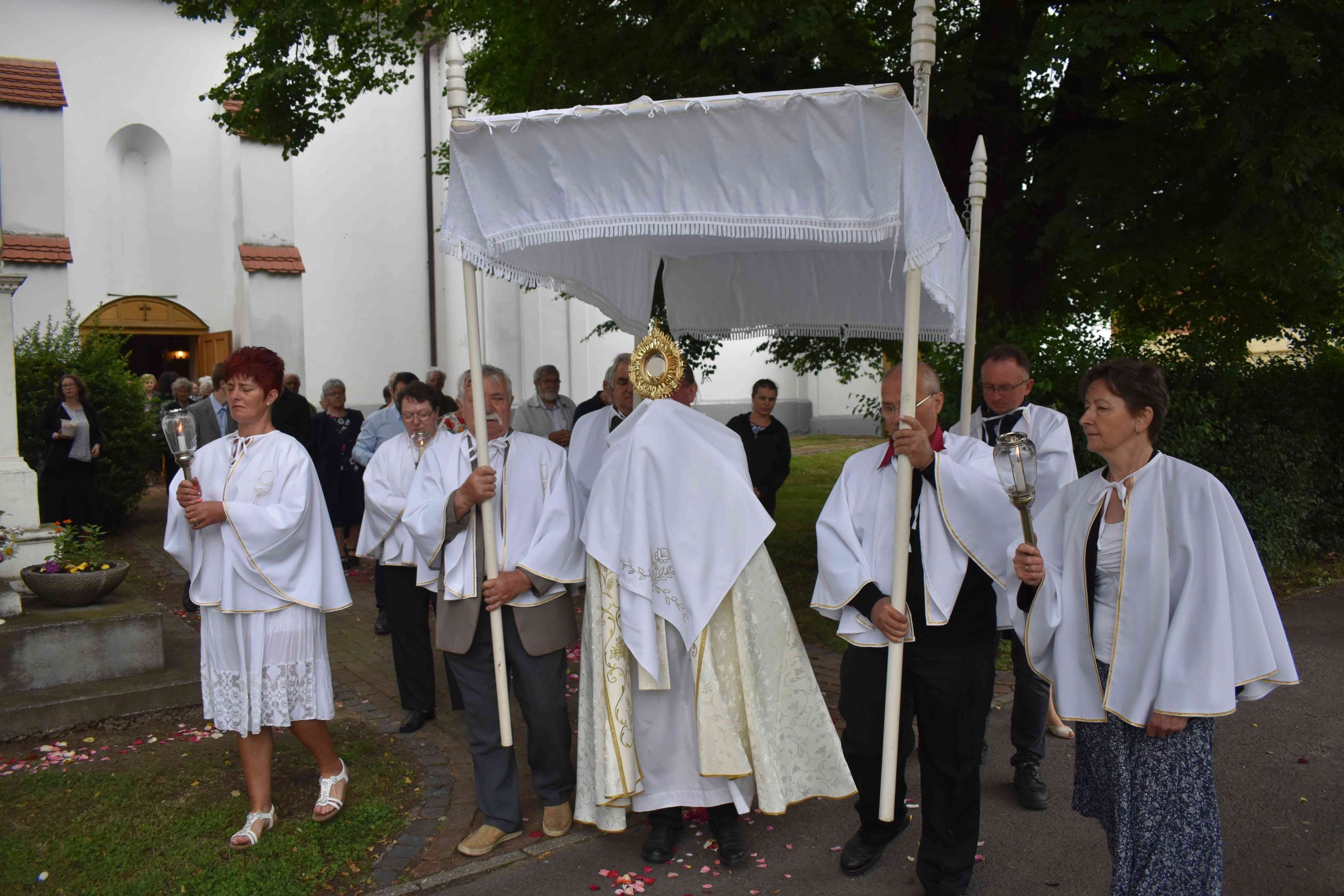A szentmisét követően tartották meg a hagyományos úrnapi körmenetet, melyen ezúttal Galambos Ferenc mesztegnyői plébános vitte az Oltáriszentséget és végezte el az ilyenkor szokásos liturgiát.A menet a templom déli ajtaján vonult ki, és a járdán haladva a templom főbejárata melletti, illetve a plébániahivatalnál lévő tiszafa előtti lomsátrakhoz vonult végig a templomi zászlókkal. Ferenc atya az Oltáriszentséggel pedig áldást adott az égtájak felé a városra és a lakóira is.
