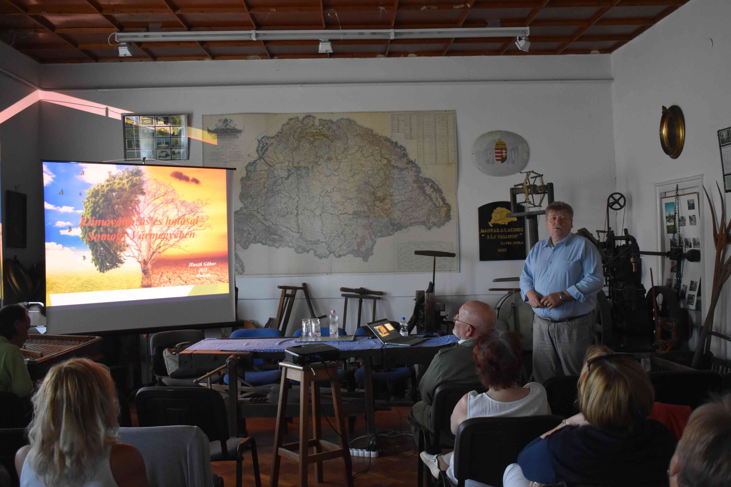 Majd pedig Huszti Gábor, a Somogy Vármegyei Közgyűlés alelnöke következett „A megváltozott klíma és mi, Somogyiak” című, szintén vetített-képes előadásával. Kiemelte, hogy az ENSZ klímakutatással foglalkozó szervezete szerint ebben az évszázadban a felmelegedés drámai méreteket ölt. A század végére az átlag hőmérséklet akár 5,8 fok C-al nőhet. Ábrákon mutatta be Somogy veszélyeztetett településeinek számát. Már most, napjainkban sok települést érint az ár-, a belvíz, a rendkívüli időjárás (villám-, jégesők), vagy éppen a földalatti veszélyforrások. Példákkal és képekkel illusztrálta a rendkívüli esőzések következtében keletkezett vízátfolyásokat, amikor utakat kellett lezárni az árhullám miatt. A klímaváltozás miatt, a savas-, jeges-, ónos-, sivatagi homok esők következtén magas az erdők pusztulása is, ami Somogyban is jelentős méreteket ölt ma már. Miközben kihalással fenyeget bizonyos állatfajokat ez a változás, közben újabb, idegen fajok is megjelennek. Ezután részletesen beszélt még a Somogy vármegyét érintő éghajlat változási problémakörökről (átlaghőmérséklet, csapadékváltozás, szélsőséges időjárás). Kihangsúlyozta a várható megyei hatásait is. Kiemelte, hogy a Somogy Megyei Közgyűlés 2018. március 20-án, az országban elsőként fogadta el a megye Klímastratégiáját: a specifikus adaptációs célokat; a klímatudatossági és a szemléletformálási célkitűzéseit. Huszti Gábor végül érzékletes példákkal vázolta fel a lehetséges megoldásokat, valamint a takarékoskodási módszereket.