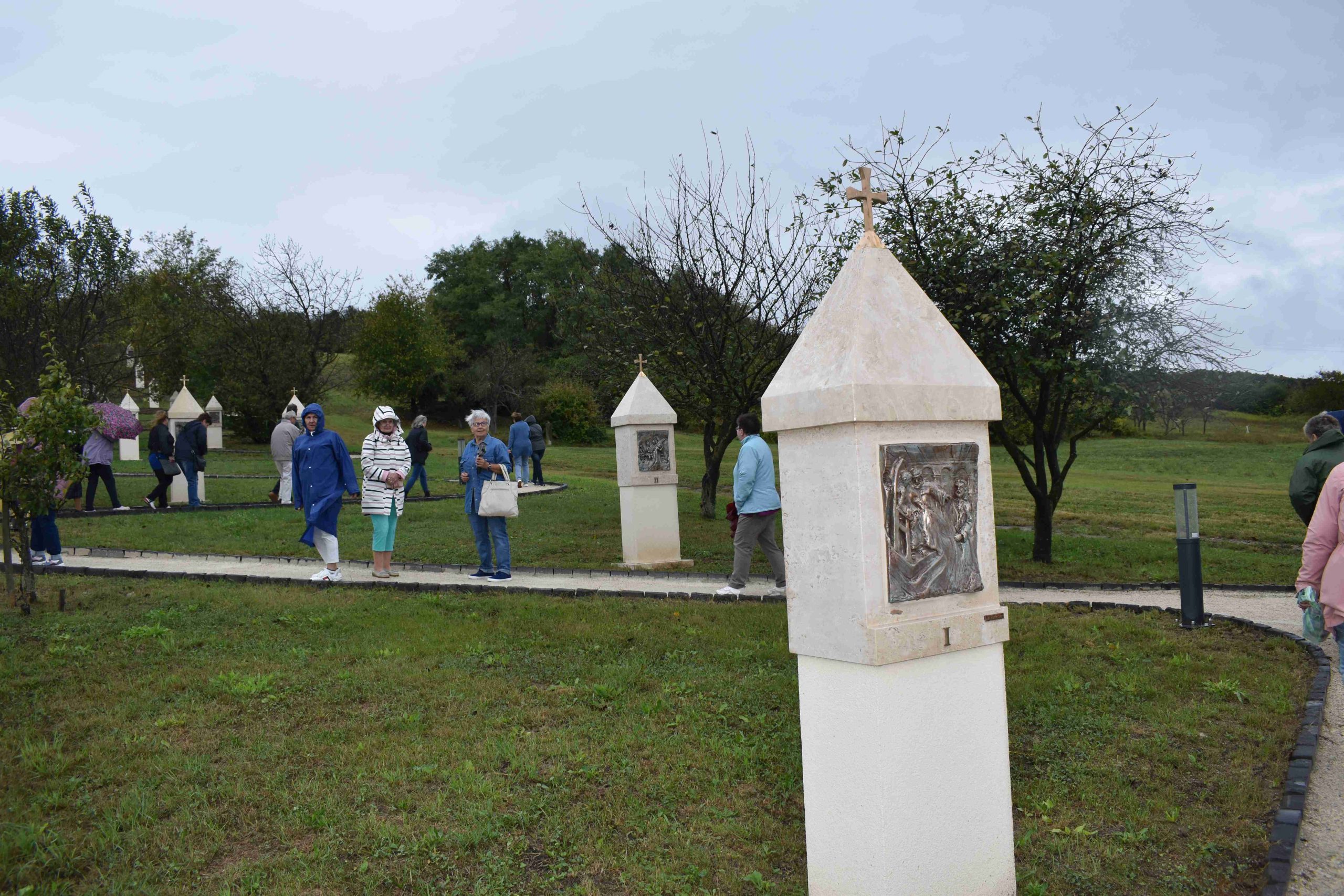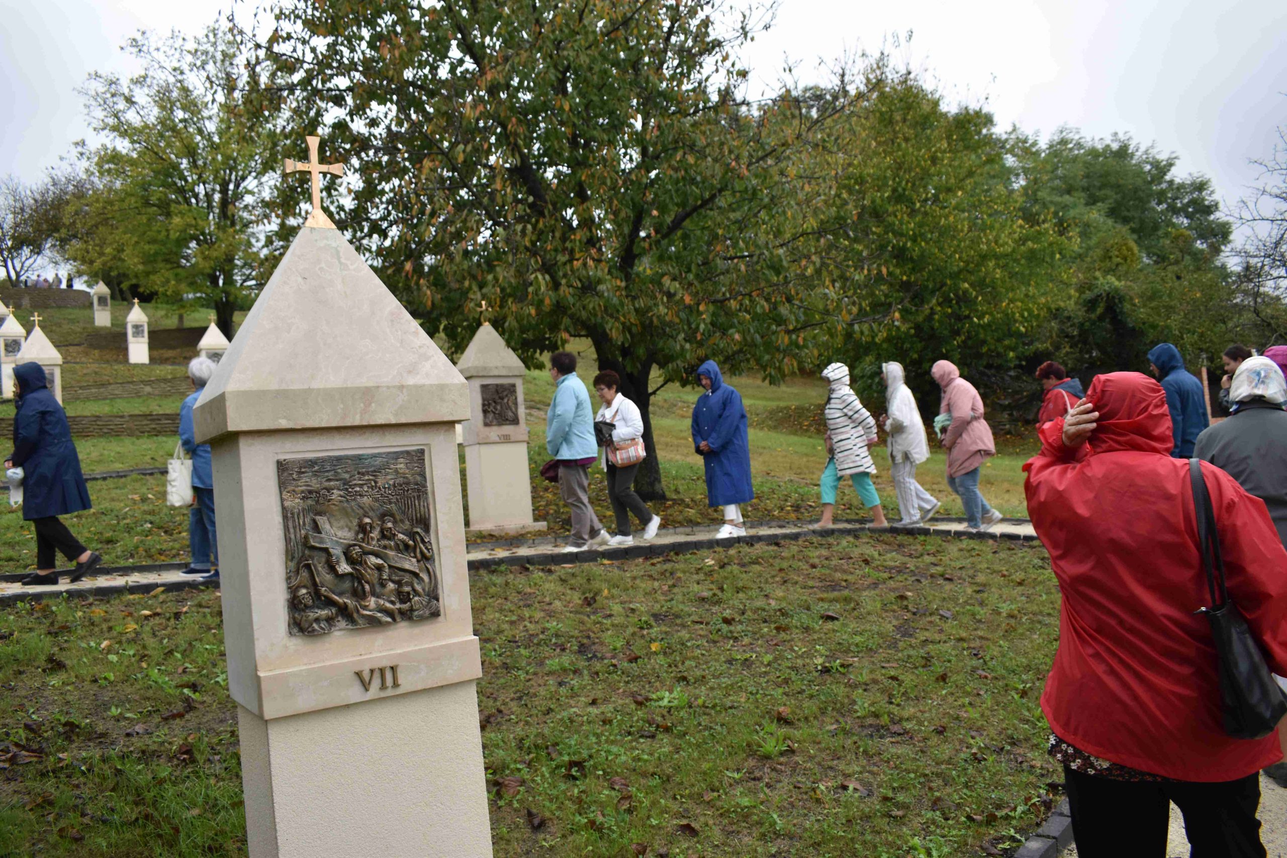 A délelőtti program másik, ezúttal már az egyik szakrális célpontja az egregyi kálvária volt. Az akkor még csak alig szemerkélő esőben Tomanek Ferenc Áron marcali plébános atya vezetésével a zarándokok elvégezték a keresztutat, majd ennek befejezése után kissé megáztak a lefelé vezető úton, a záporesőben, amíg leértek az autóbuszhoz. Ez a kálvária, mint a legtöbb keresztút, a domb alján indul, és Krisztus szenvedéseinek tizennégy stációját felvonultatva kanyarog fel egy magaslaton állított keresztig. A sétány hossza kb. 300 méter, a szintkülönbség a kiindulási pontjától a keresztig pedig 23,5 méter. A kálvária útja az Árpád-kori templom irányába kanyarog. Egyszerű kialakítására a mértéktartás a jellemző. A sétány elemei természetes anyagokból készültek, a környezetében álló fák árnyékot kínálnak, néhány szakaszán pedig lehetőség van megpihenni, elmélyülni. A kálvária készítésénél felhasznált anyagok és a tér kialakítása jól illeszkedik a tájba. A stációk művészi alkotásait Túri Török Tibor készítette. Az ünnepélyes átadása 2022. július 8-án történt, melyet Udvardy György veszprémi érsek áldott meg és szentelt fel.
