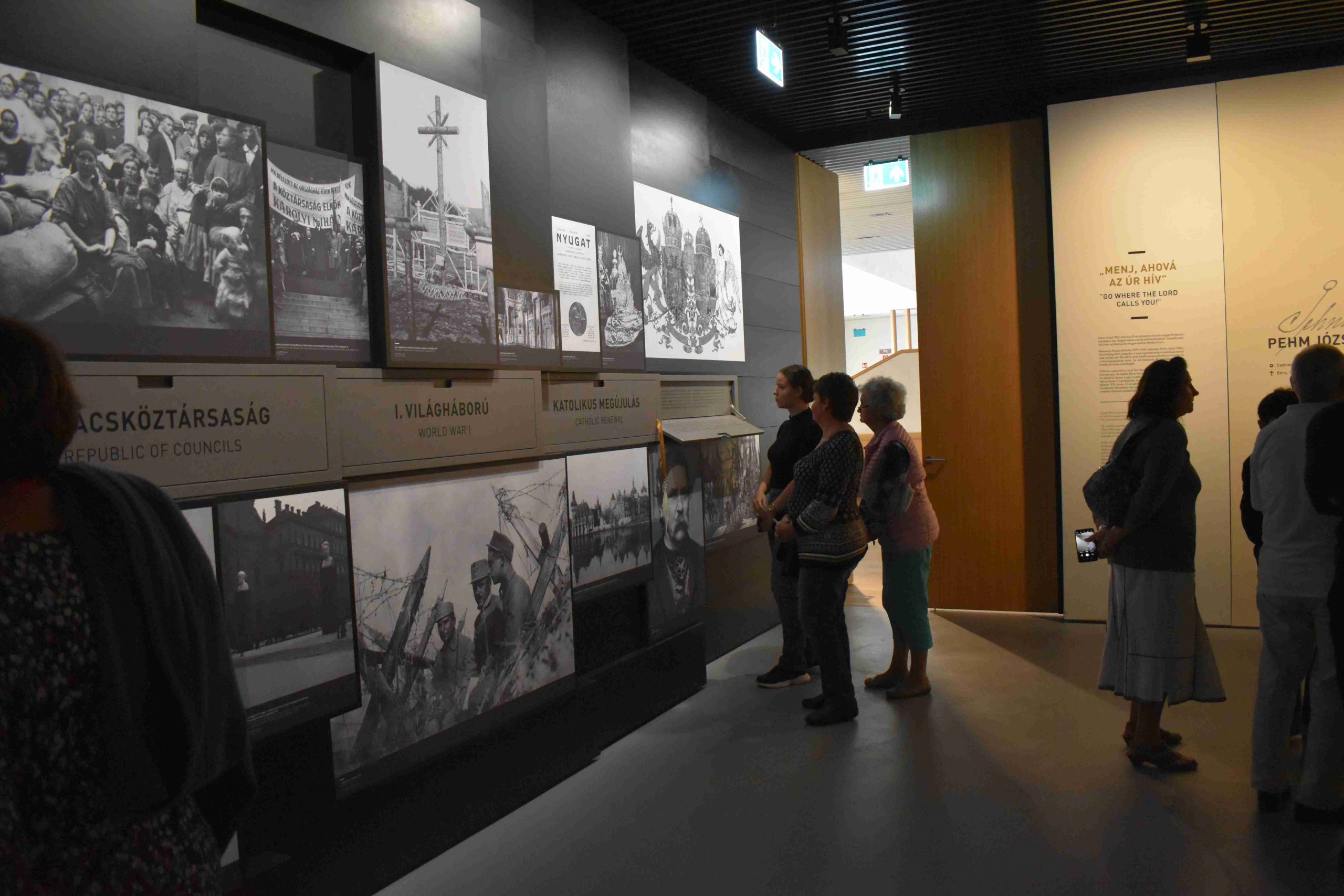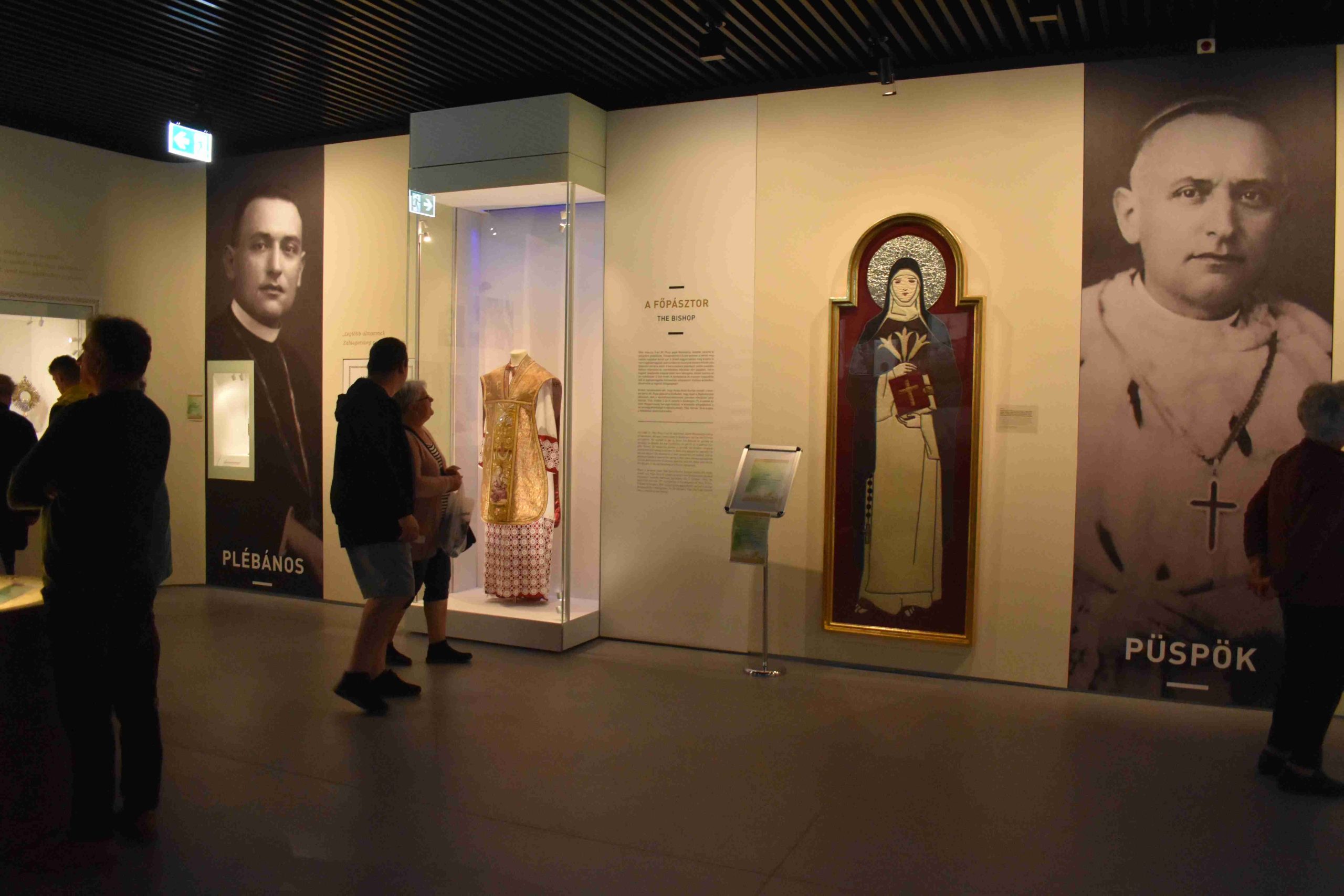 A KÉSZ Marcali Csoport zarándoklatának délutáni fő programja a Mindszentyneum megtekintése volt. Az ismét szakszerű tárlatvezetés mellett az első emeleten Mindszenty József bíboros, hercegprímás, esztergomi érsek életútját bemutató kiállítás láthatták, melynek legfőbb célja és üzenete megismertetni a bíboros személyét, a 20. század magyar történelmének és egyháztörténetének egyik legmeghatározóbb, ikonikus alakját, akinek áldozatvállalását az elmúlt évtizedek politikai beágyazottságának függvényében meglehetősen változatosan értékelték. A kiállításban ezt a rendszerváltás előtti és körüli egysíkúbb, elvont kategóriákban gondolkodó Mindszenty-kánont árnyalják; a főpap történeti szerepvállalásának sokrétű érzékeltetésén túl tehát az EMBER bemutatására is fókuszálnak. Mindszenty nem csupán az elmúlt évszázad képviselője –a fiatalabb generációkat is éppúgy megszólíthatja. Mindszenty József életútját, illetve tiszteletét a legkorszerűbb egyedi installációs eszközökkel és technikai háttérrel tárják a látogatók elé. A kiállítás kevésbé tárgy-, mint inkább élményközpontú; célja, hogy a megfelelő mélységű információ-átadáson túl a látogatót további egyéni kutatásra, olvasásra sarkallja életkortól és iskolázottságtól függetlenül. Mivel a kiállítás több – egymástól részben eltérő igényszintű és tudású – generációt szólít meg, a multimédiás tartalmak is ehhez igazodnak majd: egy fiatalosabb, lendületesebb tudásanyagot, valamint elmélyültebb, gazdagabb bázisú, esetleges problémafelvetéseket is tartalmazó információegységeket egyaránt magukban foglalnak.