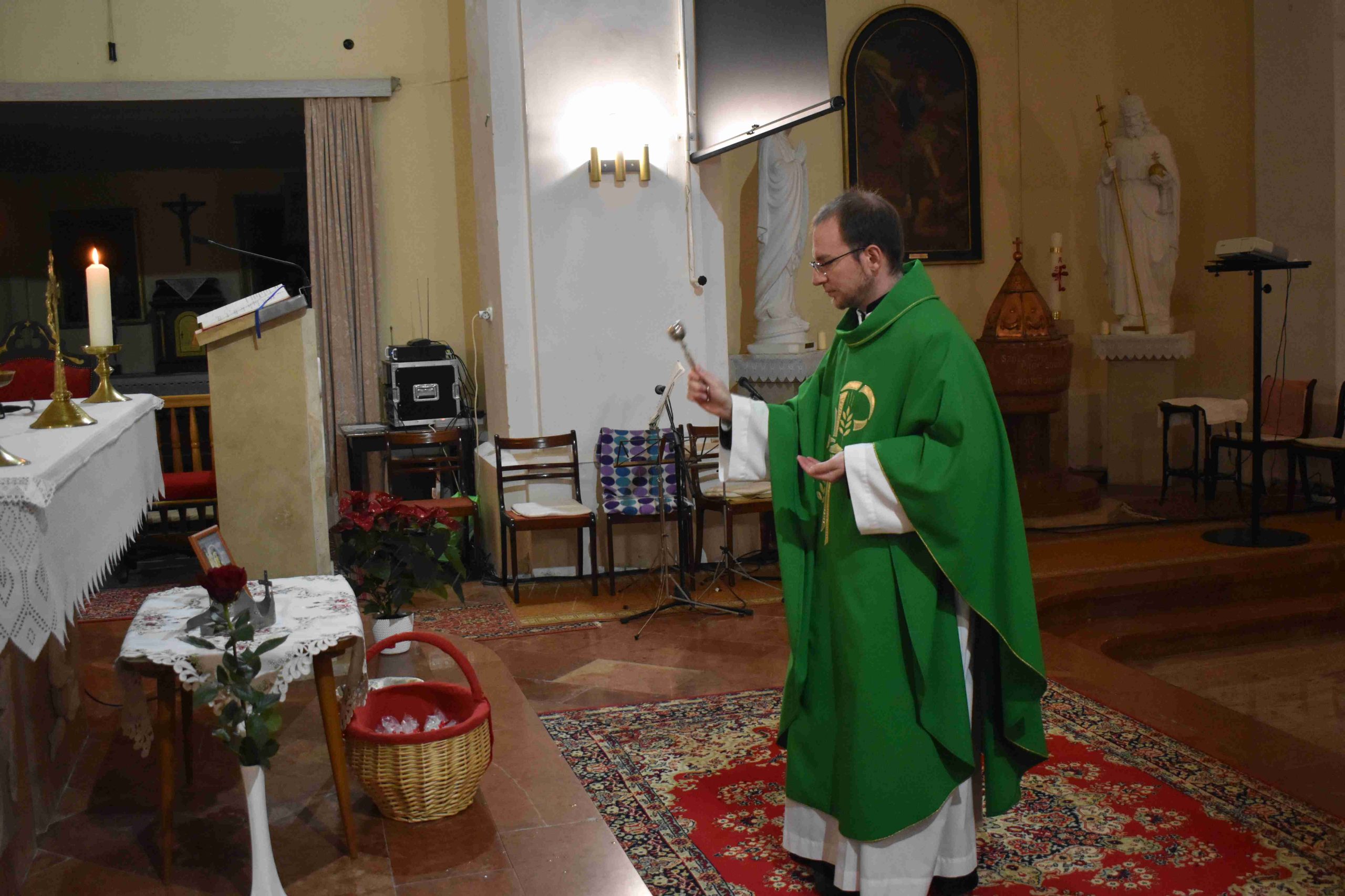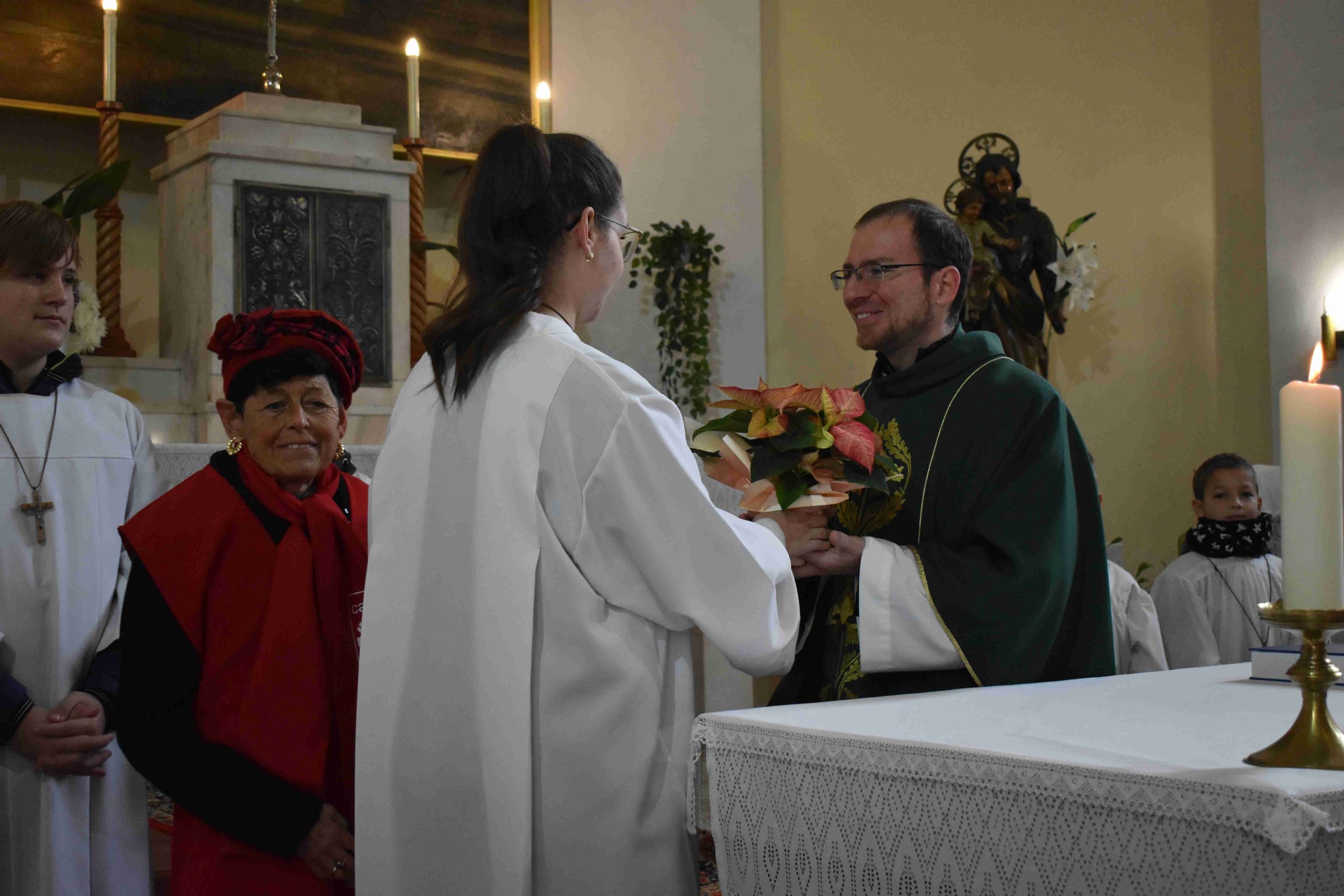 A szentmise végén, a kenyérmegáldás után, Sávoly Andrea, a Marcali Karitász Csoport vezetője és Tóth Eszter Ágnes egy cserép virággal gratulált Tomanek Ferenc atyának az egyházmegyei karitász kitüntetéséhez.