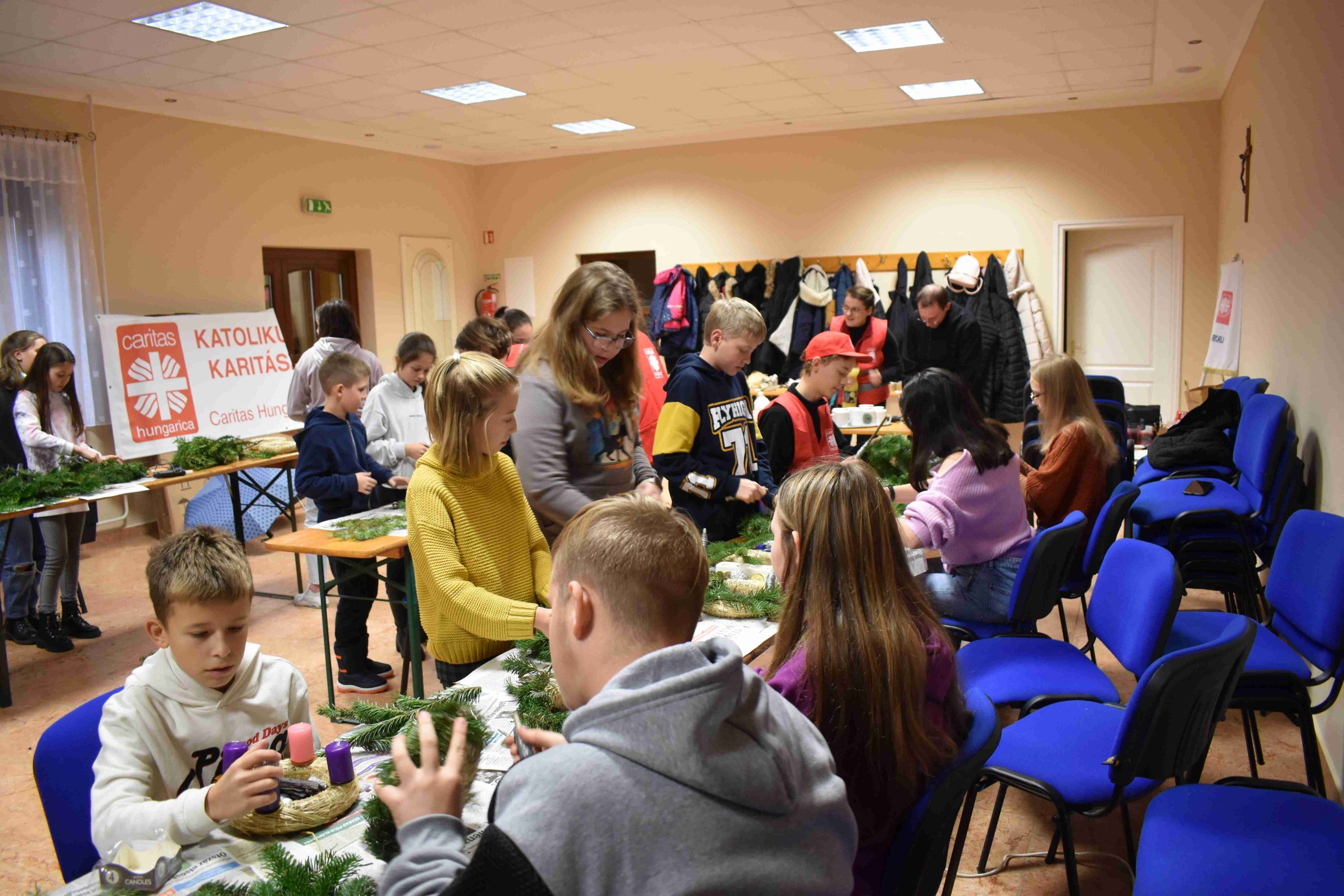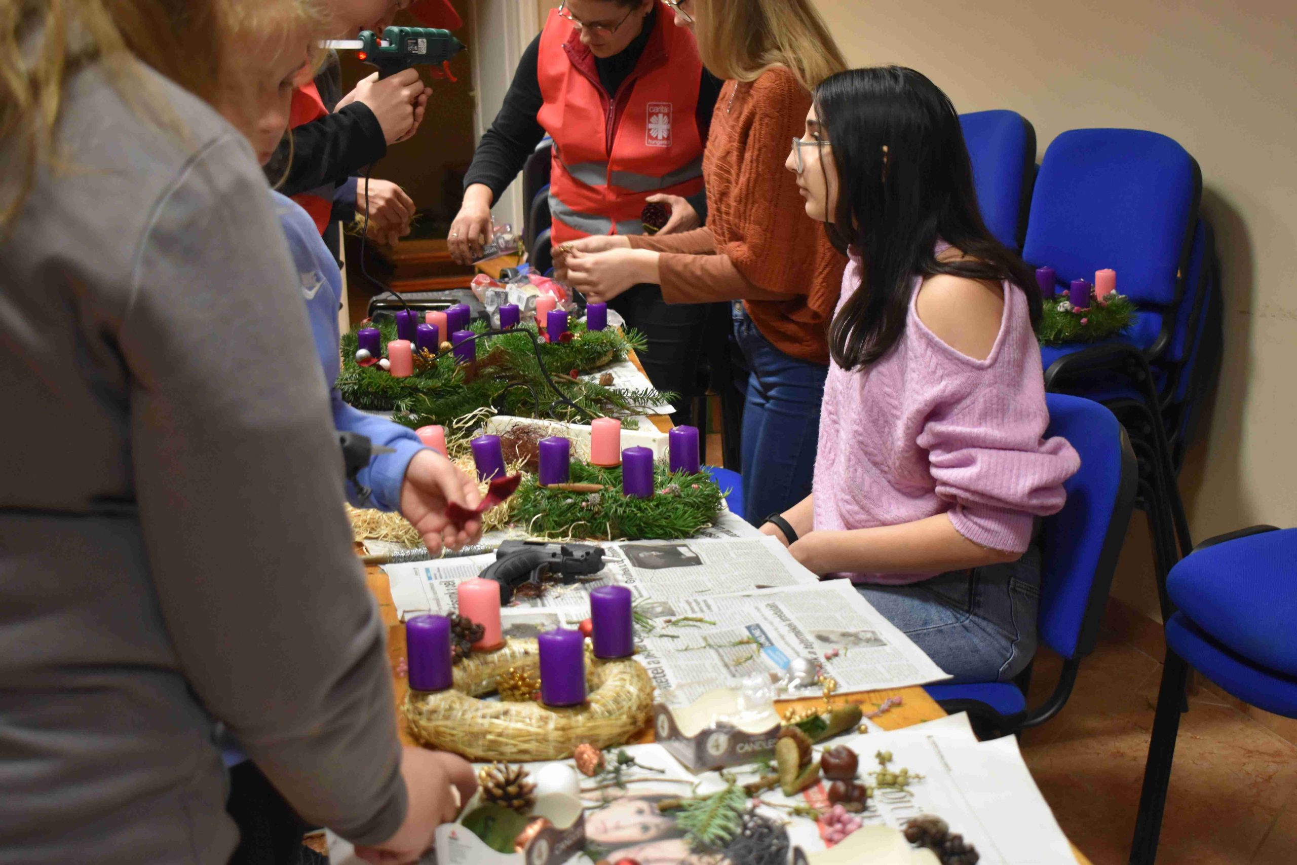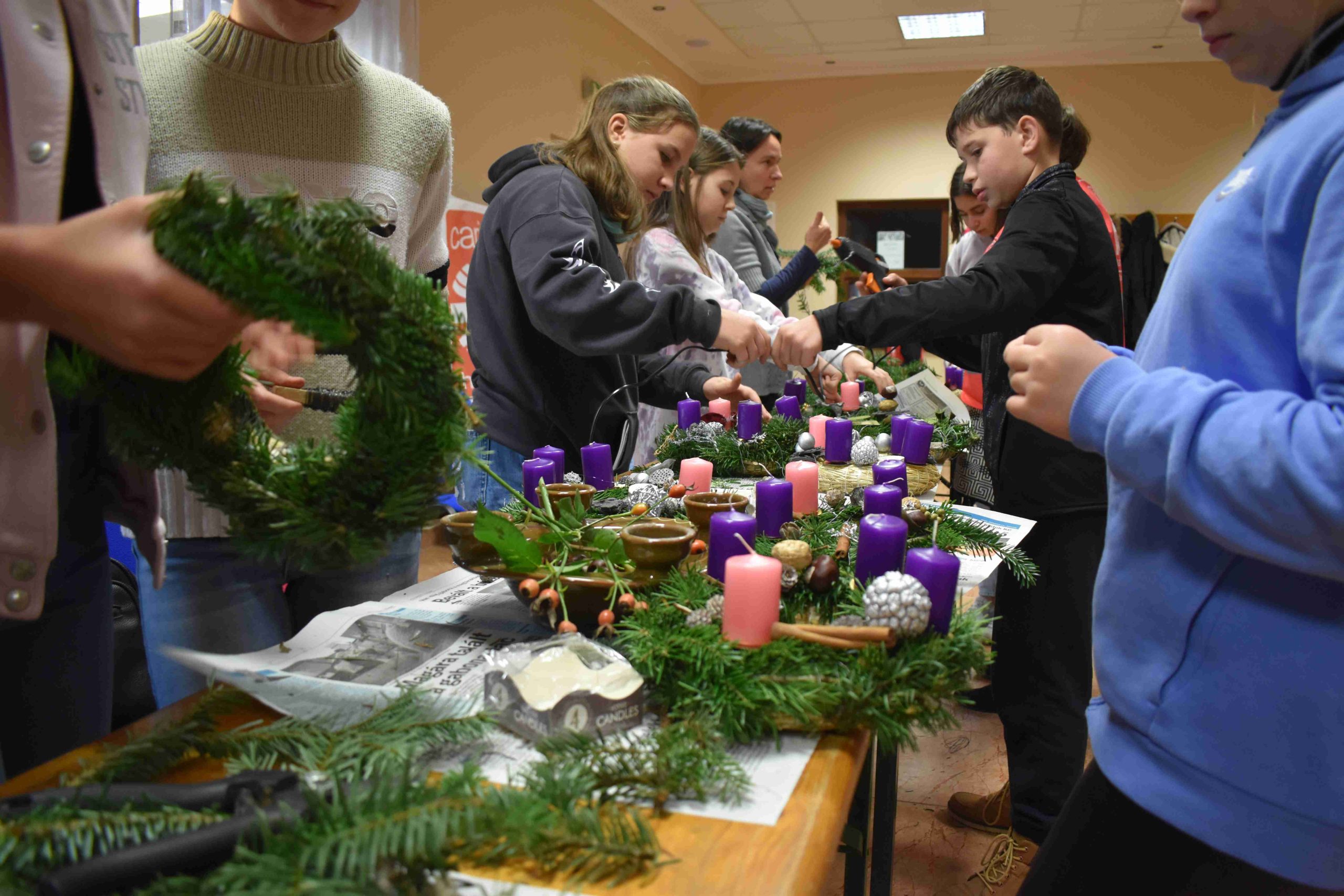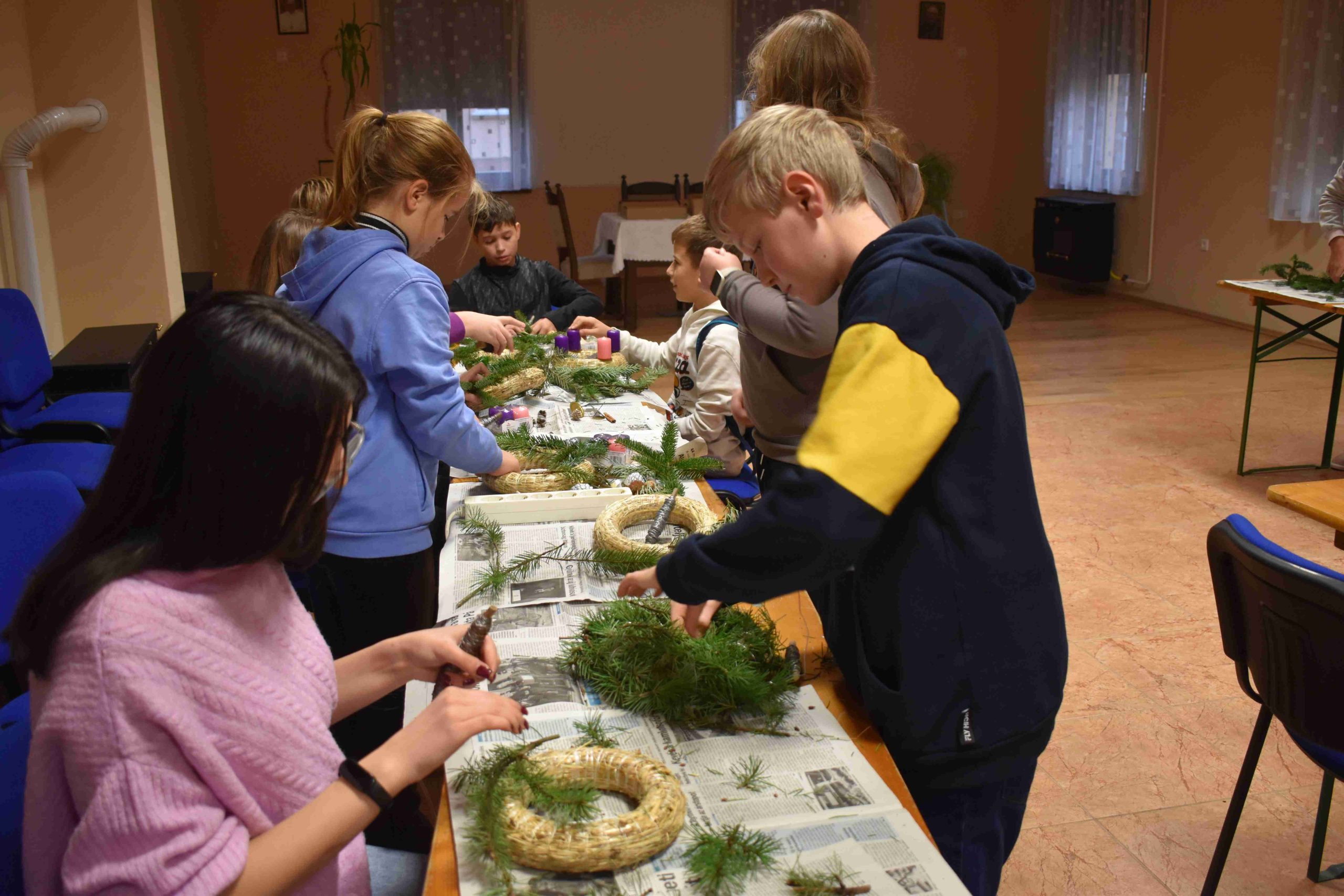 2023. december 2-án, szombaton, délután 14.30 órától az X-ház (Dózsa u. 3.) nagytermébe ádventi koszorúkészítésre hívták a hittanos diákokat a karácsonyra való előkészület részeként.