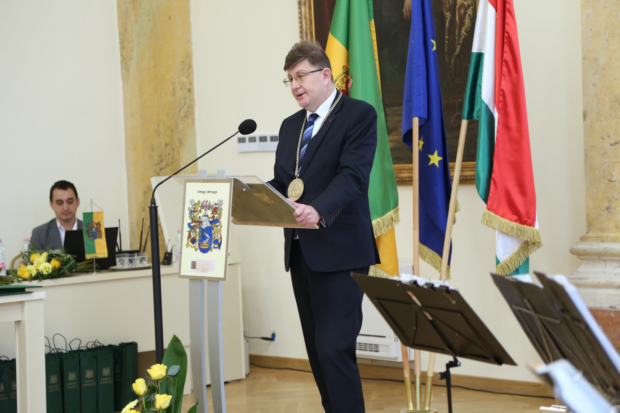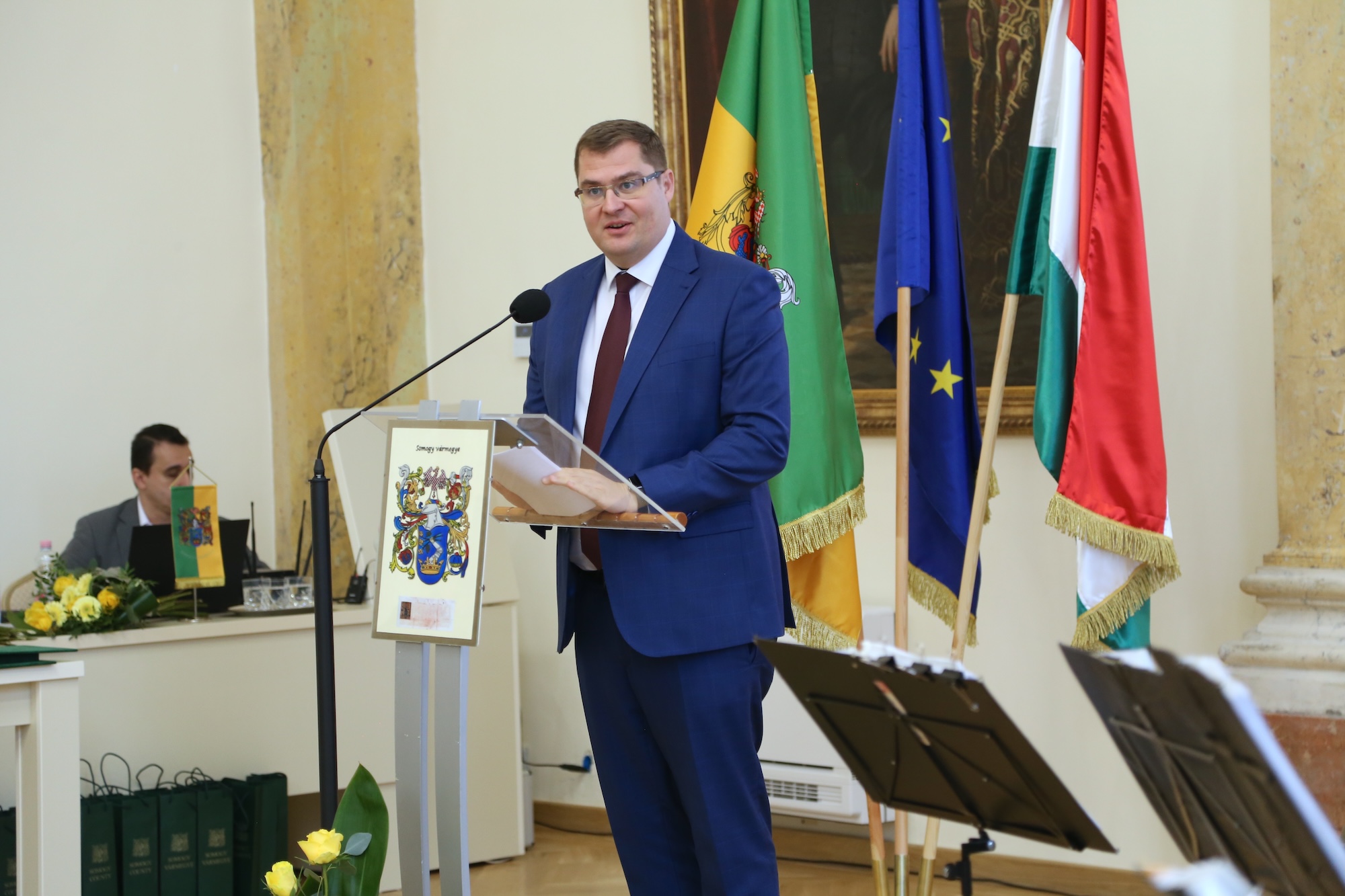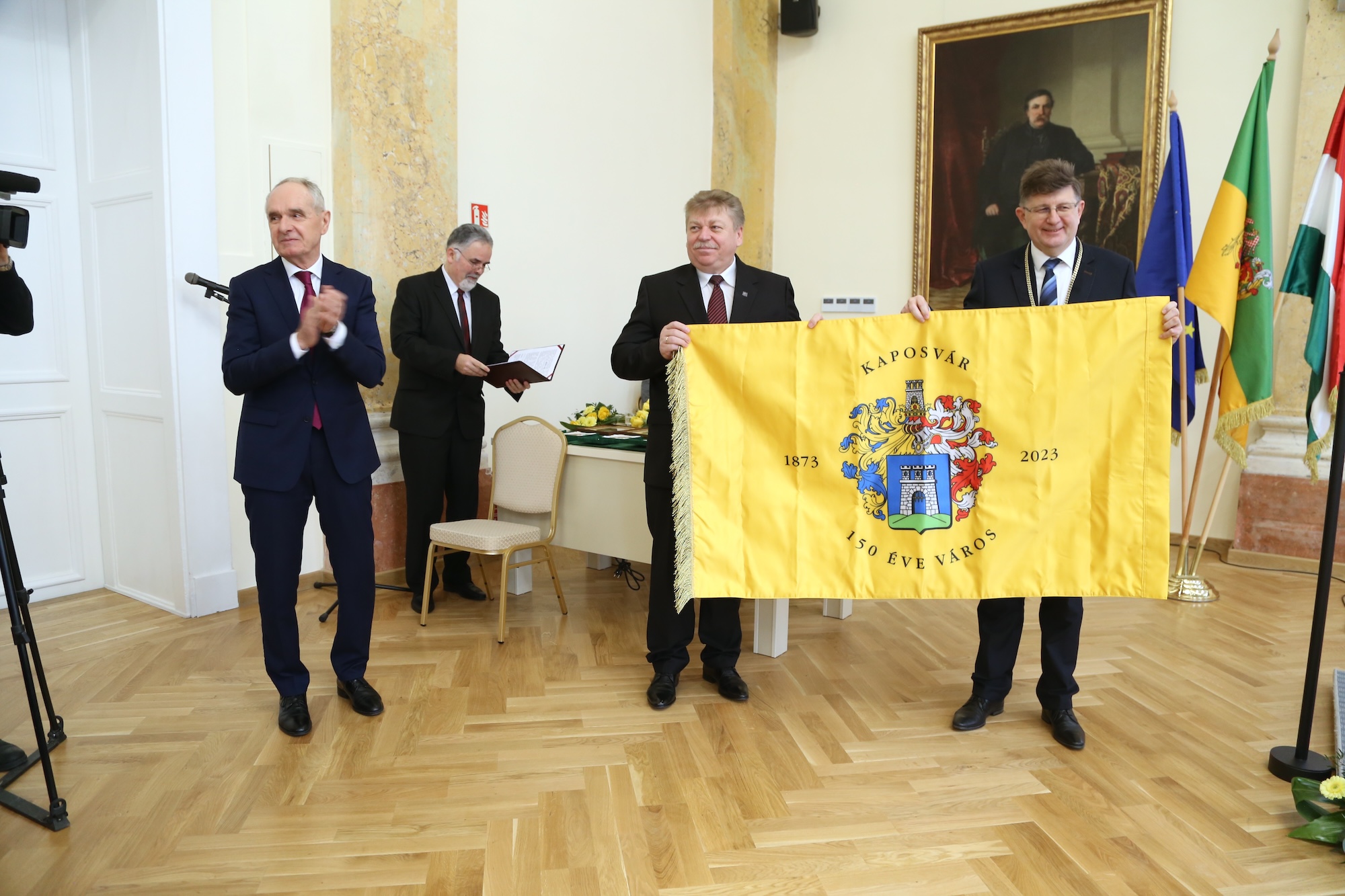 A házigazda város méltatása során hangsúlyozta: “Mindannyian tudjuk, ha Kaposvár fejlődik, azzal Somogy is előrébb lép, s ha vármegyénk 245 települése fejlődik, az pozitív hatással van a vármegyeszékhely gazdaságára is. A területfejlesztés során is közösek céljaink, hiszen a mostani uniós pénzügyi ciklusban szorosan együttműködünk. Nem újkeletű ez az együttműködés, a közös munka főpróbájának is nevezhetjük az egykori Levéltár épületének megújítását. Nemrég adtuk át azt az ikonikus épületet, mely ritka kincseket őrzött múltunkból, köztük a vármegye címeres levelét is. Az összefogás ékes példája ez a beruházás, mely azt bizonyítja, ha vármegye és székhelye együtt gondolkodik, együtt cselekszik, akkor nem lehetnek elérhetetlen álmok.”