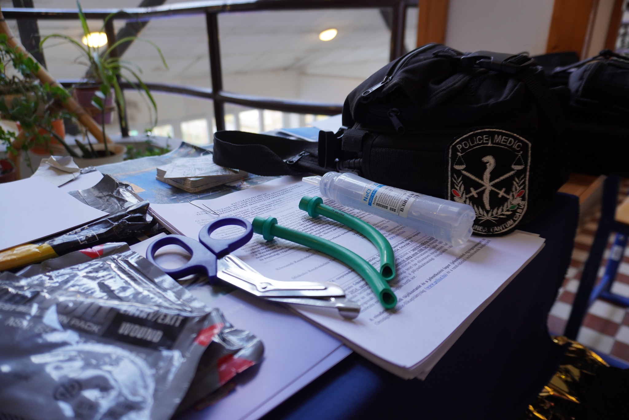 Lehetőség volt a mentőautó eszközeinek a megismerésére és életmentési gyakorlatokat végezni. Megnézhették tanulóink a betegmegfigyelő monitor működését, az AB-CD táskát és tartalmát. Megfigyelhették és kipróbálhatták, gyakorolhatták az újra élesztést. Sokan megismerkedtek a paraméterezéssel; így a vércukorszint, a vérnyomás és véroxigénszint mérőeszközeinek a használatával és a mért értékek jelentőségével, határértékeivel.
