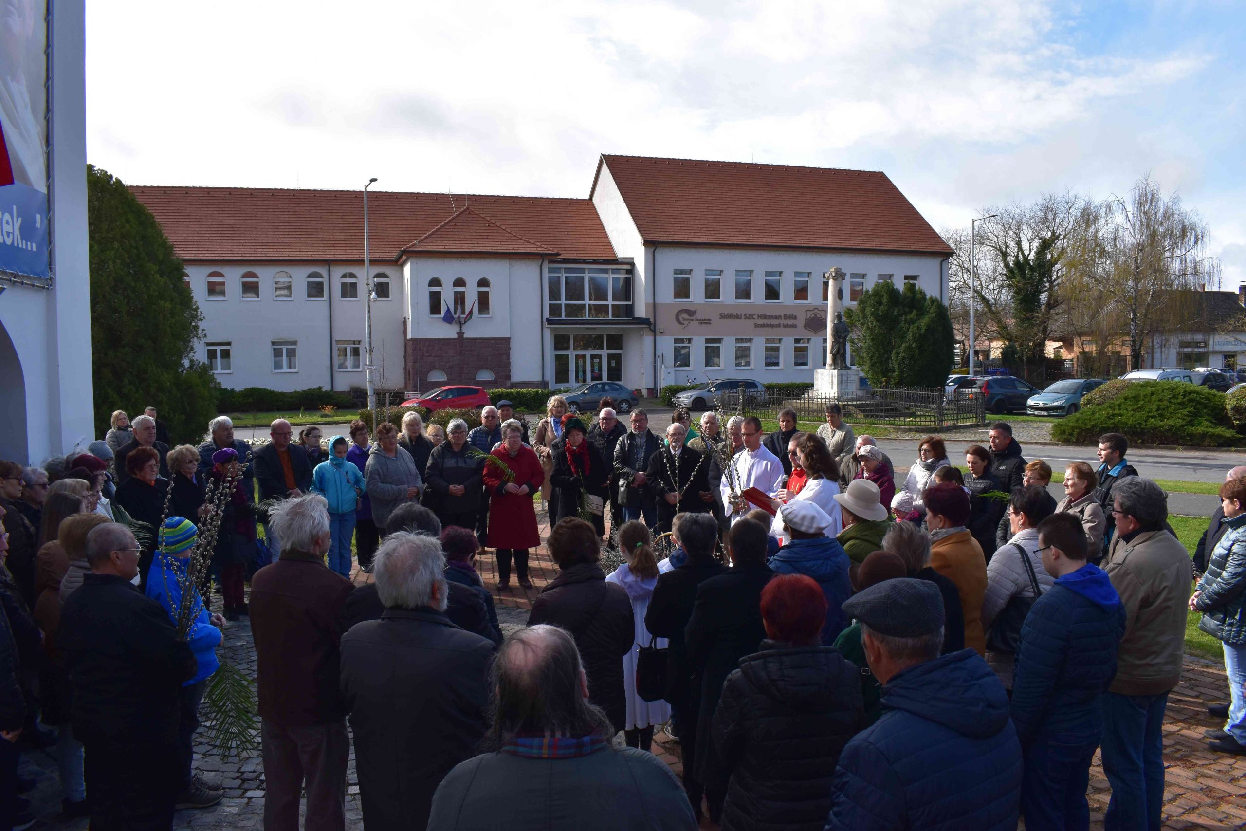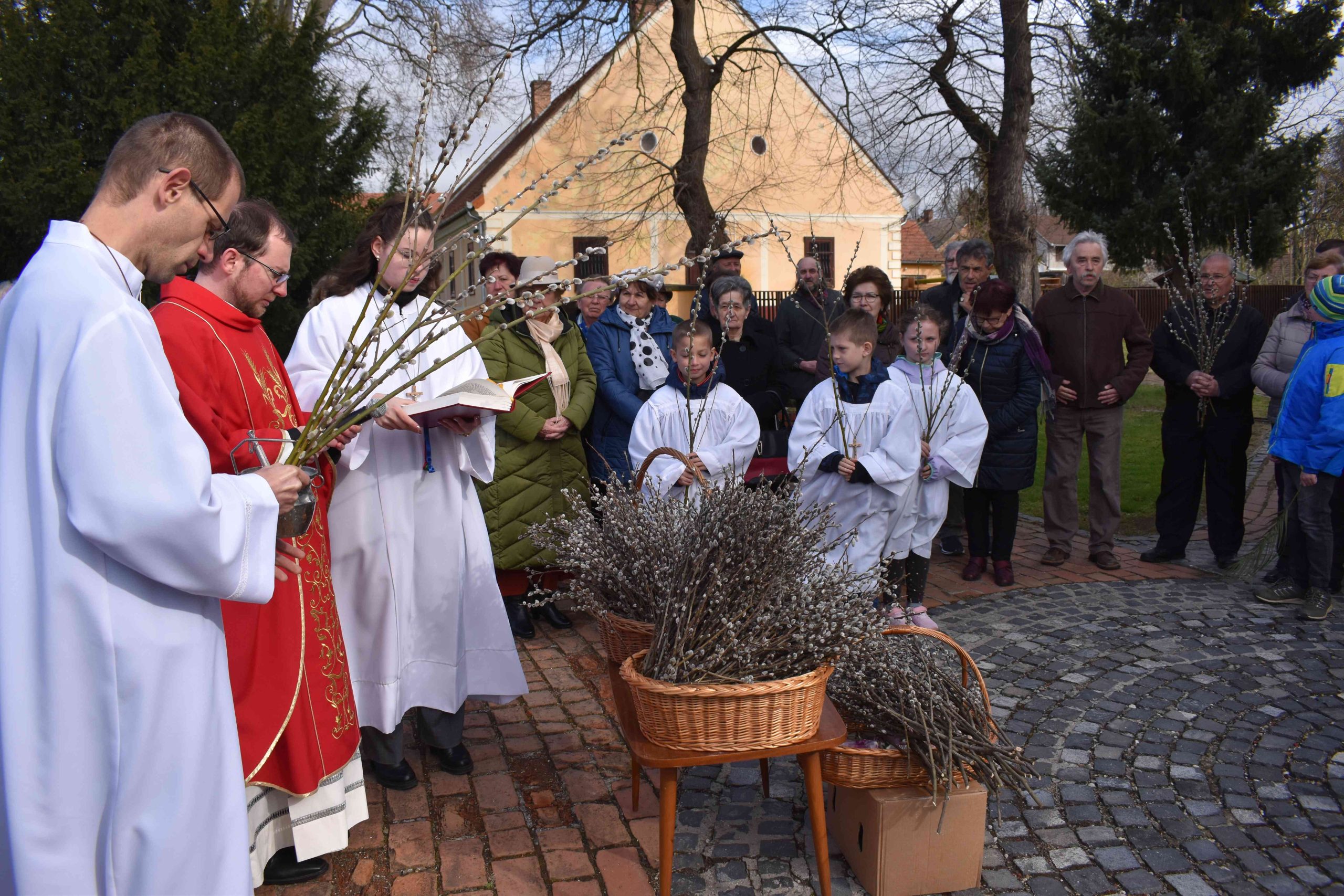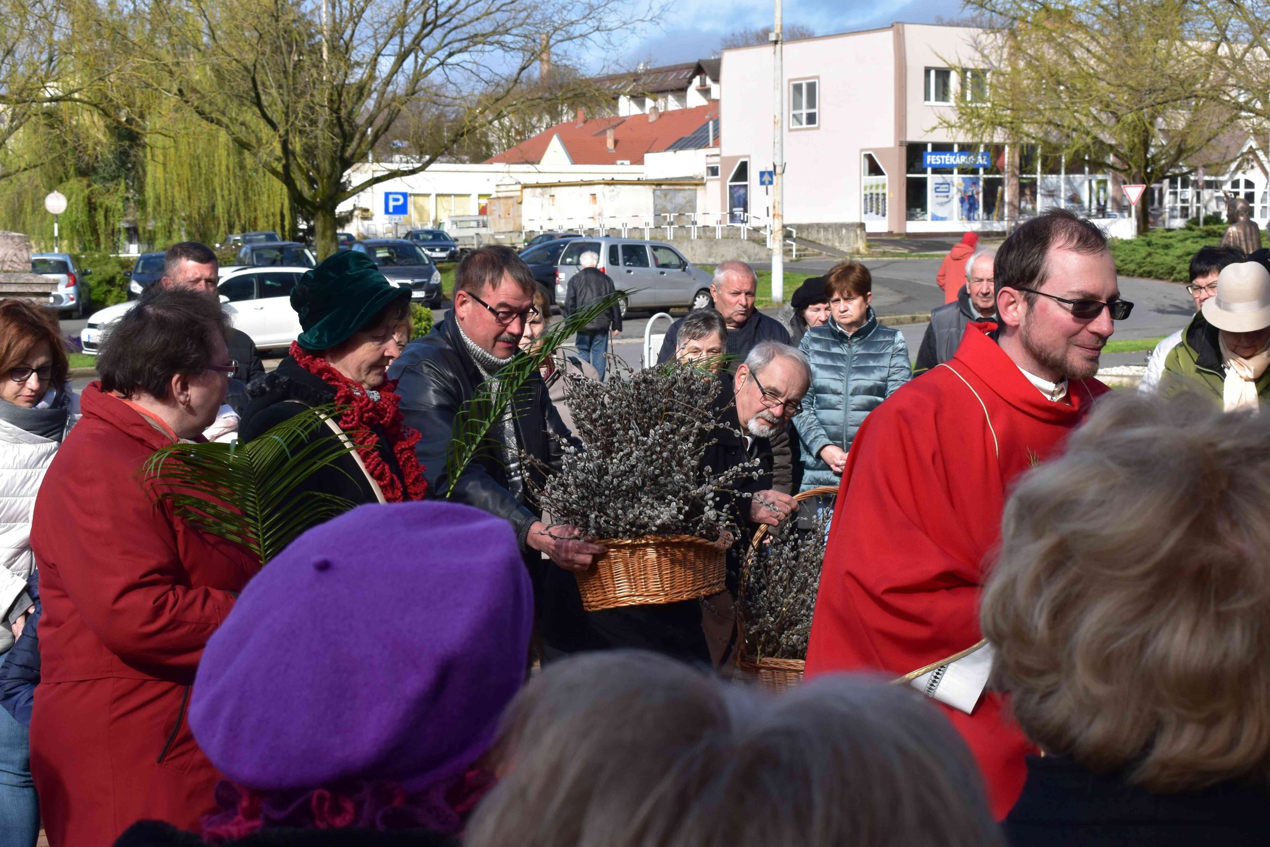 A virágvasárnapi körmenet az idén is csak rövidített formában valósult meg. Ferenc atya a ministránsokkal együtt néhány barkaággal érkezett a nyugati oldalon lévő főbejárat elé, Jézus jeruzsálemi bevonulását felelevenítve. Majd először a templom előtti téren – a hívek gyűrűjében – megáldotta a barkákat.