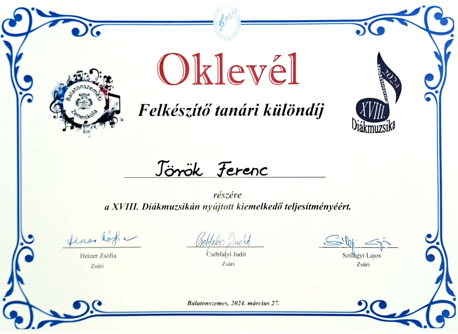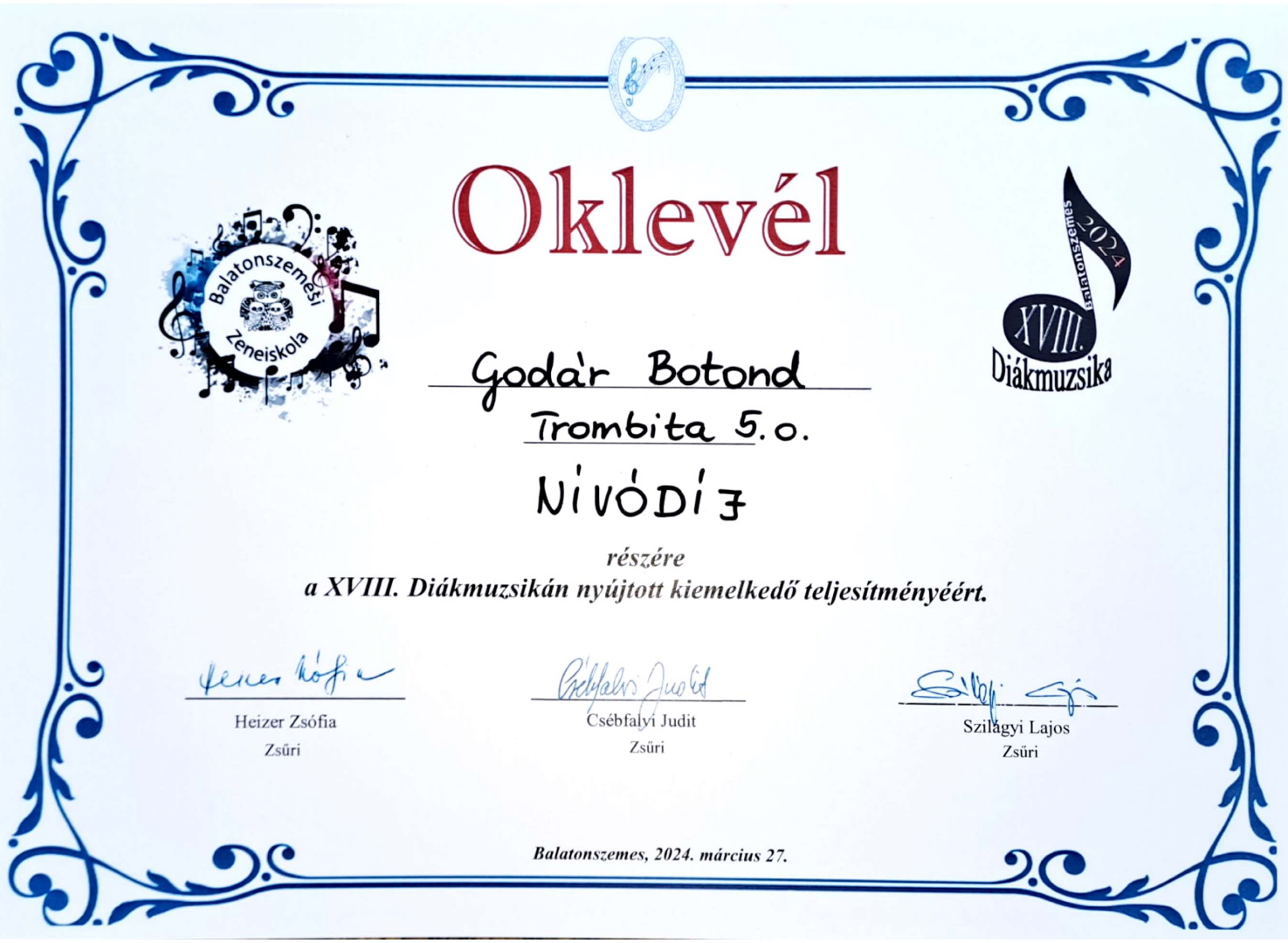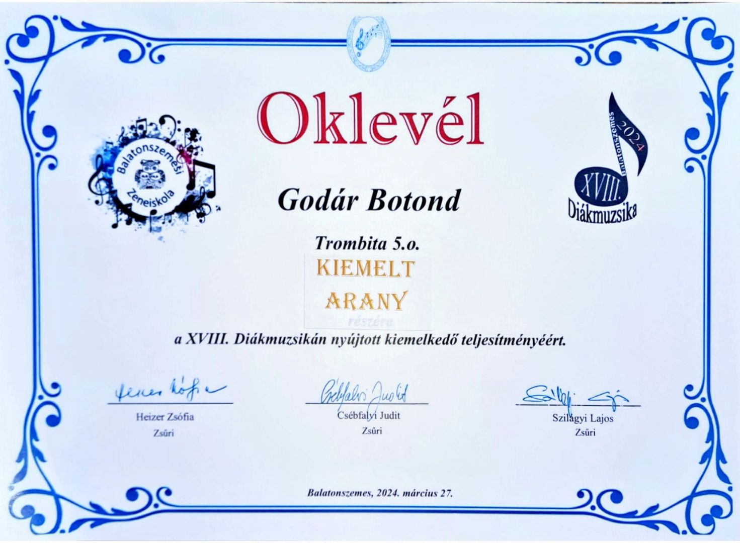Az eddigi kiemelkedő eredményeket követve a szünet előtti utolsó napon is kiválóan szerepeltek zeneiskolás tanulók. A Balatonszemesi XVIII. DIÁKMUZSIKA találkozón Godár Botond trombitás növendék kiemelt arany minősítésben és nívódíjban részesült, Kovács Borbála Emma kürtös növendék kiemelt arany minősítést kapott. Török Ferenc Tanár Úr kiérdemelte a felkészítő tanári különdíjat. A növendékeket zongorán Ujláb Gábor tanár úr kísérte.