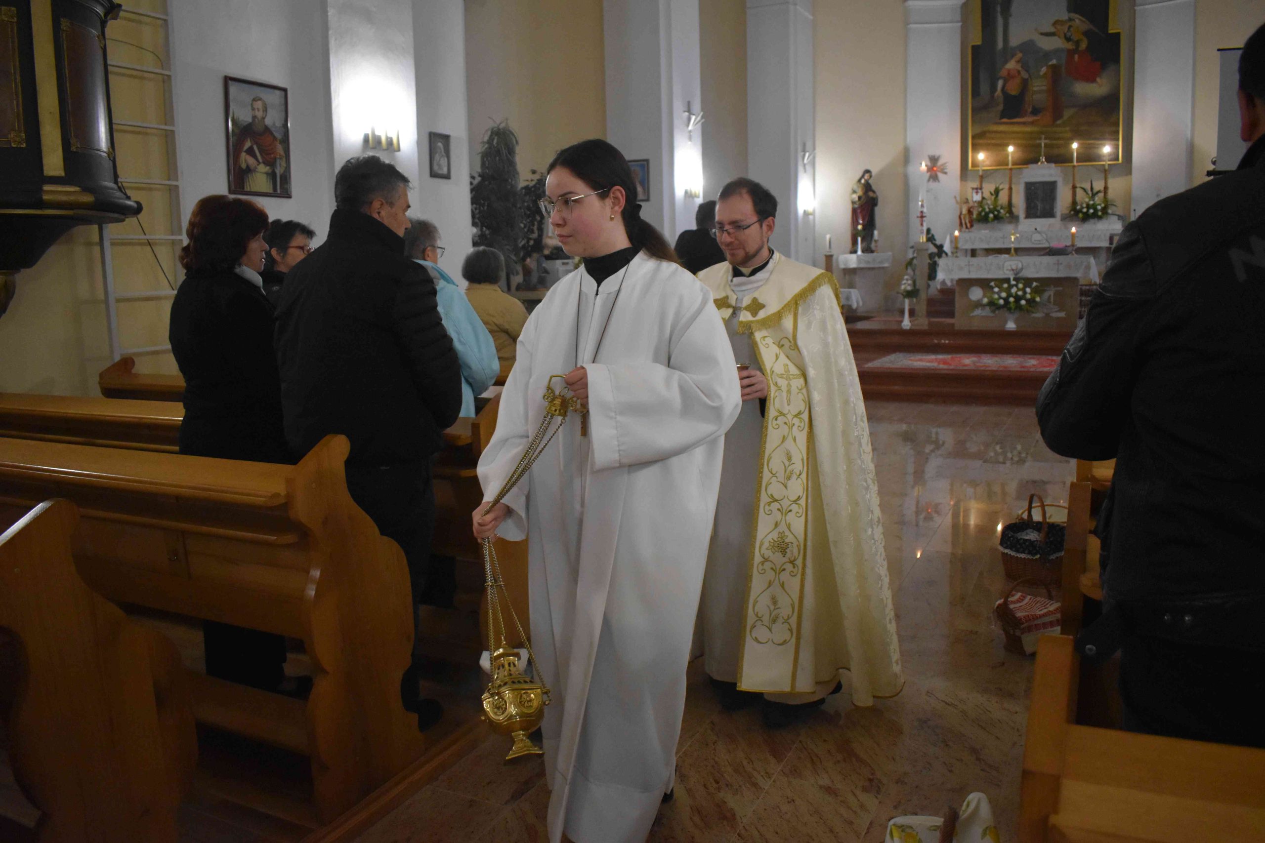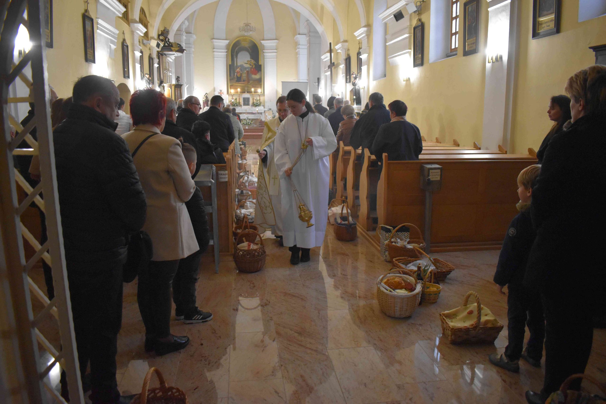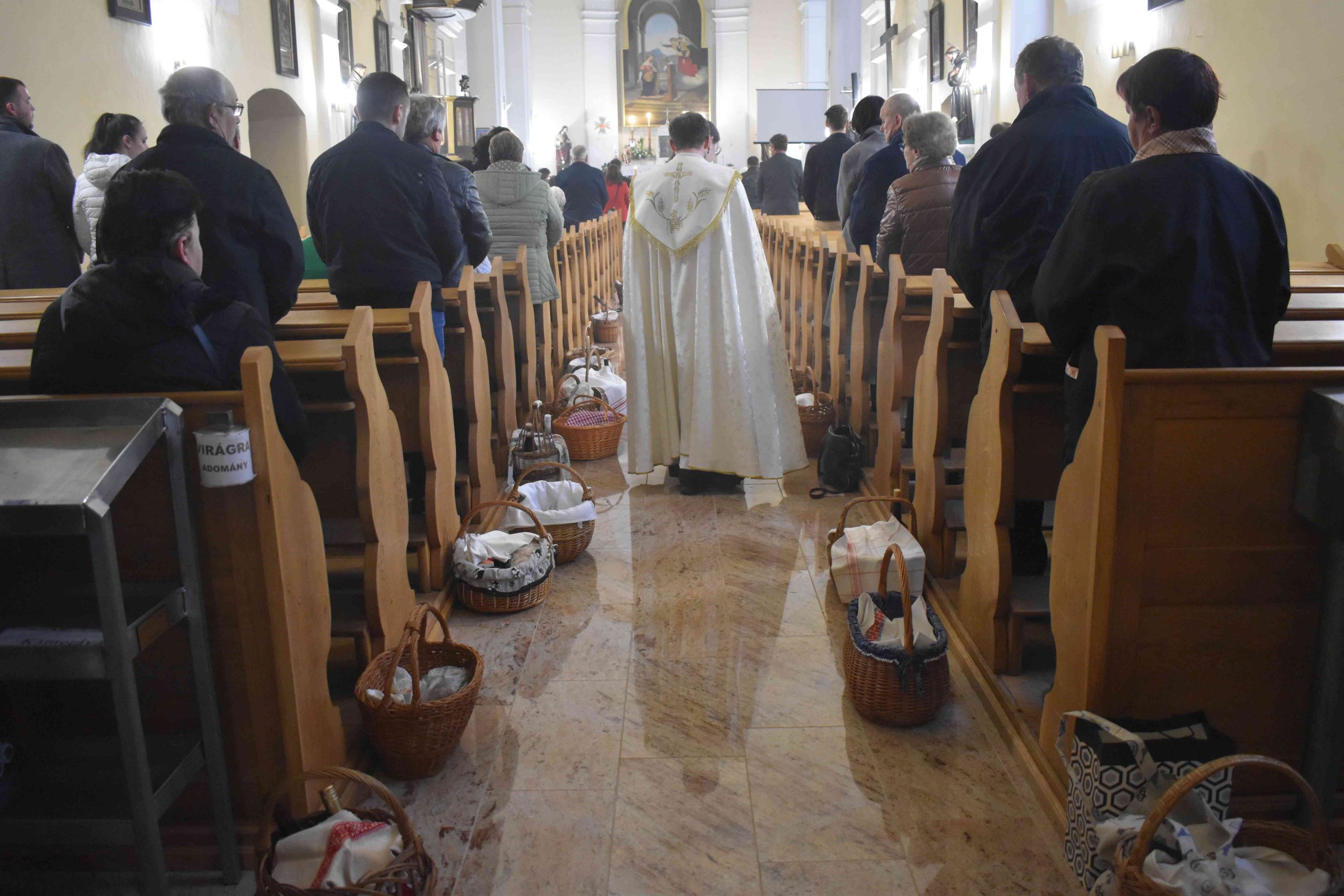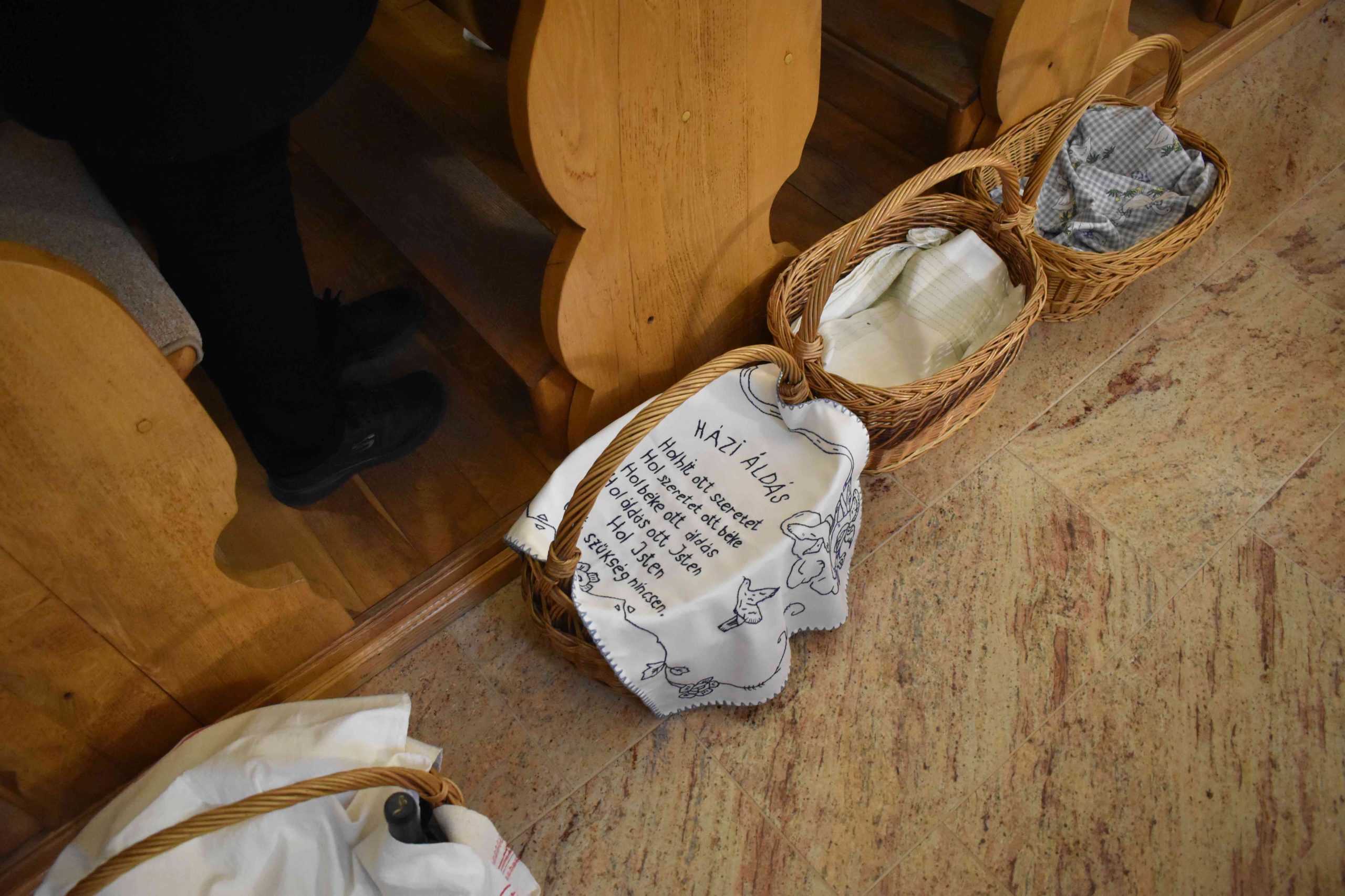 Tomanek Ferenc Áron plébános először megáldotta, majd pedig megszentelte a szépen összeállított kosarakban hozott különféle ételeket: elsősorban a sonkát, a tojást, a kalácsot, a tormát és a bort; valamint az édességeket: például csokoládét és süteményeket, vagy a gyümölcsöt.