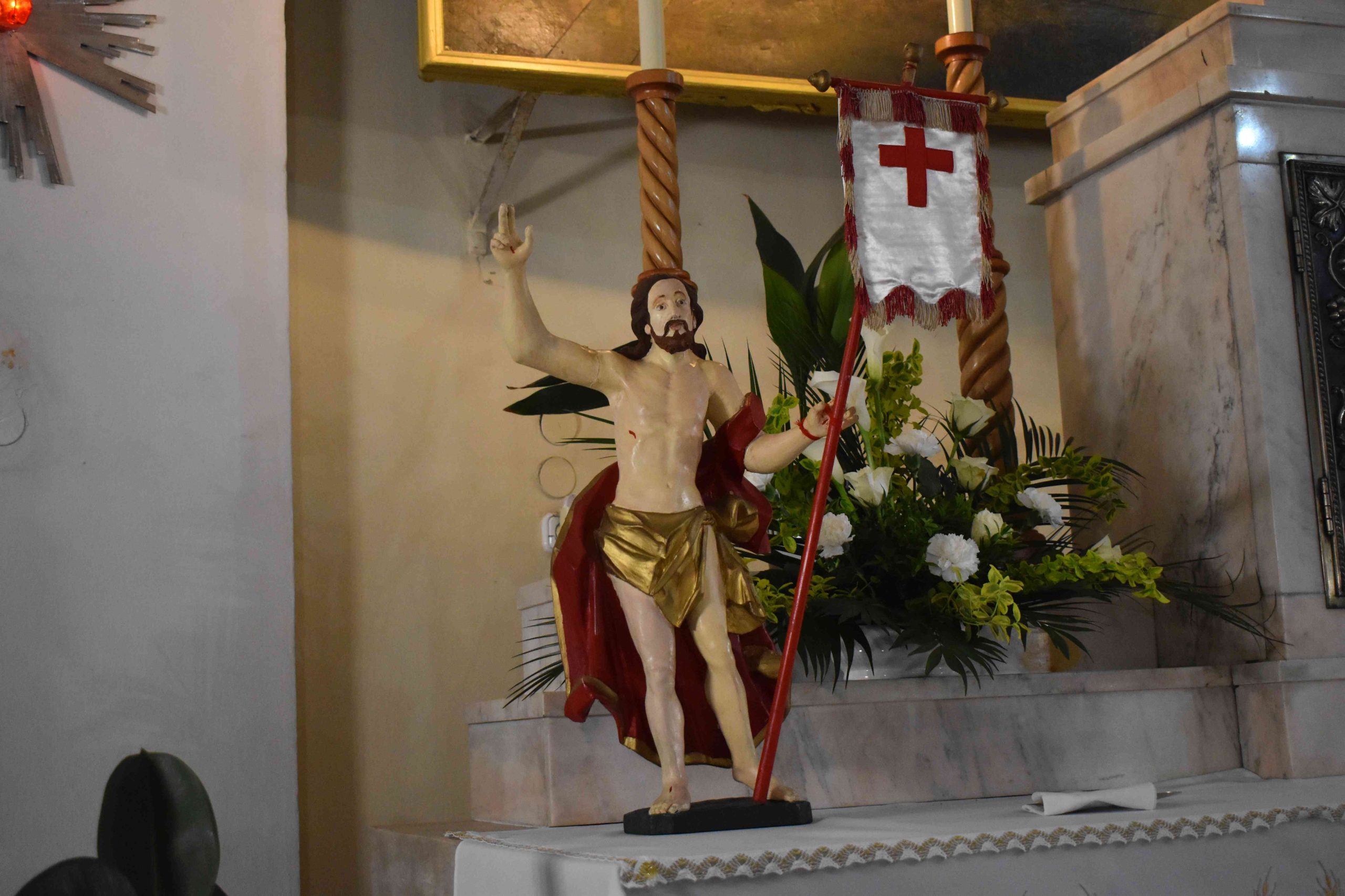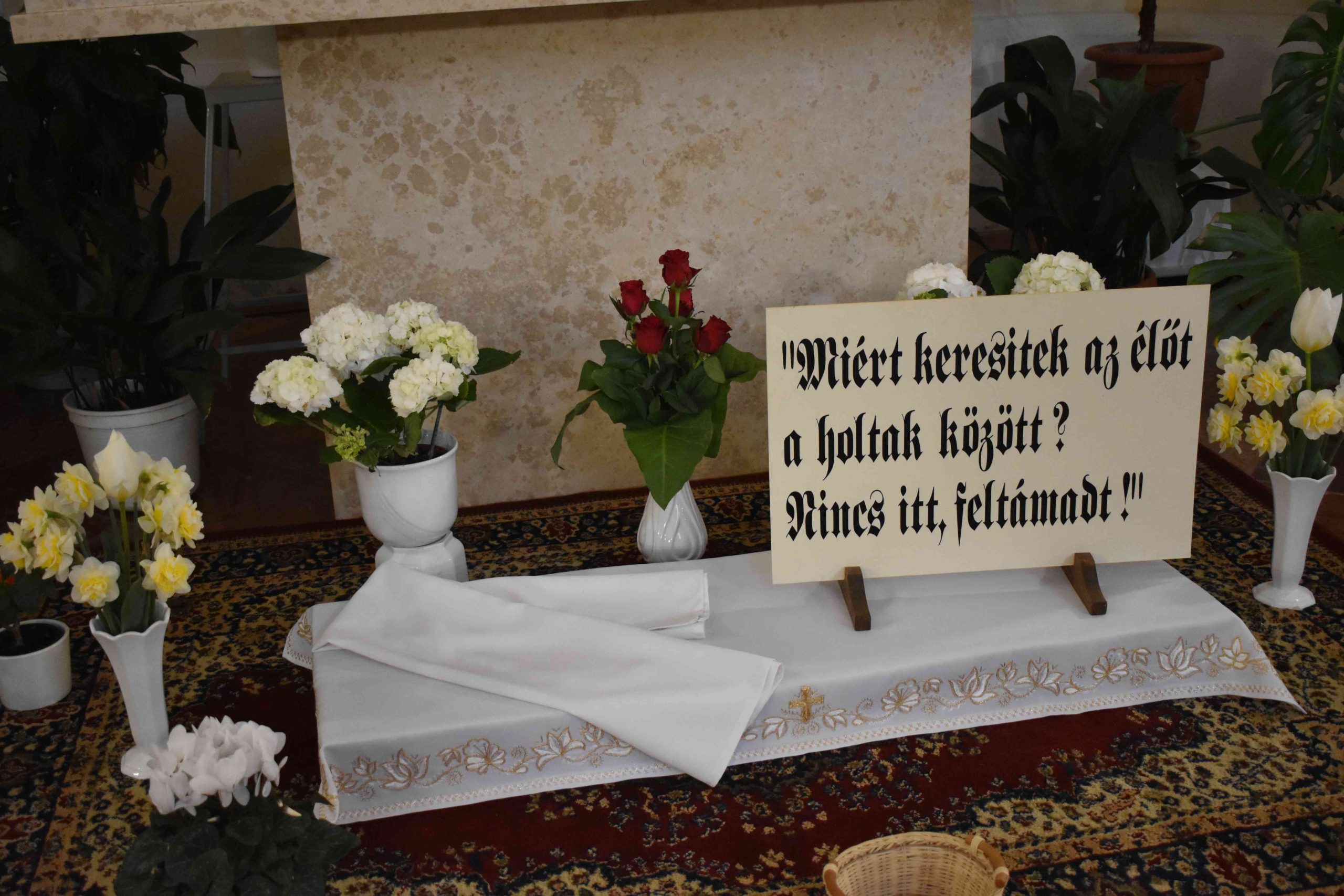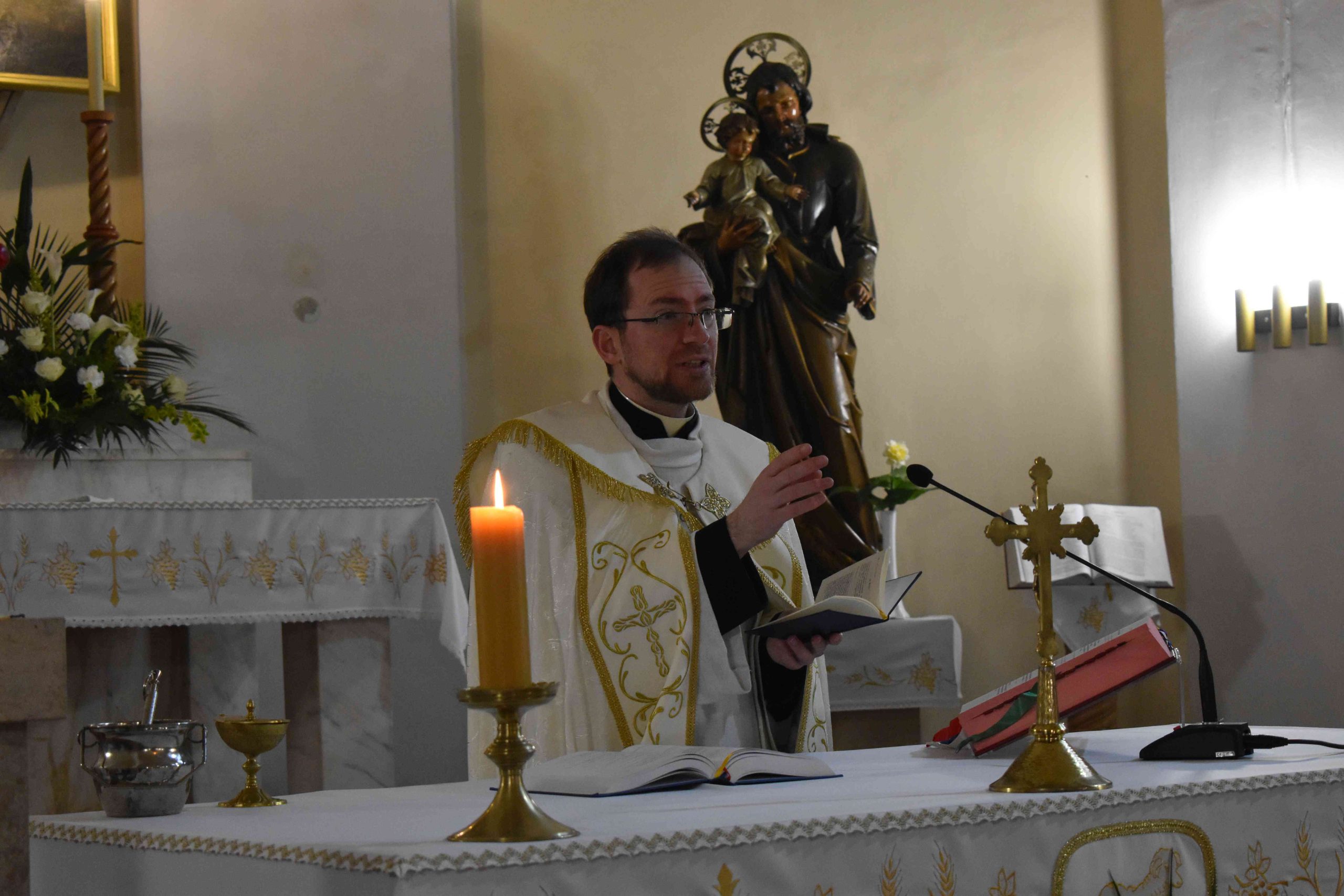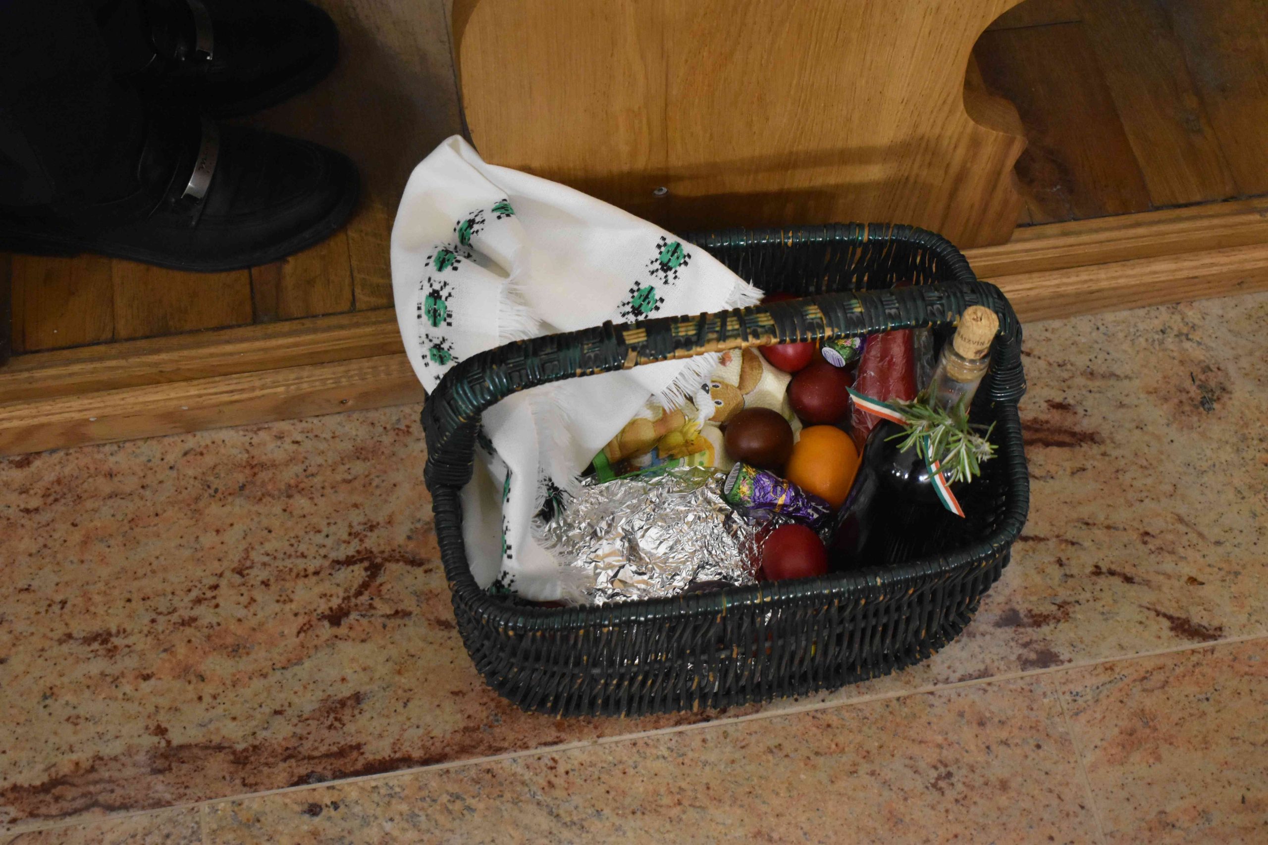 Tomanek Ferenc Áron plébános először megáldotta, majd pedig megszentelte a szépen összeállított kosarakban hozott különféle ételeket: elsősorban a sonkát, a tojást, a kalácsot, a tormát és a bort; valamint az édességeket: például csokoládét és süteményeket, vagy a gyümölcsöt.