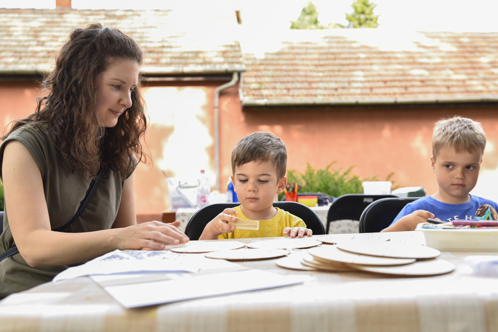 A délután első felében a kisgyermekkel érkezők számára játékos alkotási lehetőséget biztosítottunk, amelyben színes pörgettyűket készíthettek, absztrakt tintaképeket alkothattak, valamint kreatív festéssel is készültek képek a múzeumpedagógus és az önkéntes segítségével.