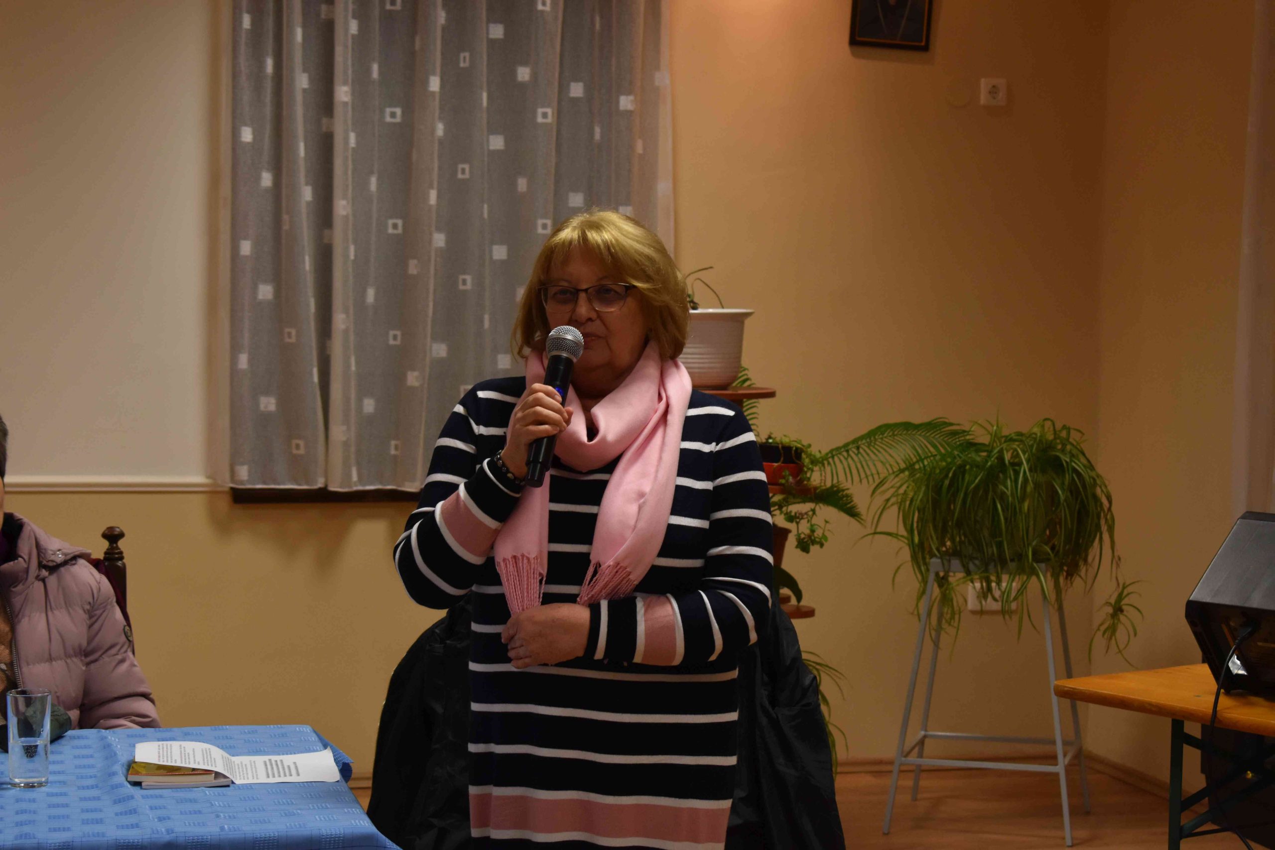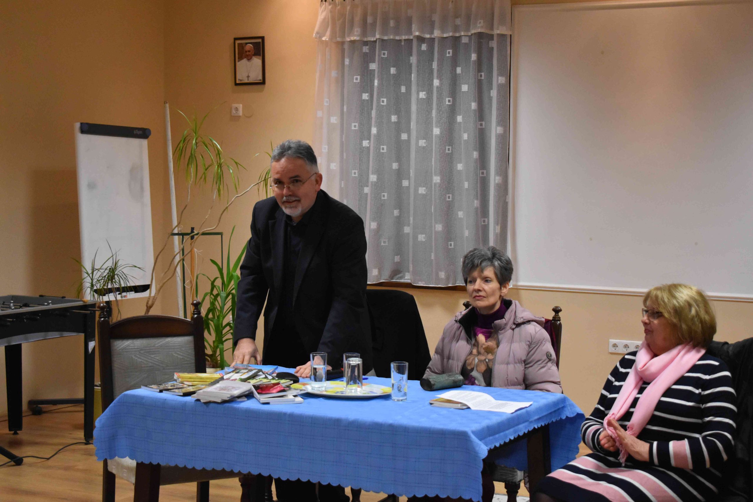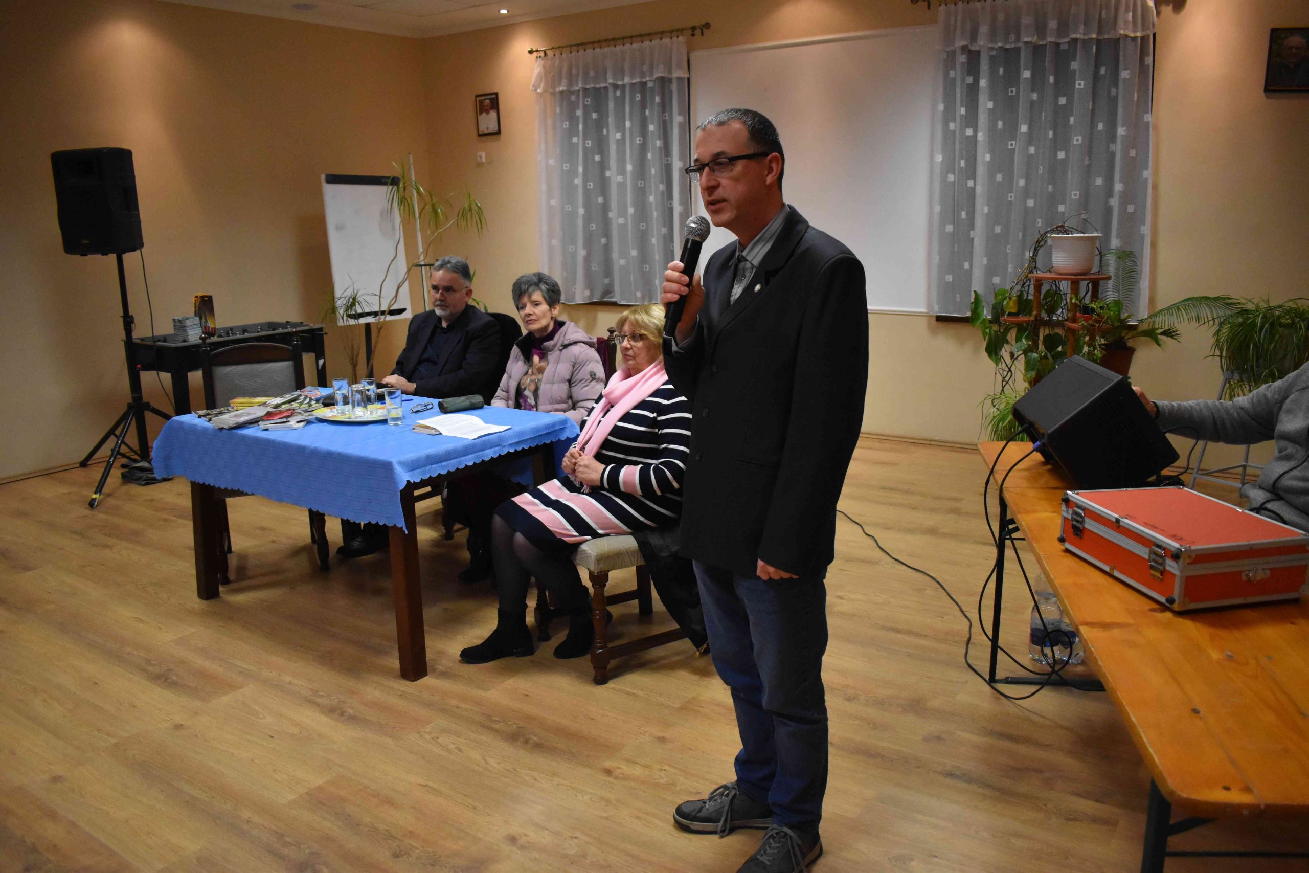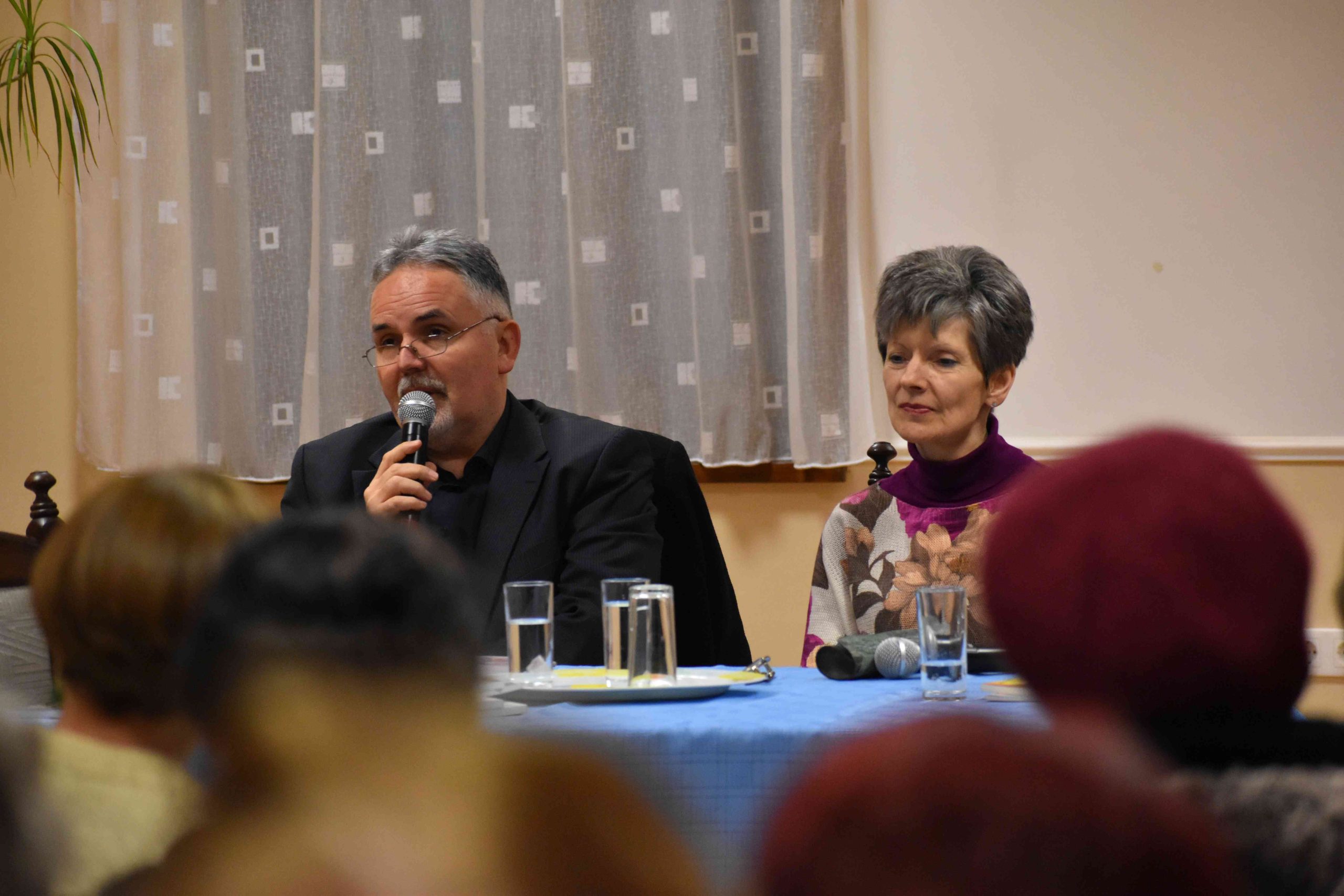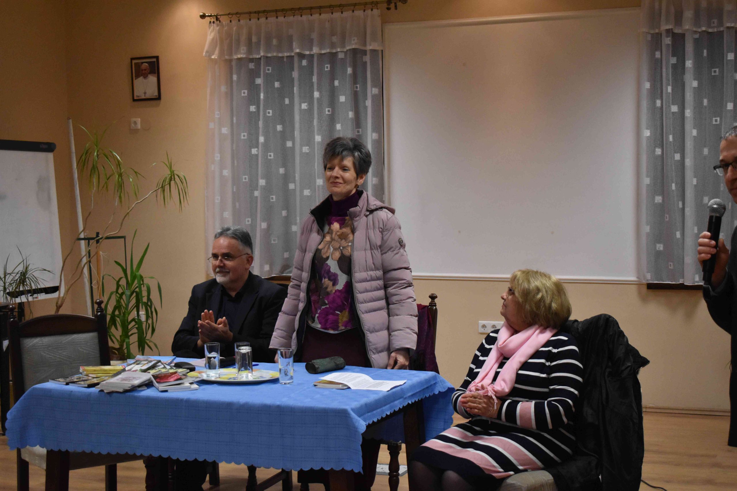 Az istentisztelet után 18.15 órától „Miért hiszek?” címmel pedig tanúságtevő előadást tartott Lőrincz Sándor újságíró és felesége, Lőrinczné Pálos Éva tanárnő az egyházközség közösségi házában (X-ház, Dózsa u. 3.). A rendezvény résztvevőit Kiss Kálmán, a KÉSZ helyi csoportjának elnöke köszöntötte elsőként, majd pedig Molik Edit, az előadás-sorozat ötletgazdája és fő szervezője pár gondolattal mutatta be a vendégeket.