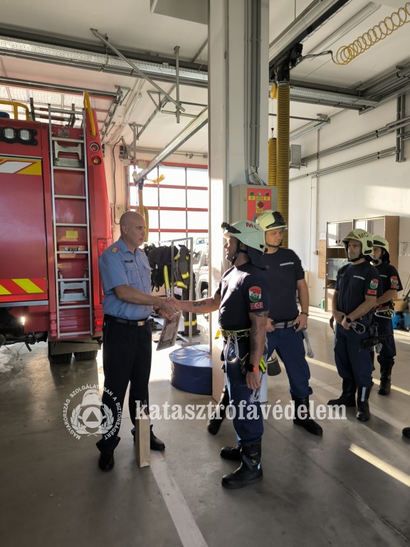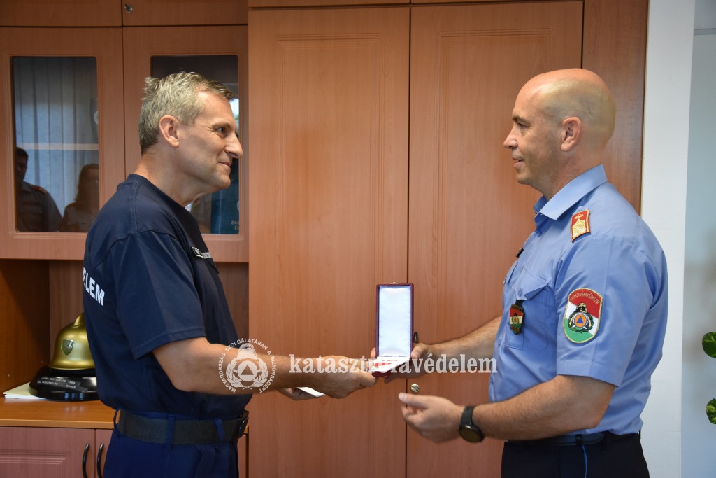 Dr. Góra Zoltán tű. altábornagy a BM Országos Katasztrófavédelmi Főigazgatóság főigazgatójának köszöntőjét Tompos Gábor tűzoltó alezredes, igazgatóhelyettes tolmácsolta az 50. születésnapját ünneplő Harangozó Imre tűzoltó főtörzszászlósnak és Lőrincz Krisztián tűzoltó főtörzsőrmesternek.