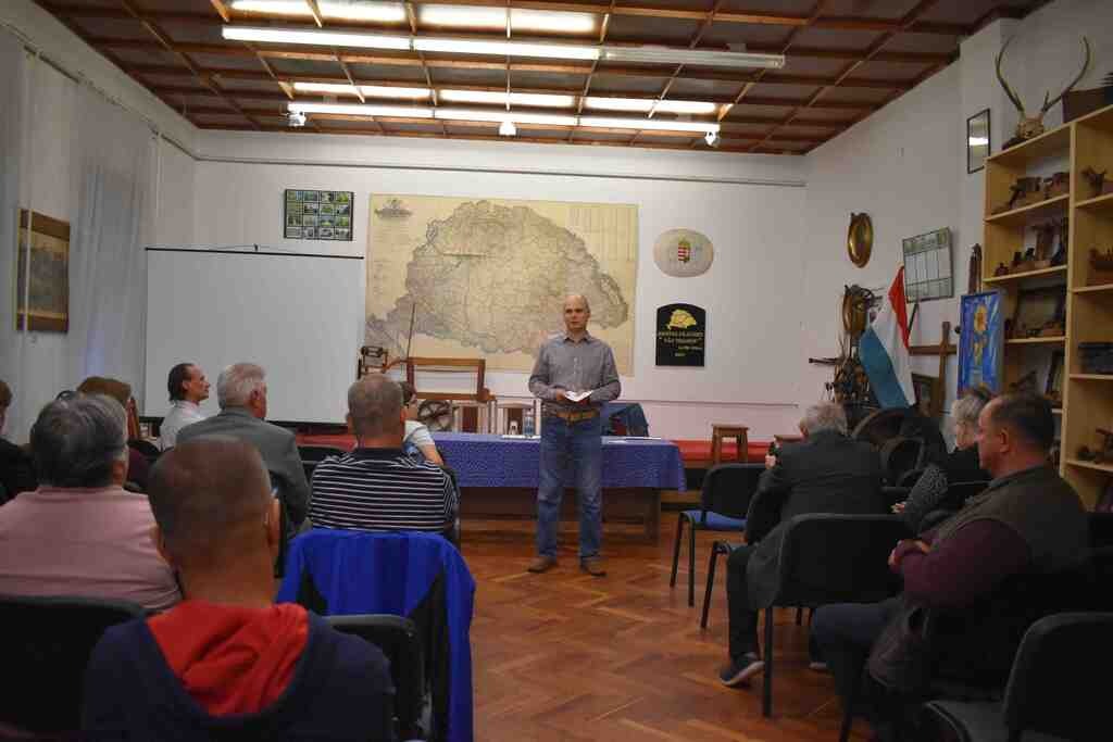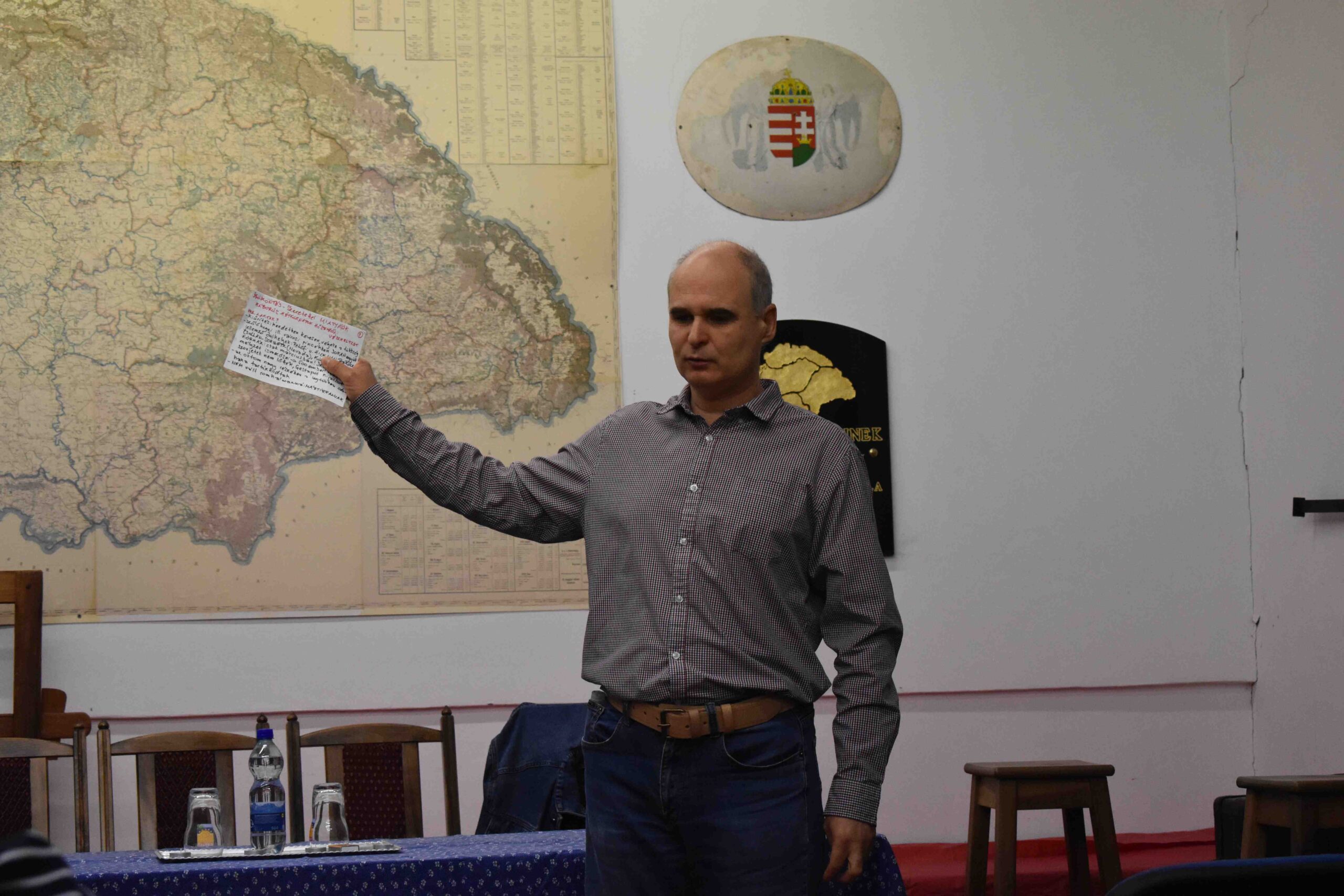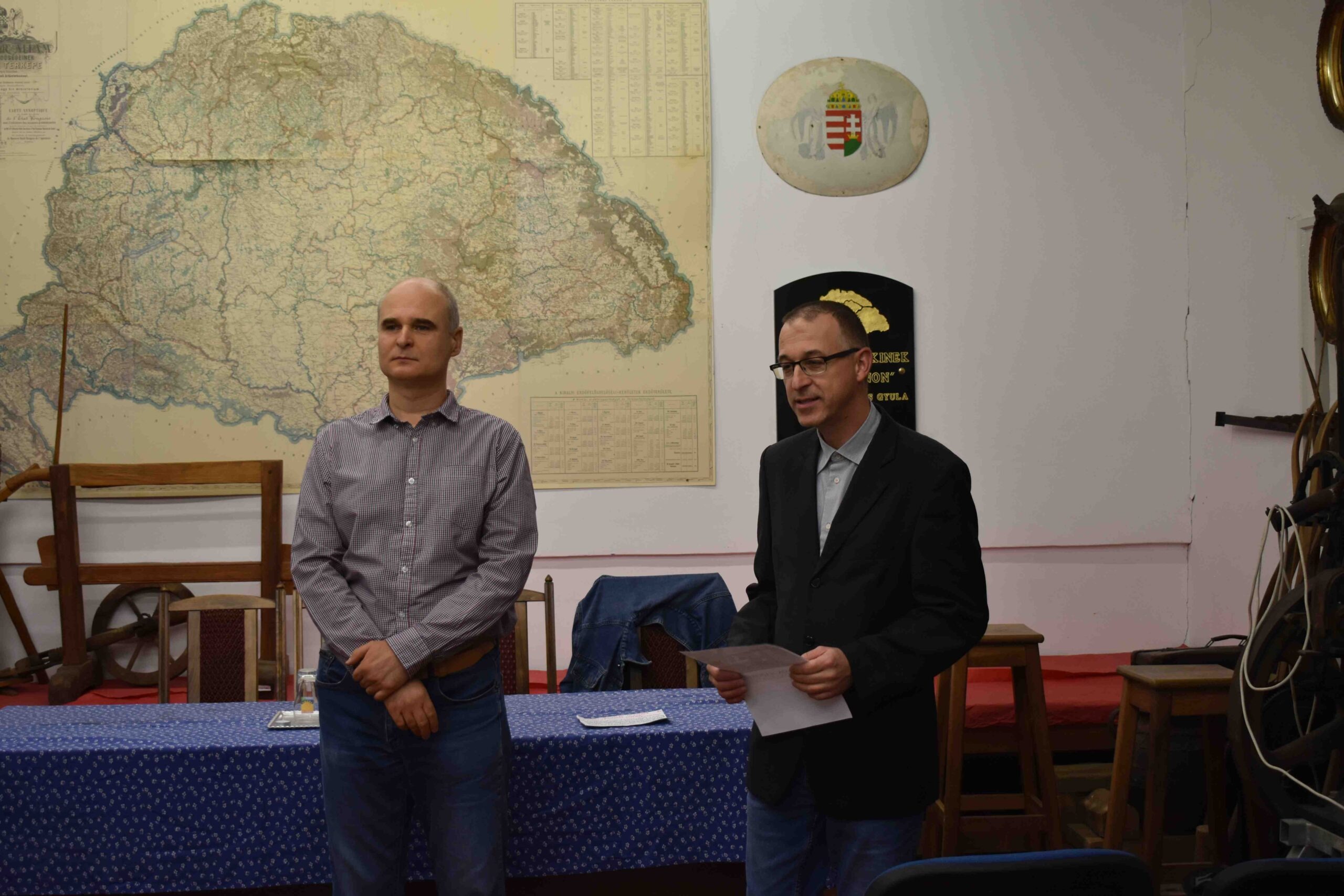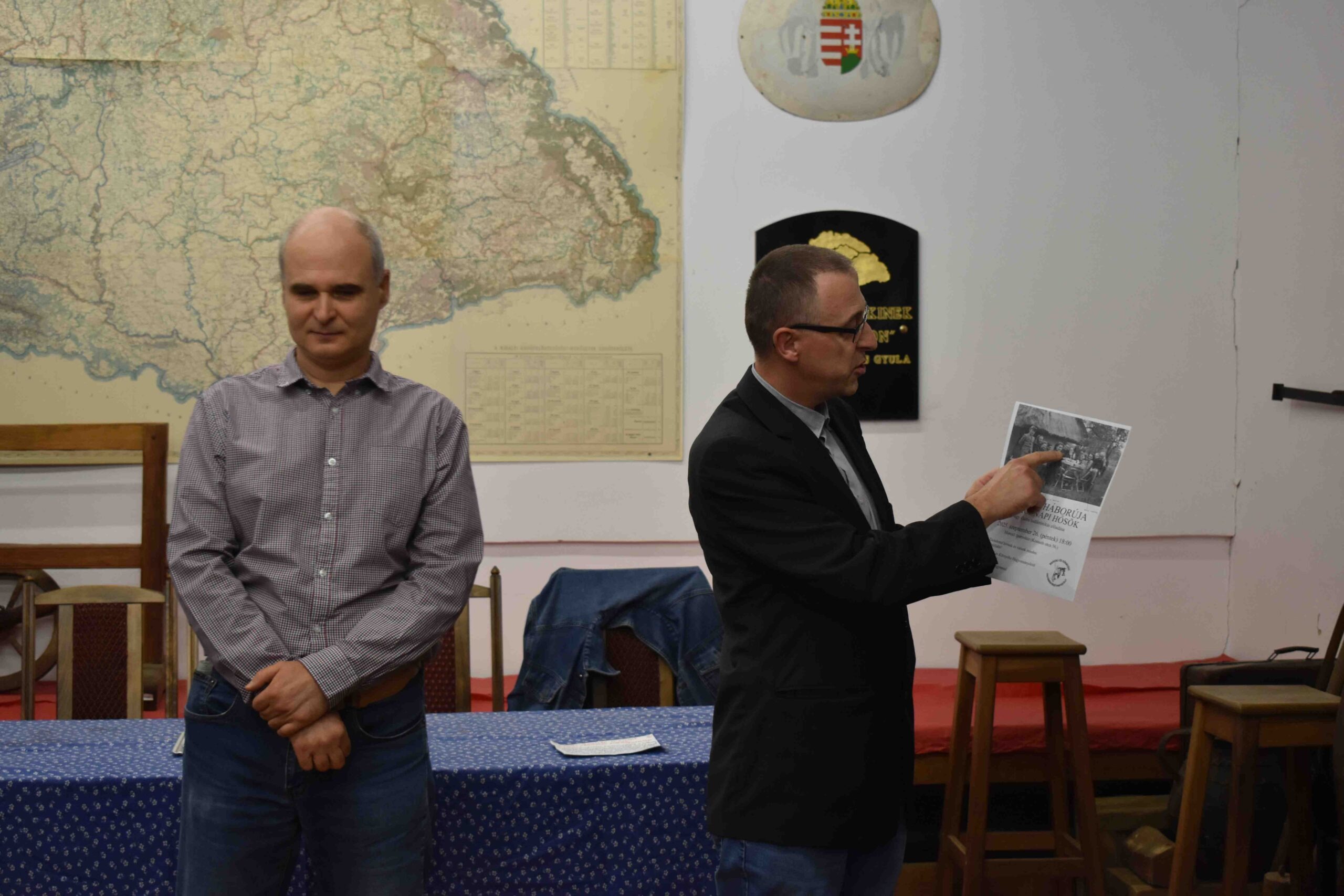 A megjelenteket Kiss Kálmán alelnök köszöntötte, majd bevezető gondolatai után Nagy Csaba vette át a szót, és ezúttal a fronthétköznapok kerültek terítékre, kitérve a német és a magyar katonaság viselkedésére, illetőleg az itthon maradt lakosság életkörülményeire. Az előadó elmondta, hogy míg a környező Bize és Boronka települések elpusztultak, és még egy szék sem maradt bennük, addig a Marcaliban lévőknek végig megfelelő volt az ellátásuk. Az utcákon csordákban kószáló háziállatok bőséges élelmiszerforrást jelentettek mindenki számára. Az elmenekült grófi család kastélyában az egykori alkalmazottak és rokonaik vészelték át a háborút; végül már összesen mintegy 500-an laktak viszonylagos nyugalomban egy nagy vöröskeresztes zászló oltalma alatt. Valójában kórházként már csak a harcok elvonulása után használták az impozáns épületet. A hétköznapi hősök közül – többek között – kiemelte a 18 éves ápolónő, Cziklin Gizella önfeláldozását; Pozsgai Károly gombai lelkipásztor tragédiáját; és Reindl Rafael káplán elismerésre méltó magatartását. Megemlítette, hogy Marcali mindmáig legnagyobb veszteségét 1944. december 18-án szenvedte el, amikor a Szigetvári utcában becsapódott egy szovjet aknagránát, mely rengeteg ártatlan áldozatot követelt. Az elhunytakat a hős káplán a hátán vitte ki a temetőbe, a pergőtűz közepette és temette el őket, megadva nekik a végtisztességet.