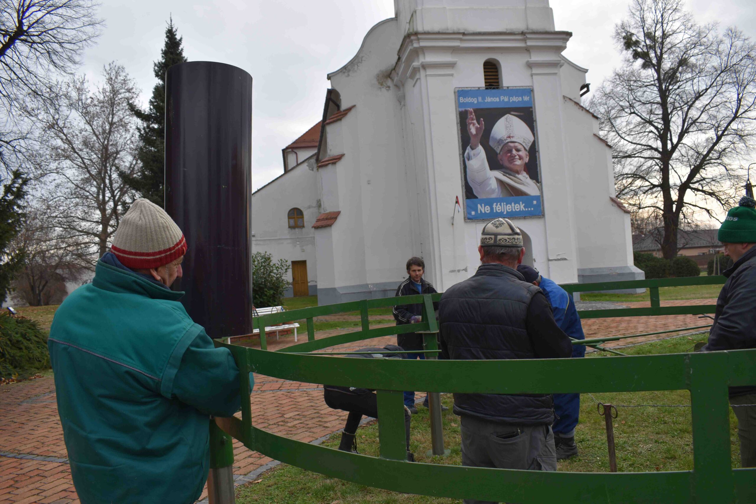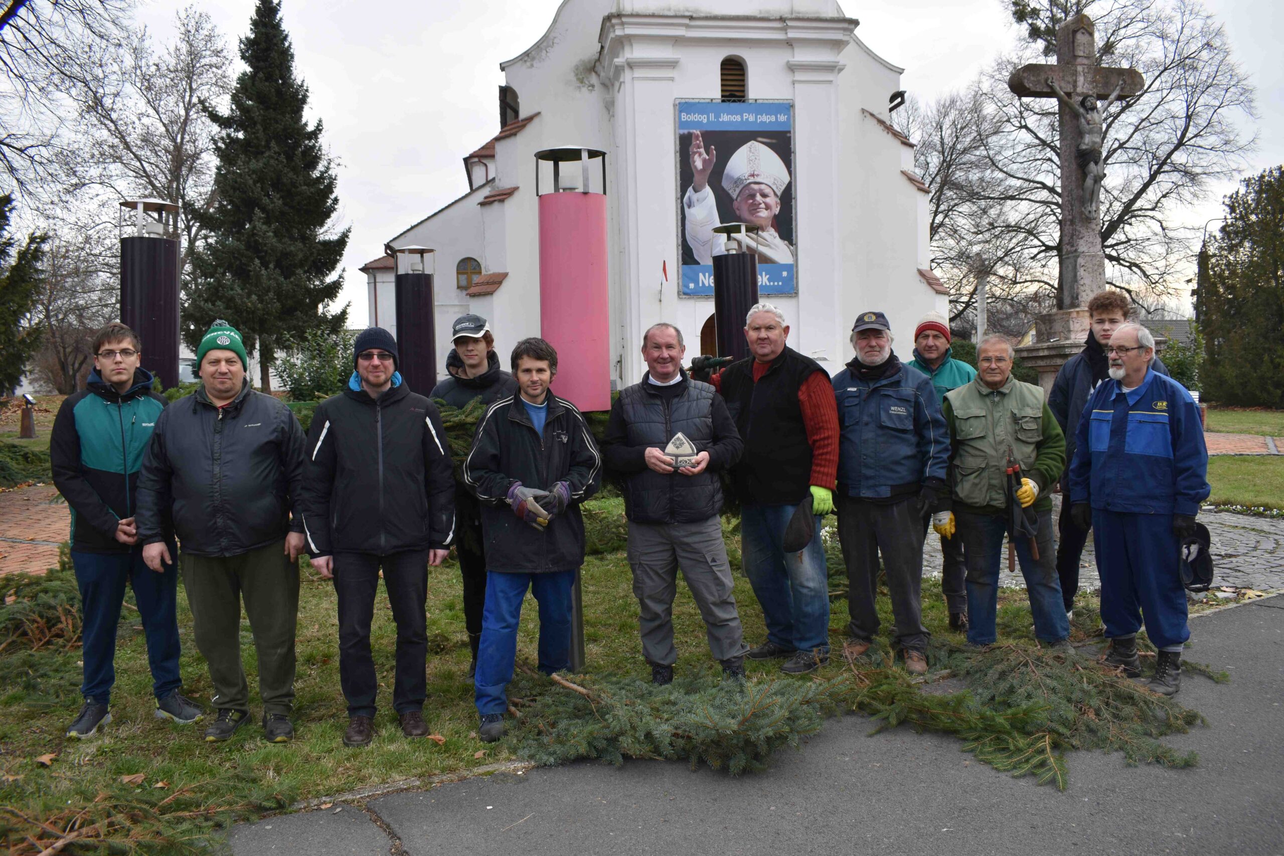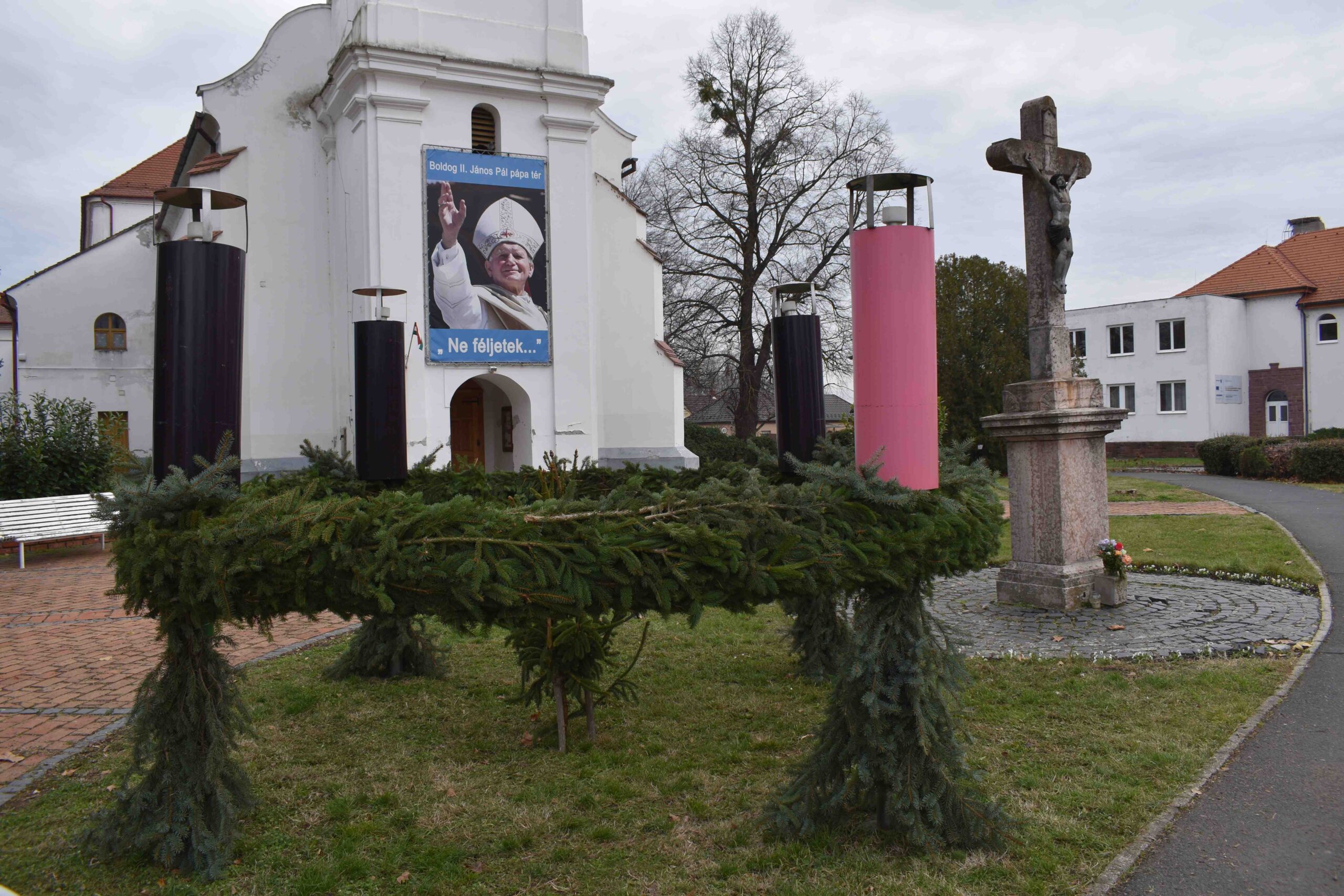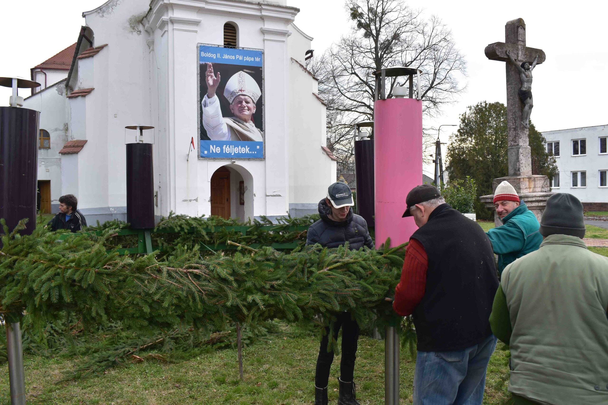 2025. november 29-én, szombaton, délelőtt 9 órától kezdődött a kültéri ádventi koszorú összeállítása és feldíszítése a Gyümölcsoltó Boldogasszony Plébániatemplom előtti kereszt mellett, a Boldog II. János Pál pápa téren.