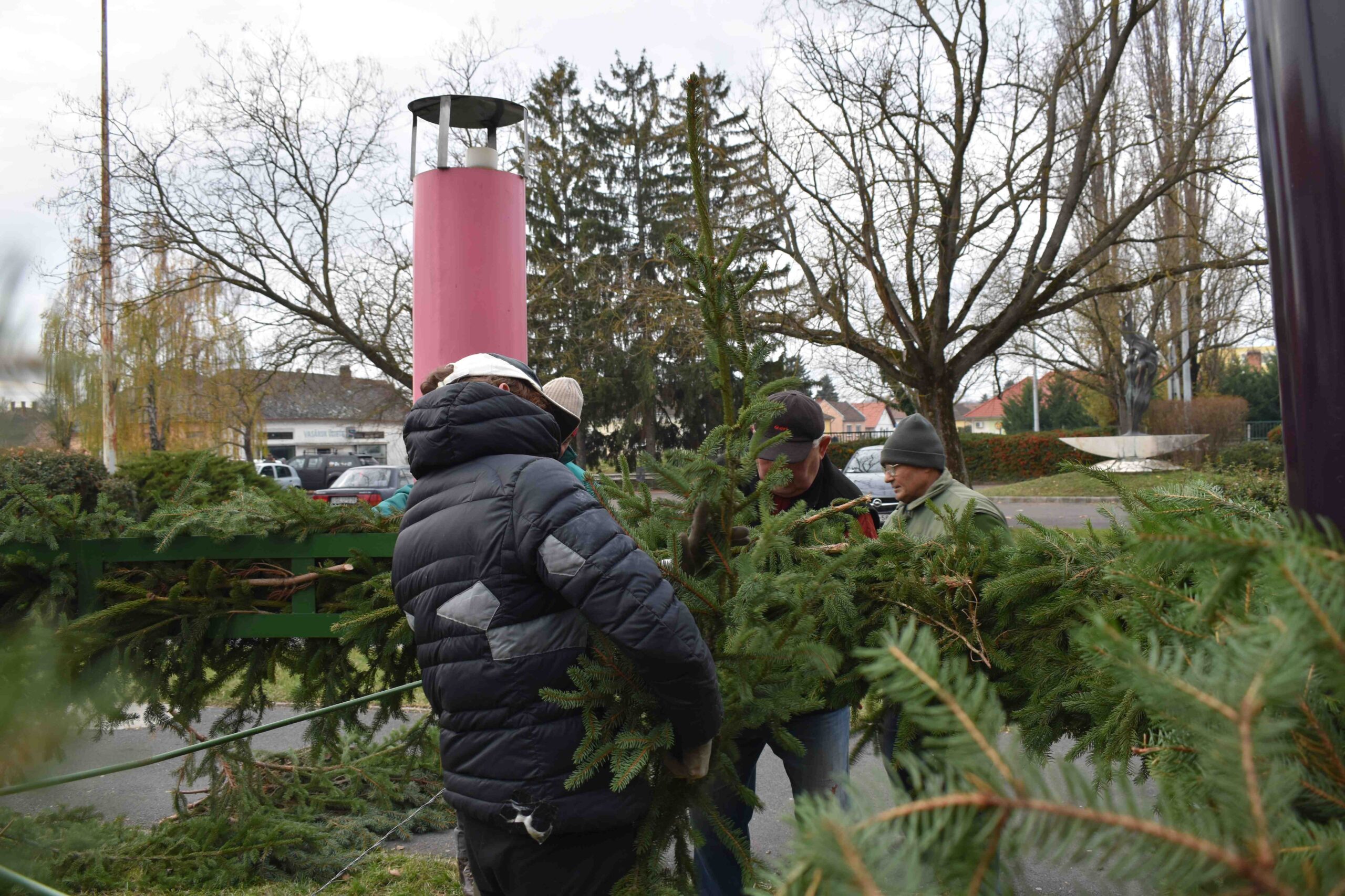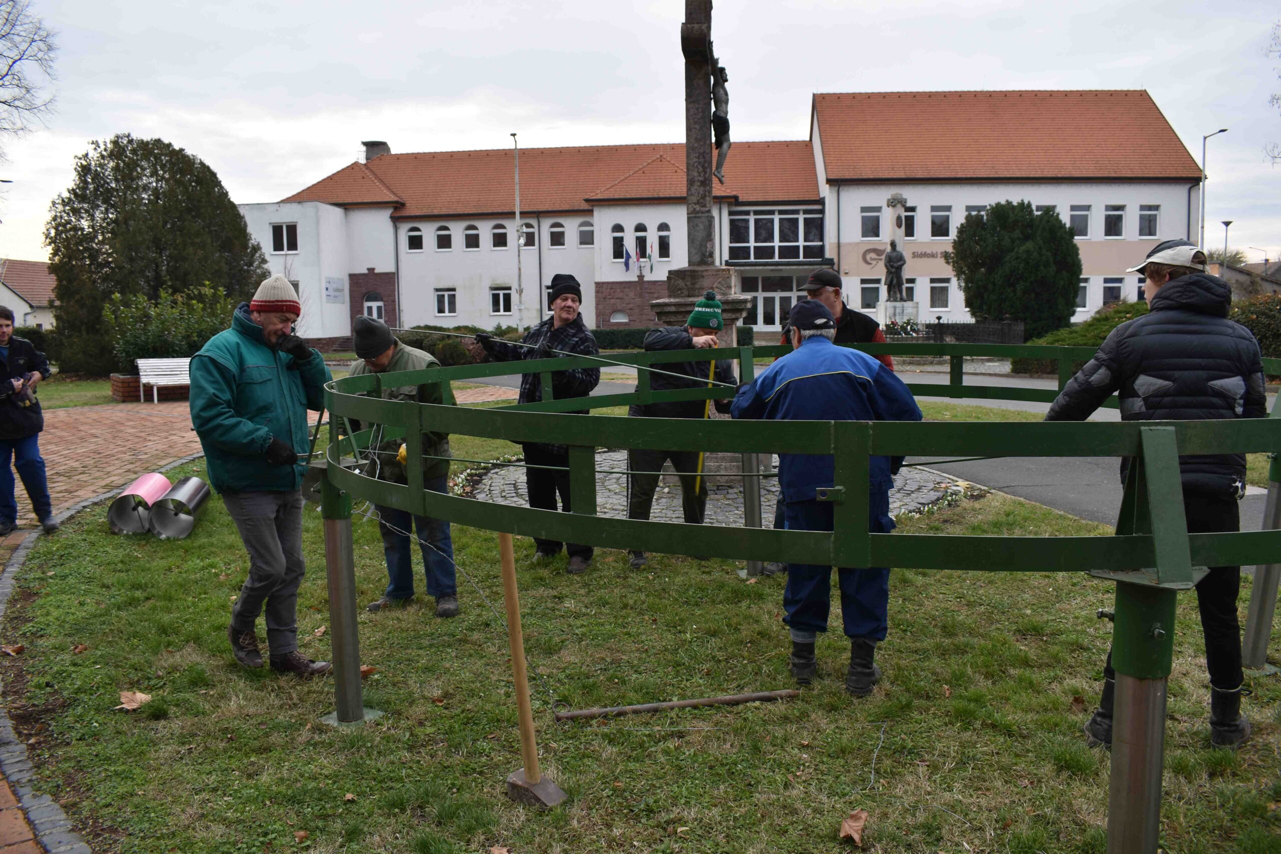 Az idei munkákat Gelencsér Róbert és Tóth Péter irányították. A Marcali Római Katolikus Egyházközség 14 fős csapata rutinos gyorsasággal állította össze a koszorú fém-váz keretét és díszítette fel fenyő-ágakkal a nagyméretű koszorút.