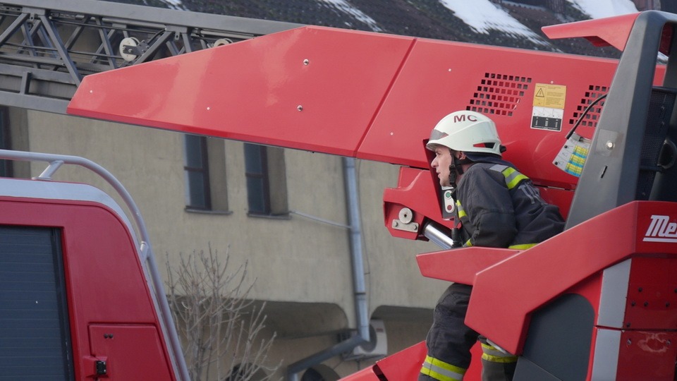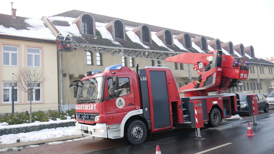A marcali hivatásos tűzoltók gyorsan reagáltak a helyzetre: emelőkosaras jármű segítségével, módszeresen megtisztították az ereszeket a súlyos jégtömböktől.
