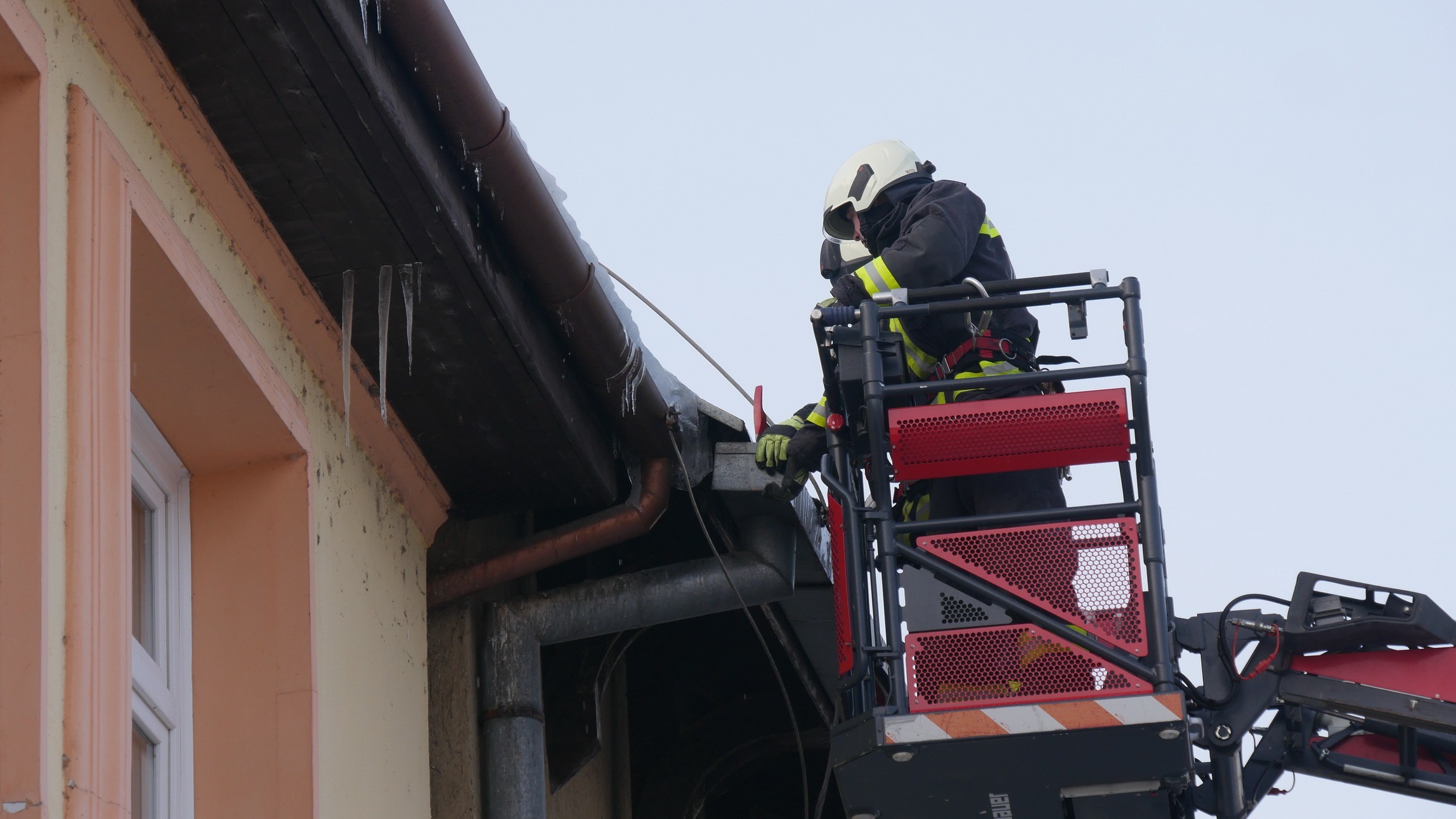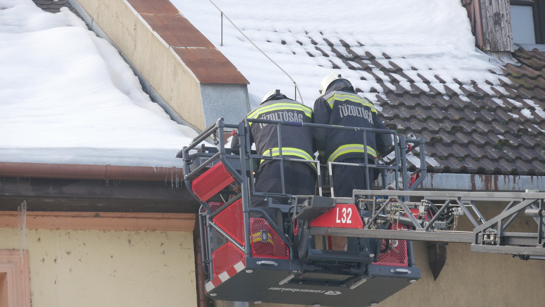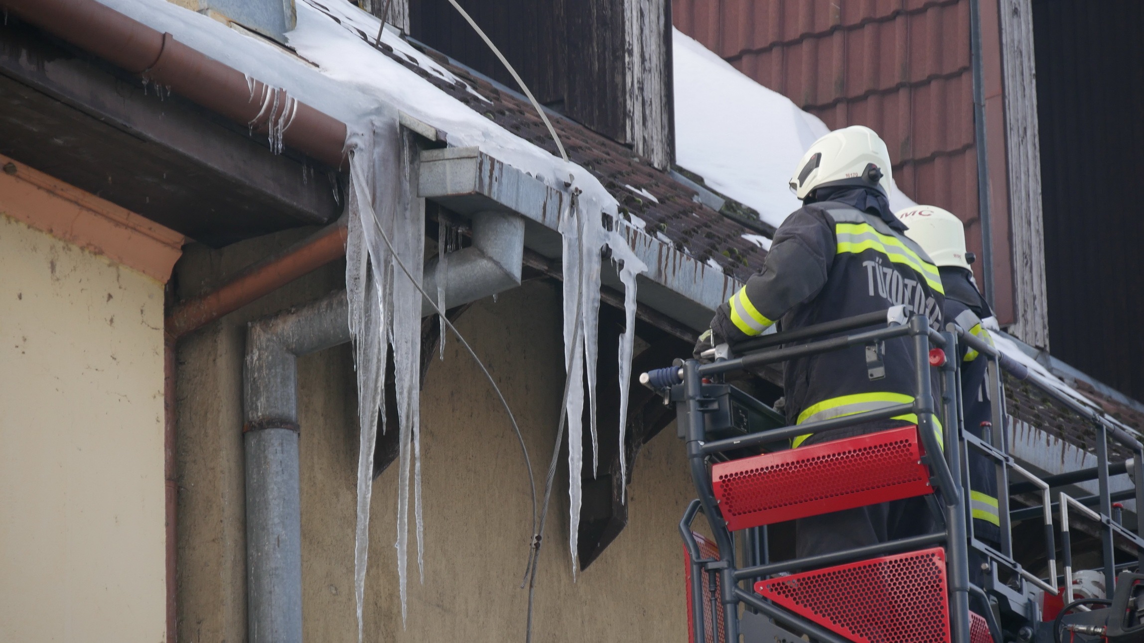 A marcali hivatásos tűzoltók gyorsan reagáltak a helyzetre: emelőkosaras jármű segítségével, módszeresen megtisztították az ereszeket a súlyos jégtömböktől.