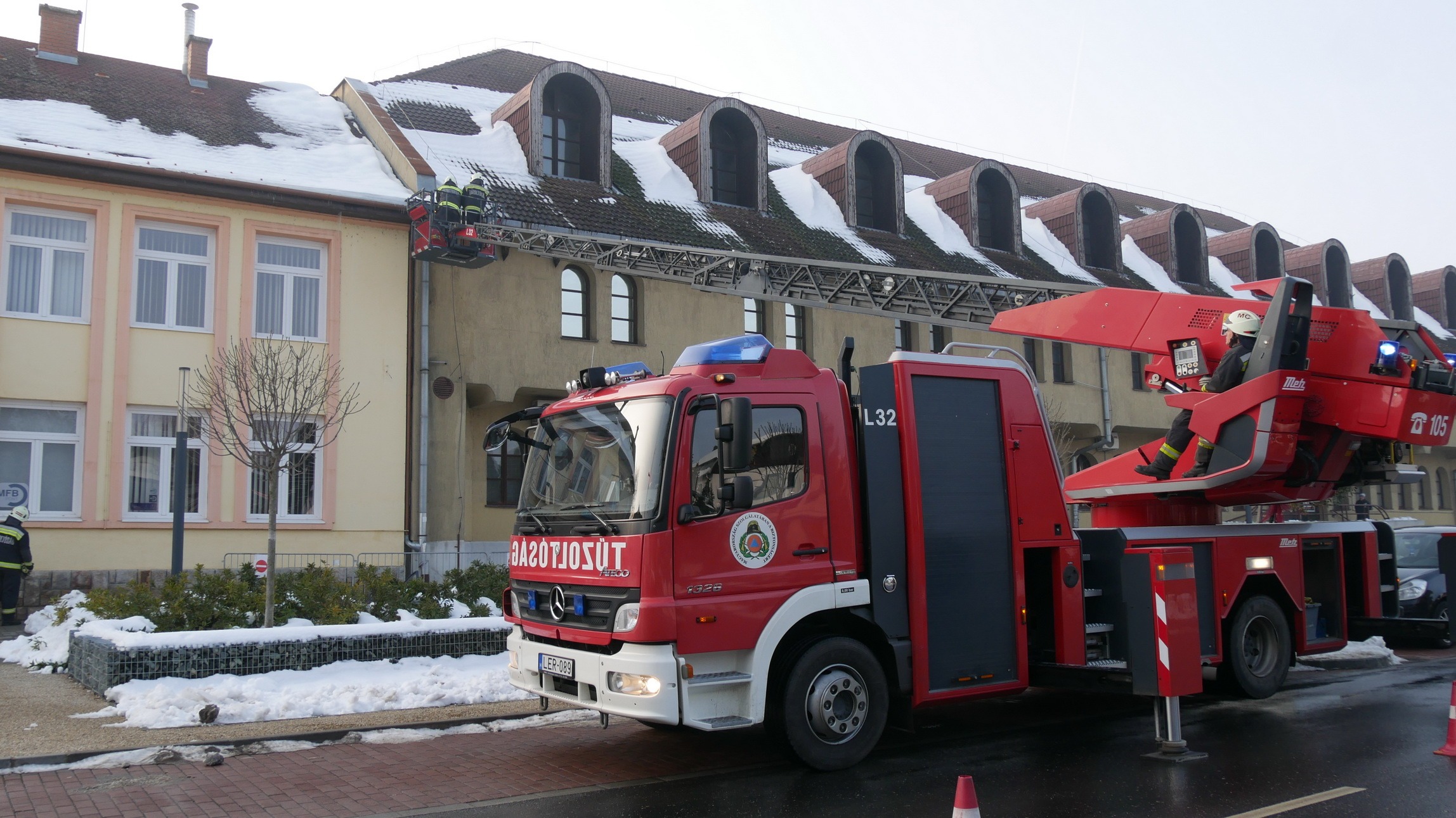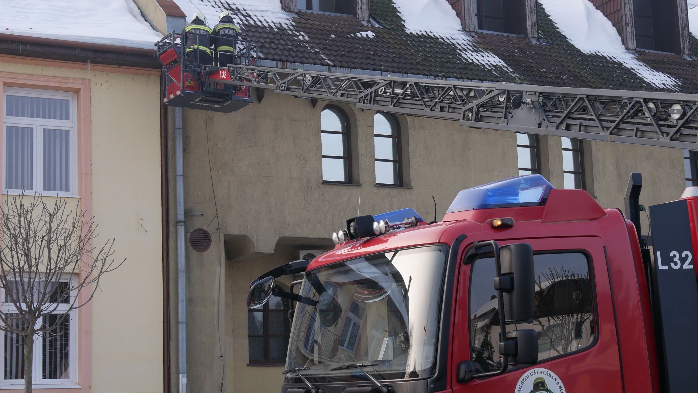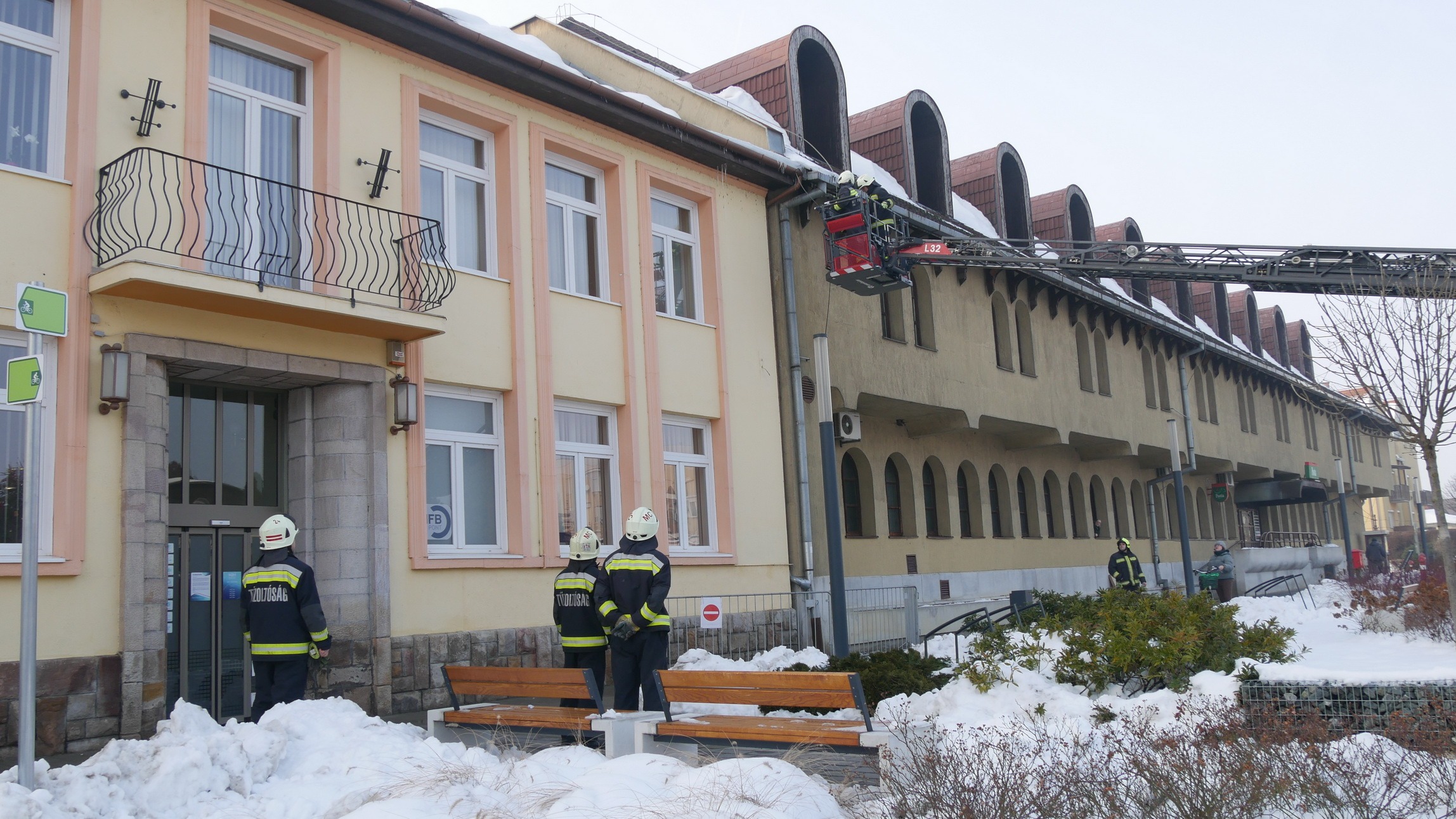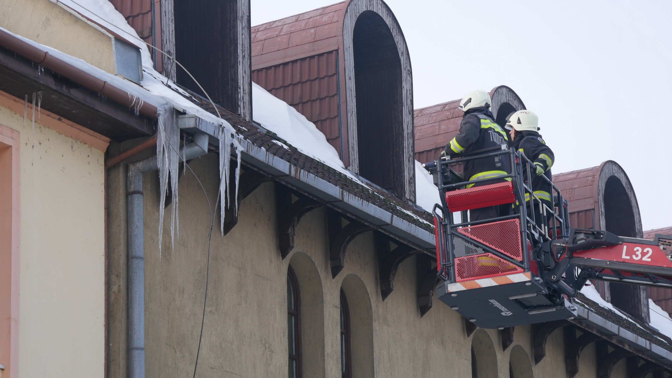 A marcali hivatásos tűzoltók gyorsan reagáltak a helyzetre: emelőkosaras jármű segítségével, módszeresen megtisztították az ereszeket a súlyos jégtömböktől.