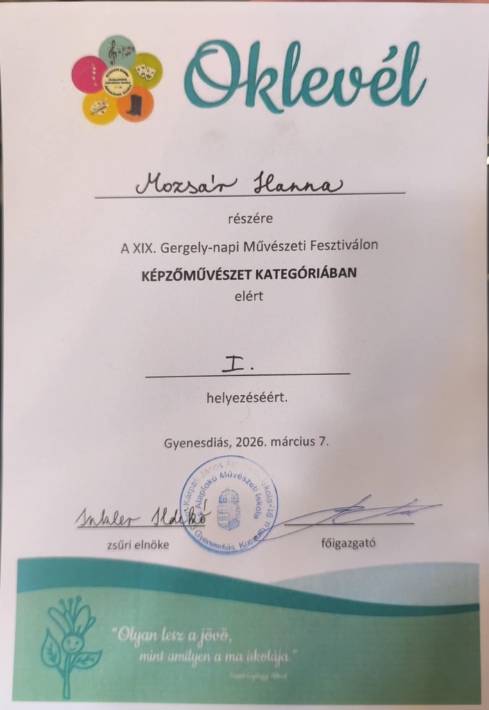 Mozsár Hanna képzőművészet kategóriában 1. helyezést ért el a XIX. Gergely-napi Művészeti Fesztiválon.